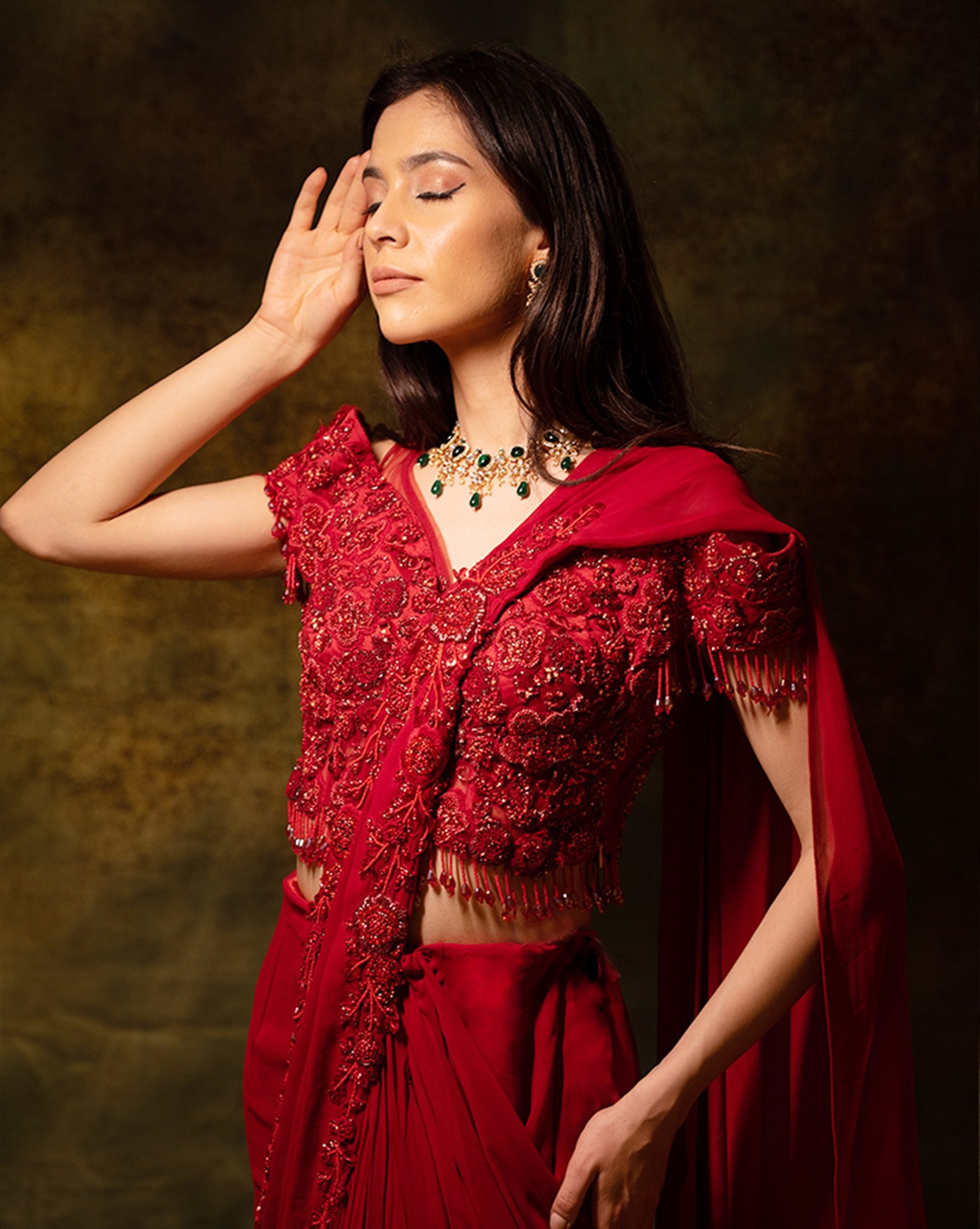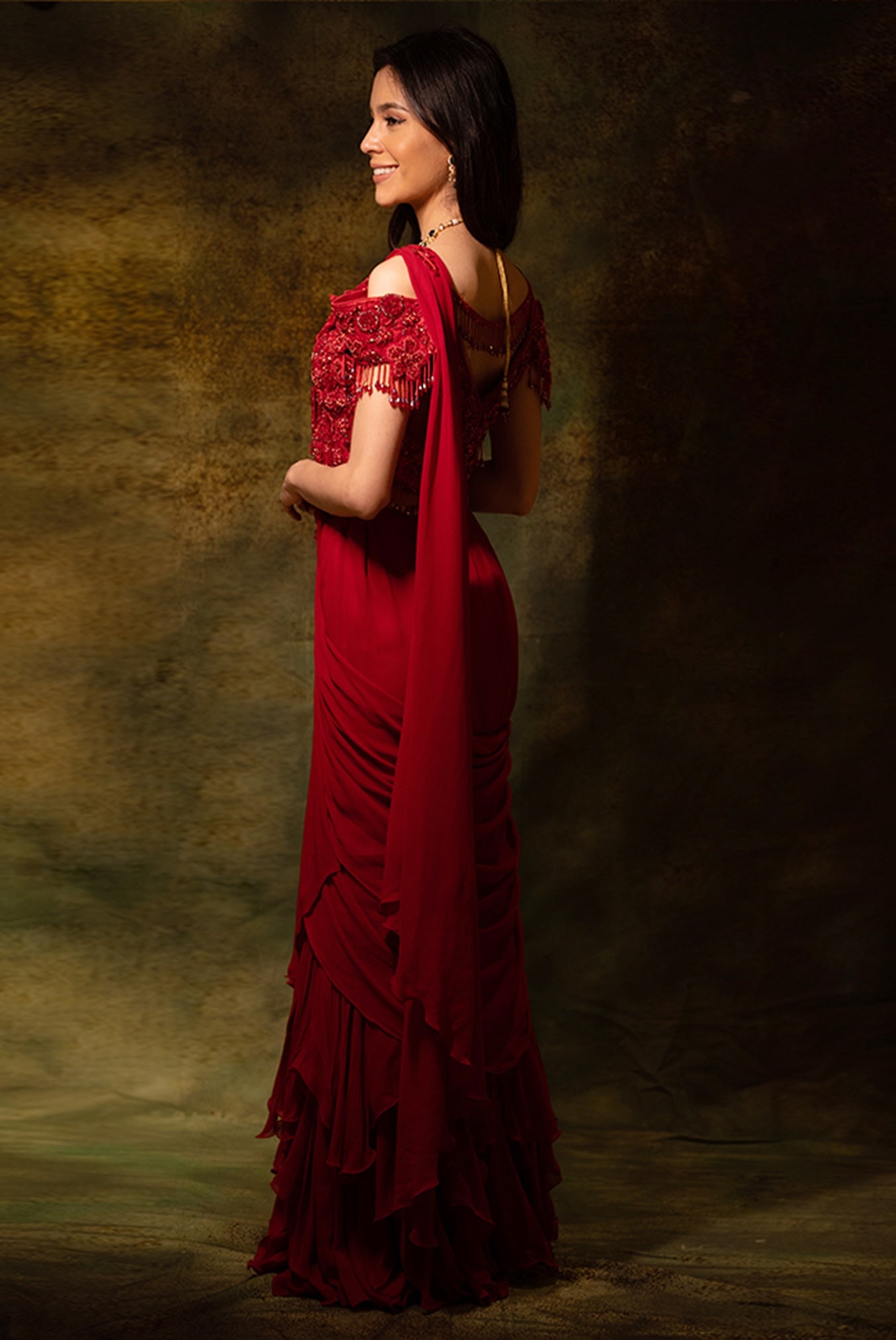 Embrace timeless elegance with this stunning outfit, where shimmering floral embroidery meets contemporary ruffles. The pre-stitched skirt saree features a beautifully embellished drape, accentuated by embroidered floral brooches at both the waistline and shoulder. Paired with a fully embroidered off-shoulder blouse, this ensemble offers a seamless blend of tradition and modern style. Perfect for any special occasion, it promises to make a memorable statement with its exquisite detailing and sophisticated design.