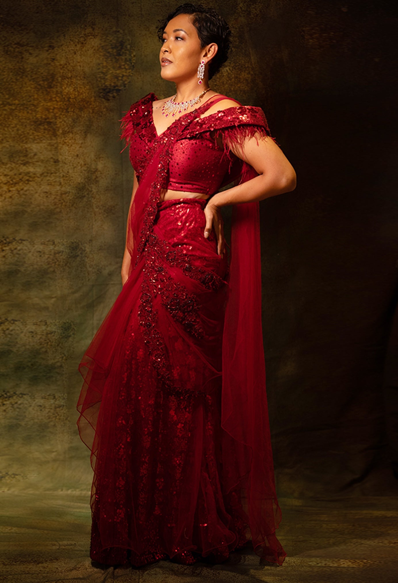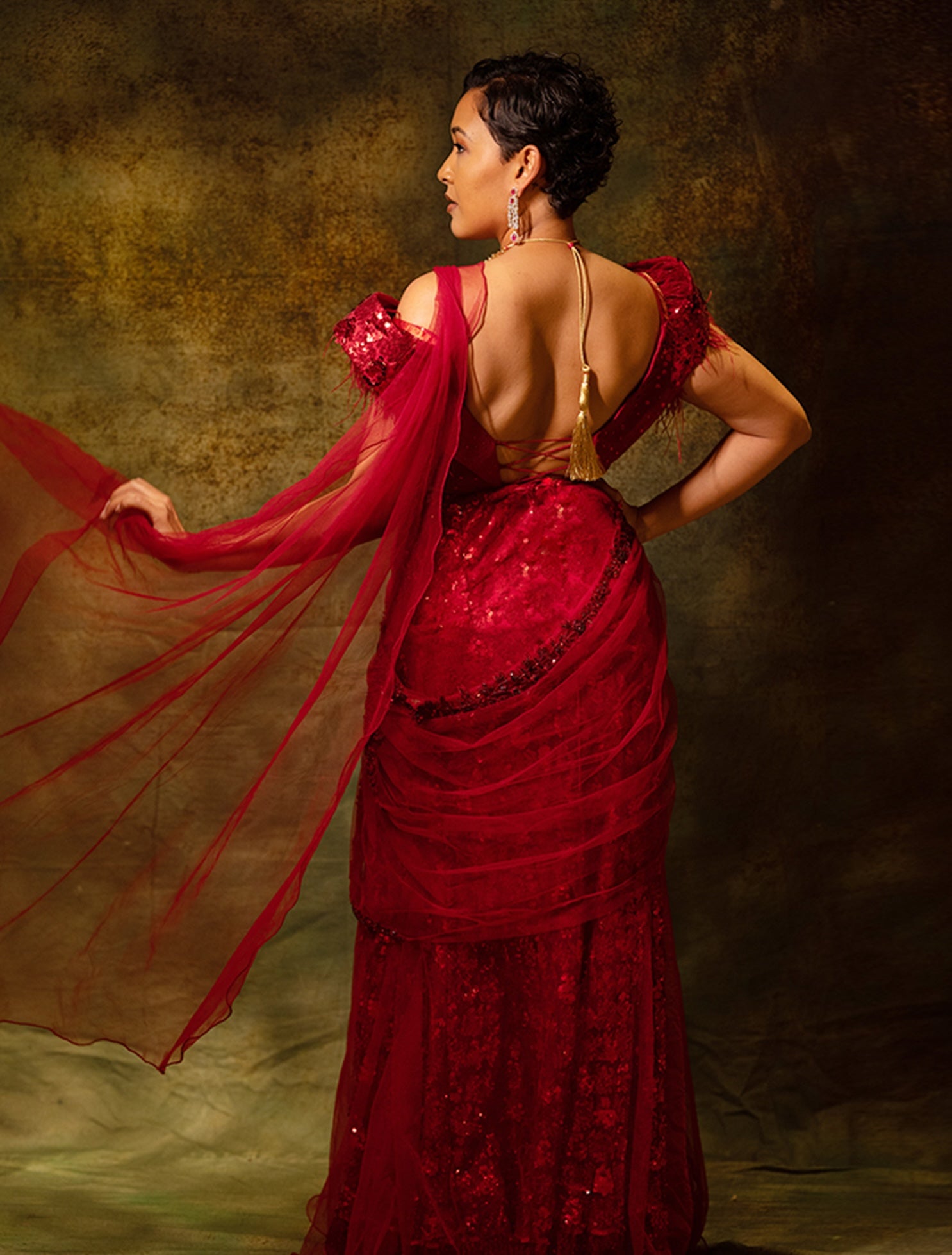 Discover elegance redefined with this stunning outfit, where shimmering sequins meet contemporary design. The skirt saree features a layered construction with a base of sequins and a delicate ruffled net overlay. The pallu drape is adorned with exquisite 3D floral hand embroidery, adding a touch of artisanal charm. Complementing this pre-stitched saree is an off-shoulder blouse, intricately embroidered to enhance the ensemble’s allure. Perfect for any special occasion, this outfit combines luxurious textures and modern detailing to create a truly unforgettable look.