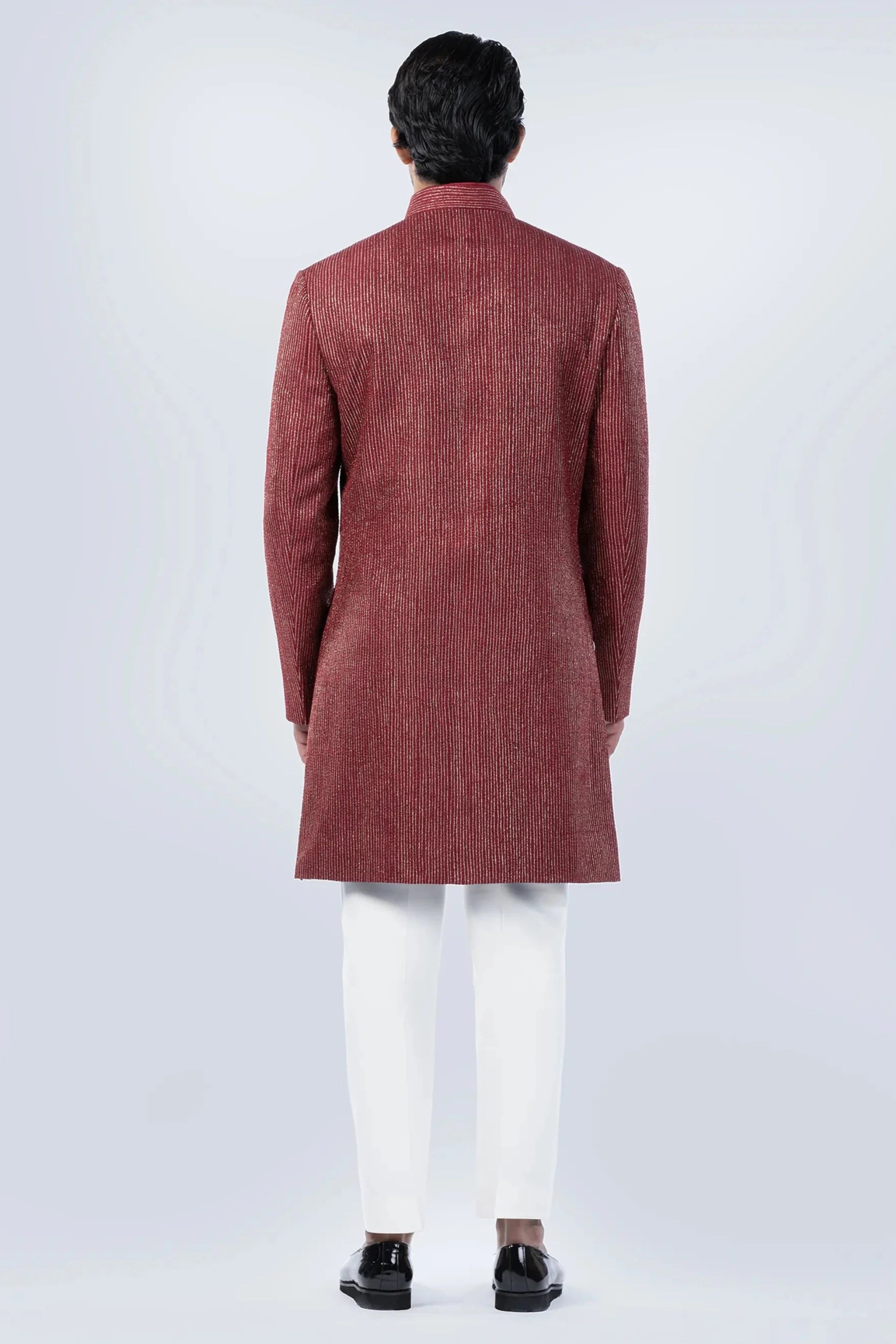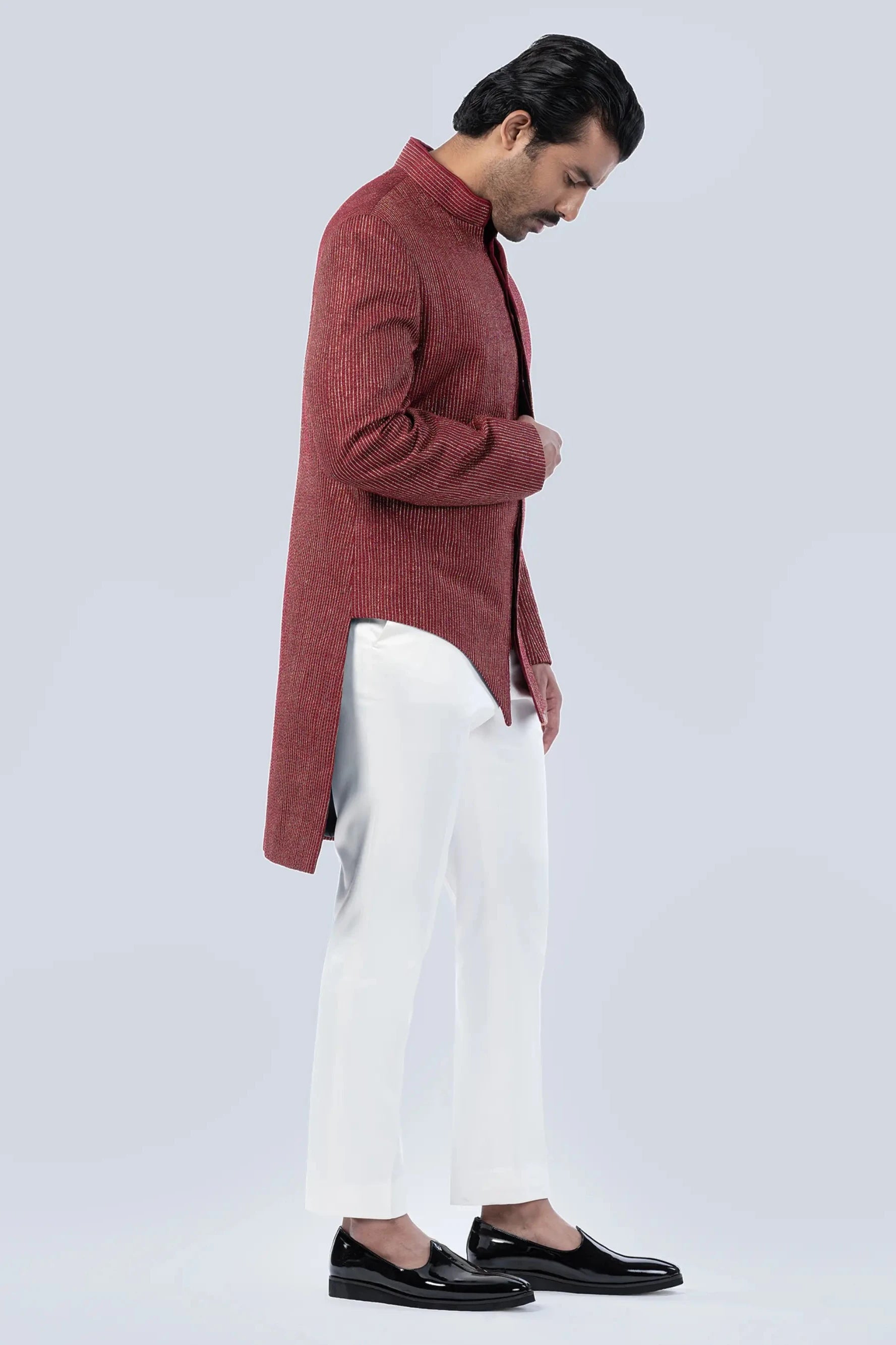 Add a touch of opulence to your wardrobe with the Maroon Gold and Badla Embroidered Fusion Jacket, a statement piece that combines intricate craftsmanship with contemporary style. The rich maroon hue creates a bold and regal look, while the luxurious gold and badla embroidery enhances the design with its stunning metallic finish. Perfect for weddings, festive occasions, or high-profile events, this fusion jacket exudes sophistication and elegance.