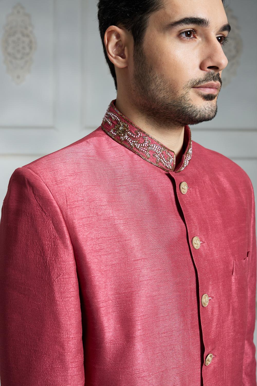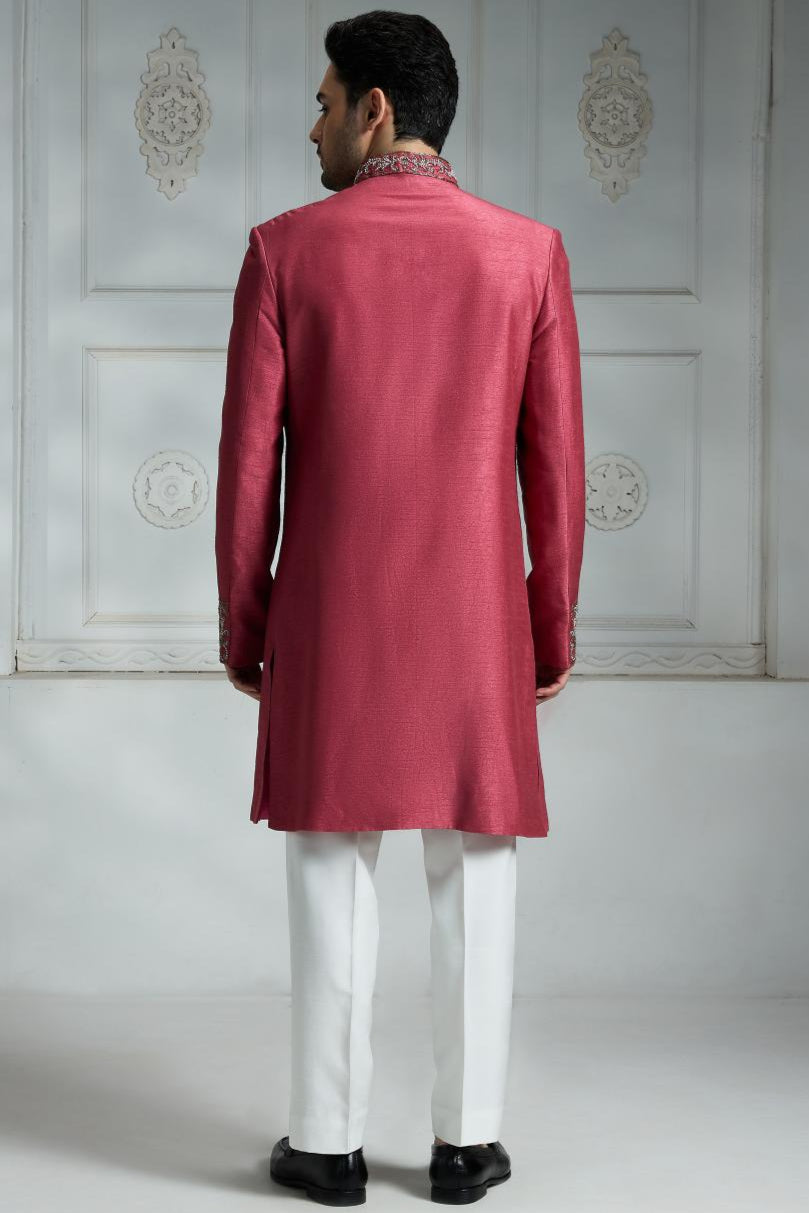 This long, solid maroon sherwani is crafted for formal occasions, showcasing a rich tone with subtle elegance. It features intricate embroidery on the collar and cuffs, paired with plain white pants for a clean, regal look. Ornate gold buttons run down the front, adding a luxurious touch. Complete the ensemble with a neatly folded pocket square in a contrasting shade to introduce a refined accent and elevate the overall appearance with sophistication and balance.
