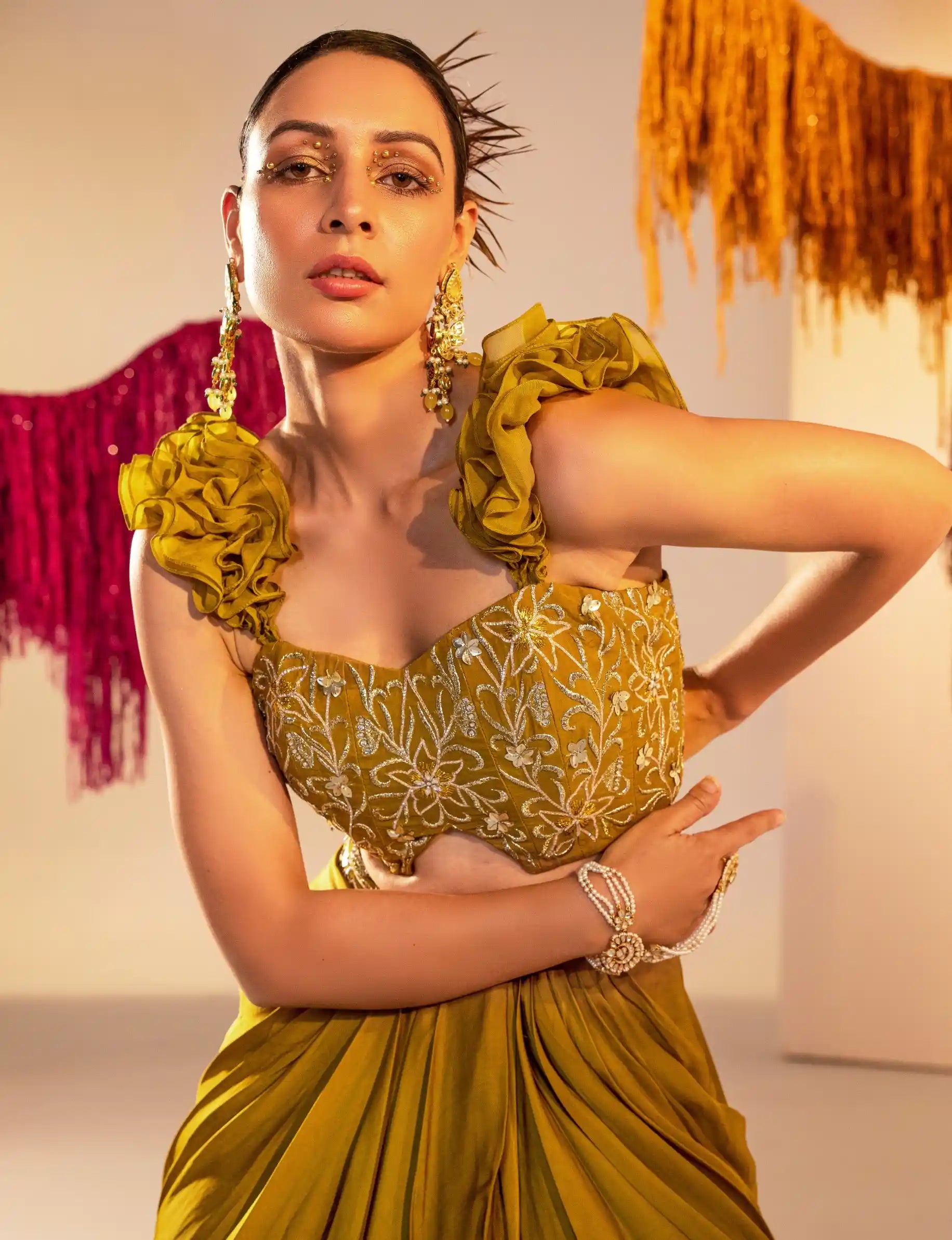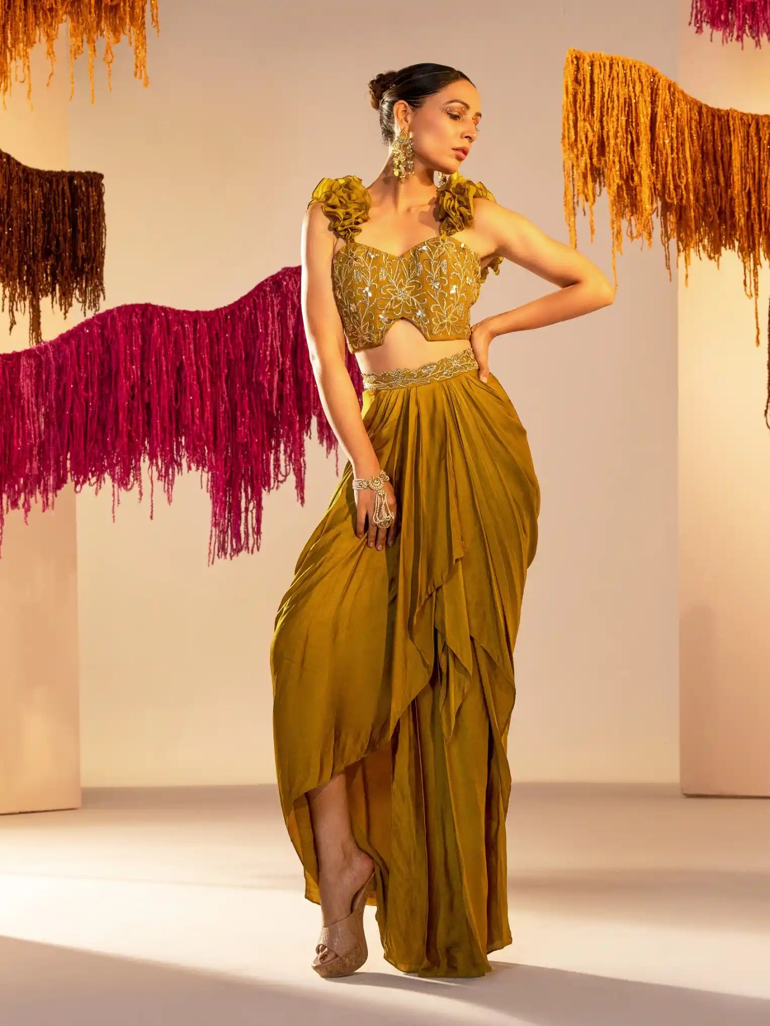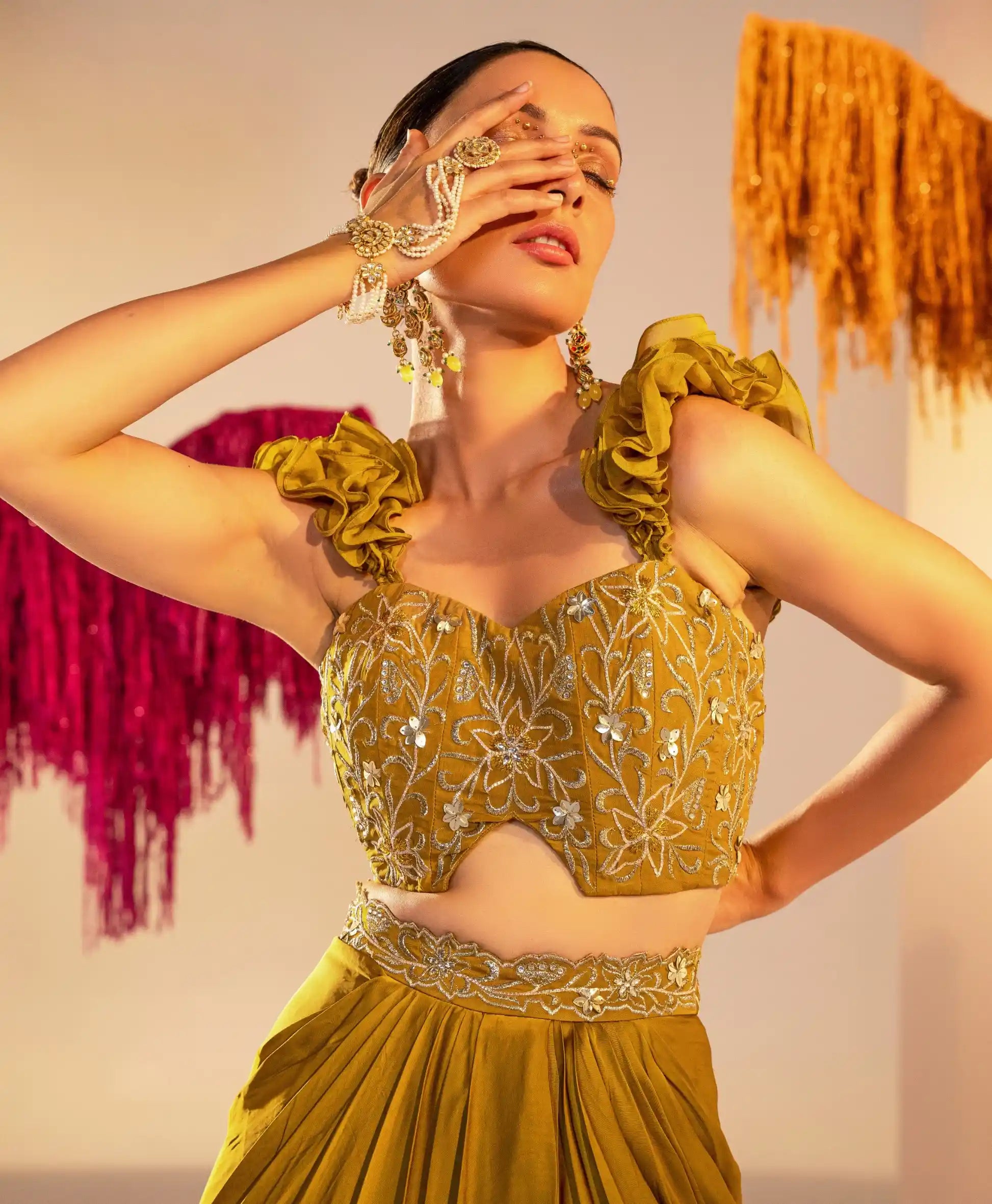 Make a statement in our mehendi green embroidered corset, adorned with ruffle straps and a beautifully draped skirt. This enchanting piece blends intricate embroidery with a rich, earthy hue, creating a look that's both elegant and unique. Perfect for celebrations or a night out, it offers a flattering fit and a touch of bohemian charm!