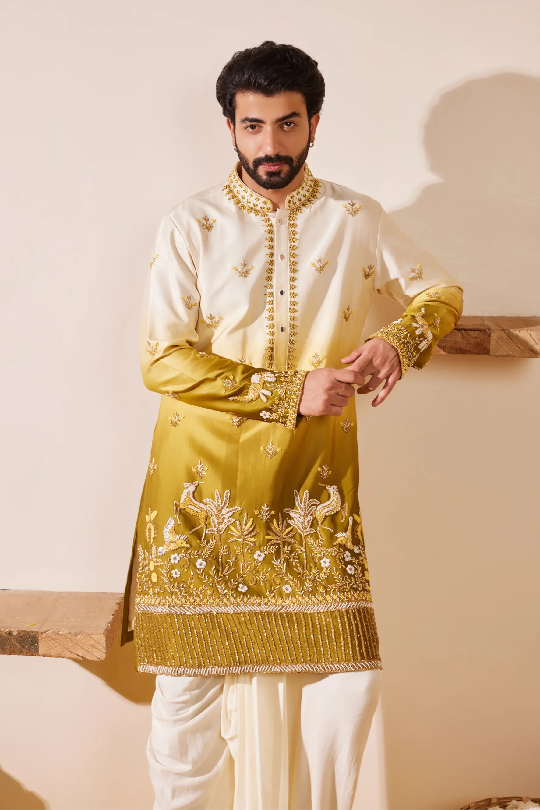The "Tasvam" kurta in rich mehendi green ombrŽ Padma silk is a statement of elegance and intricate craftsmanship. Adorned with detailed hand embroidery of glass beads, thread work, and delicate pearls, this kurta exudes refined sophistication. Its luxurious drape and artisanal details make it an ideal choice for festive and formal gatherings.
