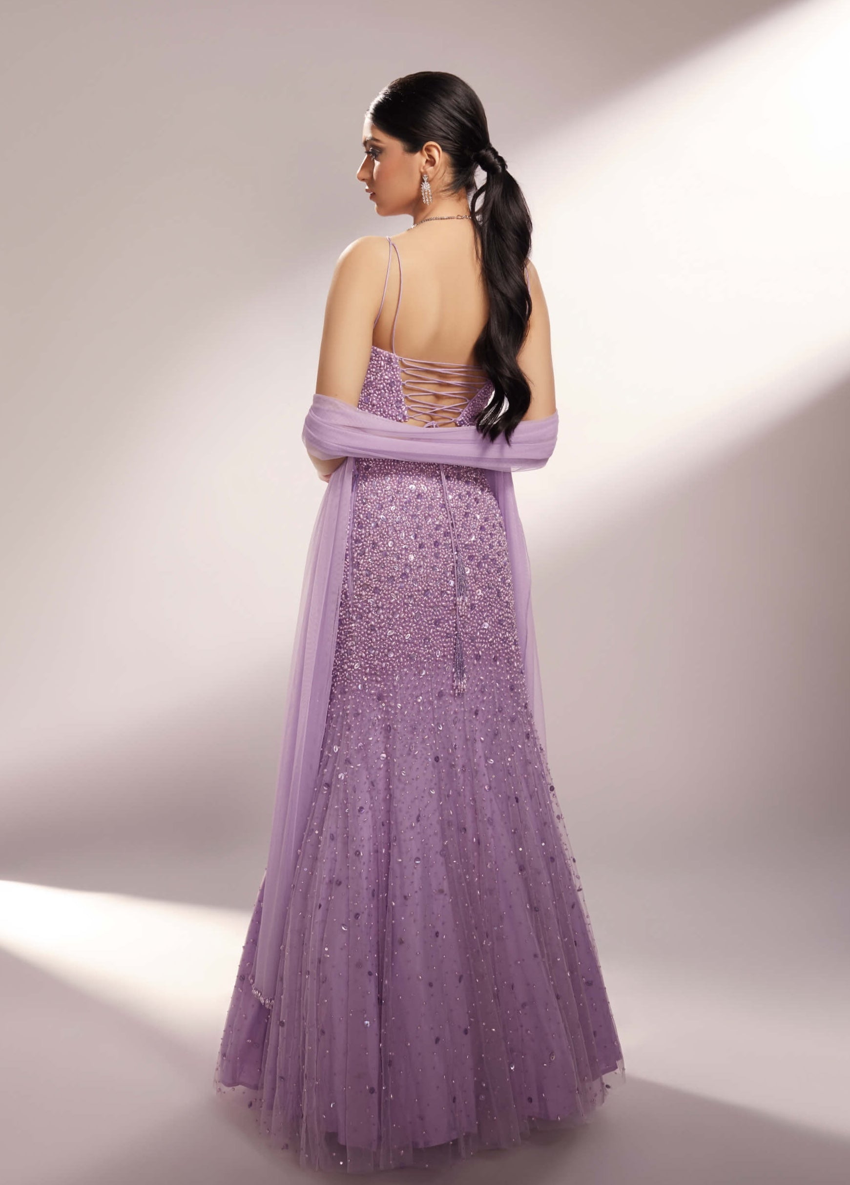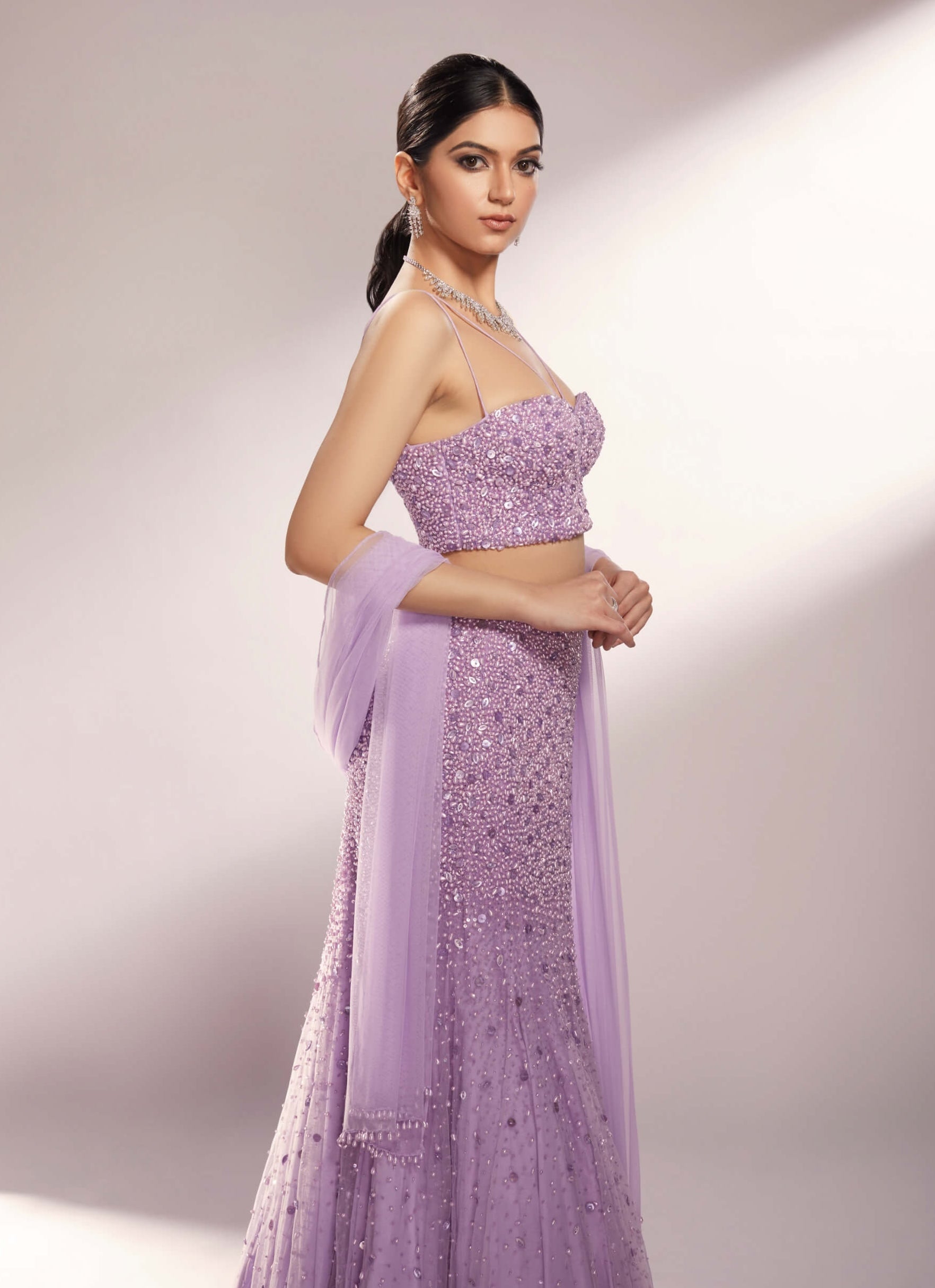 Immee youelf in opulence with our lilac fishtail lehenga and coet blouse set a stunning embodiment of refined glamour. The lehenga's fishtail silhouette enhances your natural grace while the coet blouse provides a structured yet flattering fit. Both pieces are lavishly adorned with an intricate array of pearls sparkling glass beads and iridescent mother of pearl shells creating a captivating interplay of textures and light. This ensemble promises to make a bold sophisticated statement at any grand occasion blending modern elegance with timeless beauty.