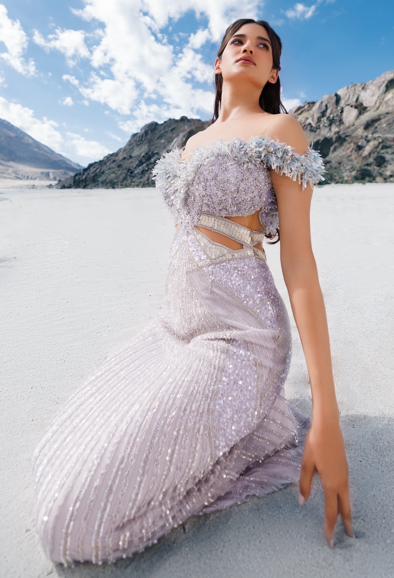 Embrace modern sophistication in our metallic lilac sheath gown, featuring an elegant off-shoulder design and striking cutout detail at the waist. This artisanally crafted gown seamlessly blends fashion with technology, offering a visionary glimpse into the future of couture. Fully hand-embroidered with the finest beads and crystals on luxurious Italian tulle, it exemplifies both innovative design and timeless elegance, making it a perfect choice for a standout look at any event.