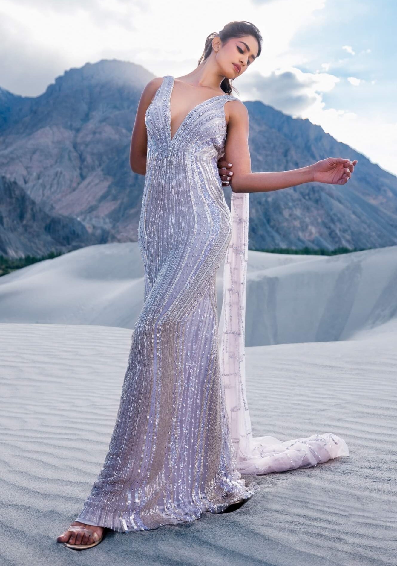 Discover cutting-edge elegance with our metallic lilac gown, showcasing a striking deep V neckline and exquisitely embroidered wing sleeves. This artisanally crafted gown seamlessly blends fashion with technology, offering a visionary glimpse into the future of couture. Fully hand-embroidered with the finest beads and crystals on luxurious Italian tulle, it combines futuristic design with timeless sophistication, making it a perfect choice for a stunning and avant-garde look.