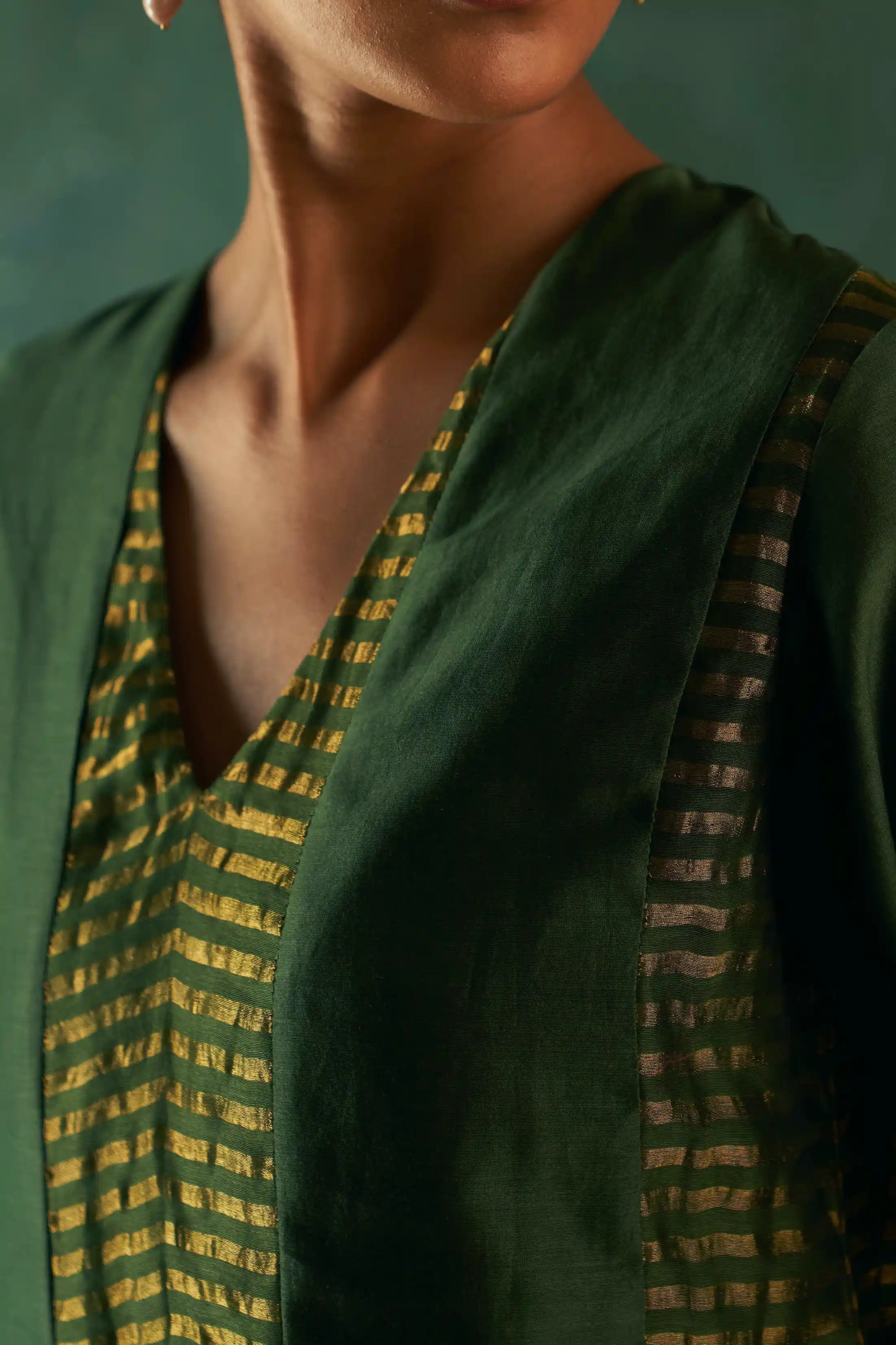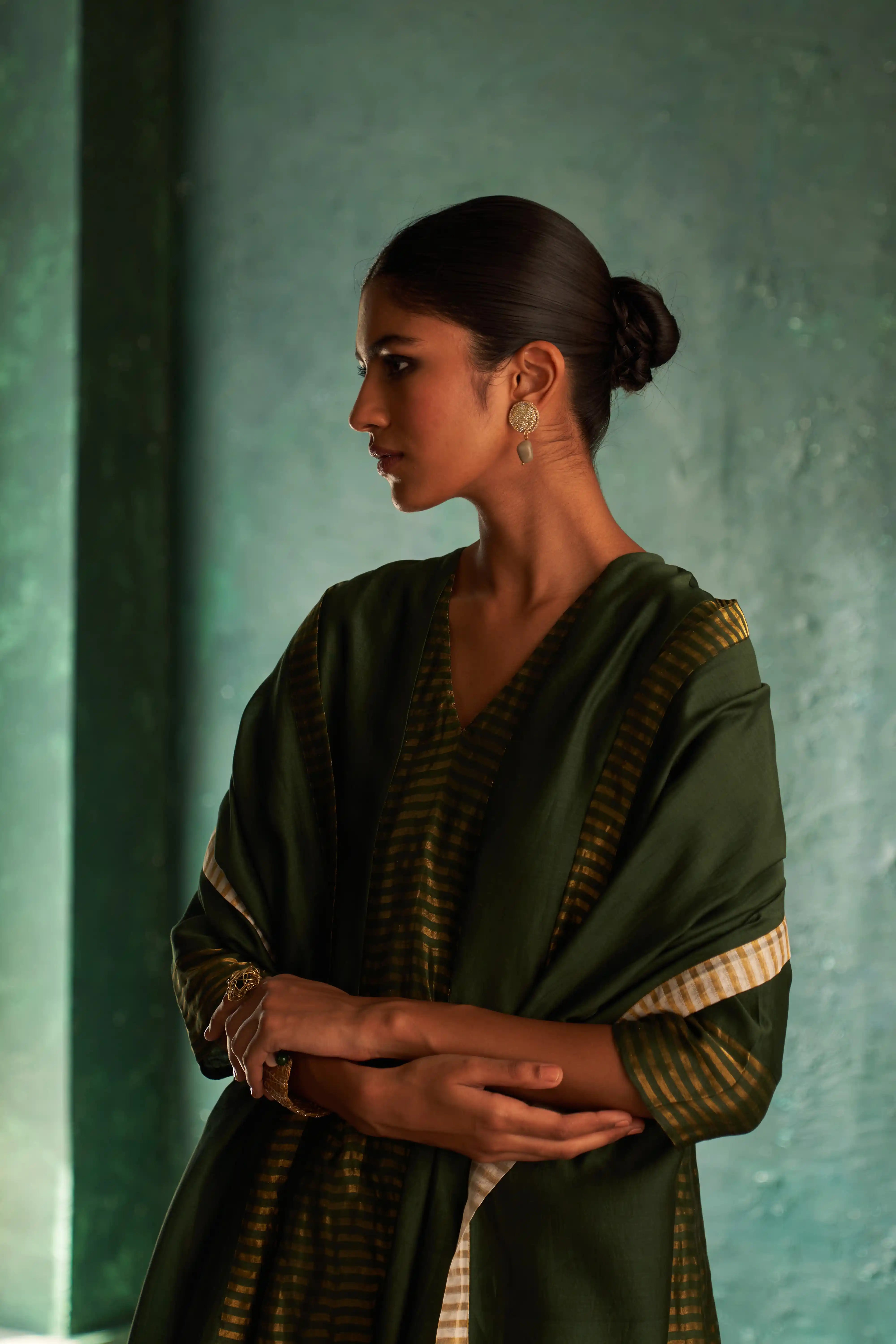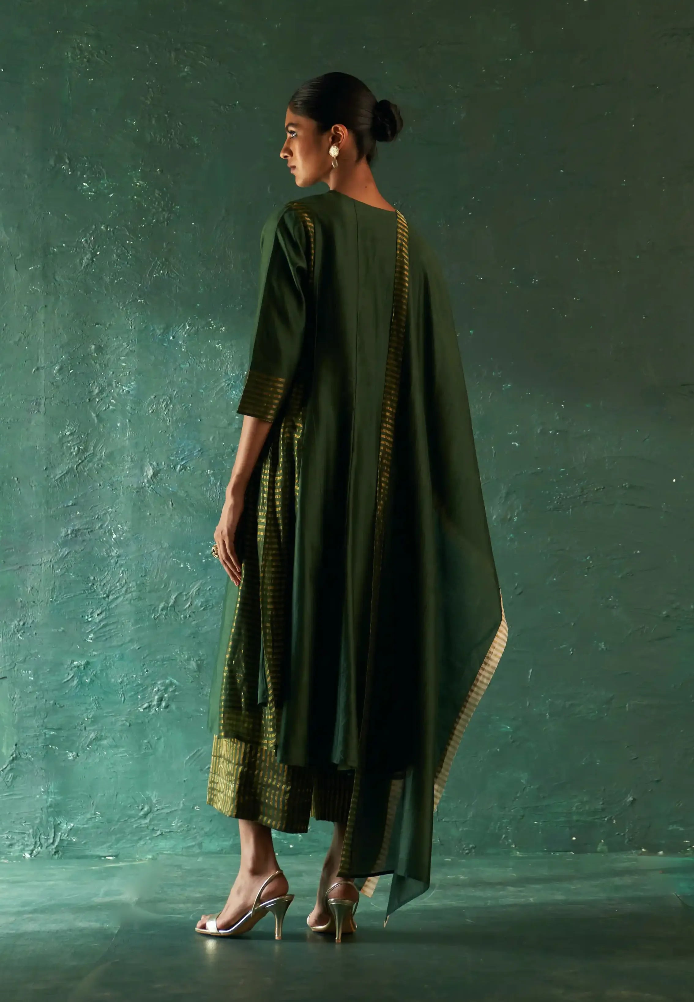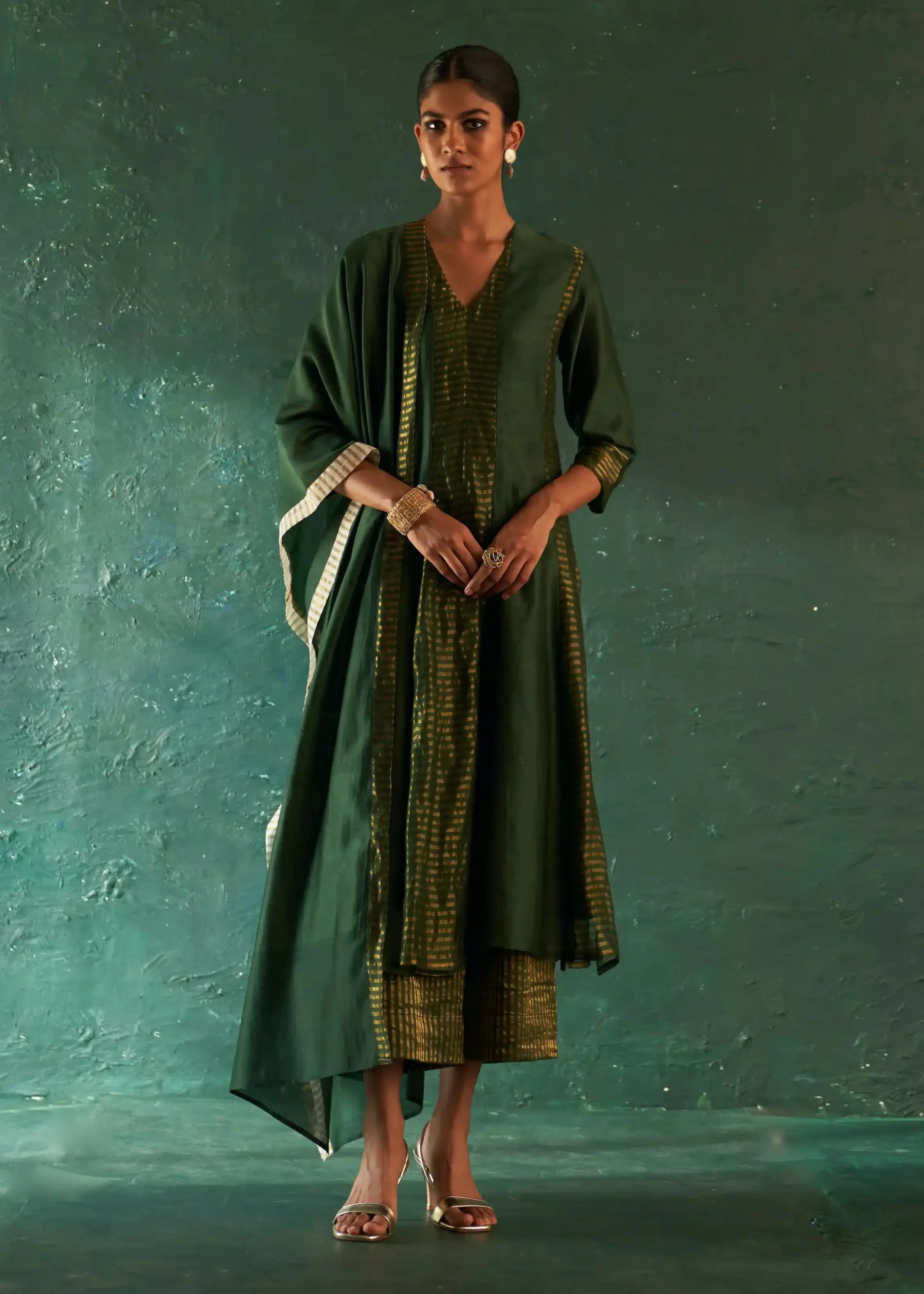 Elevate your festive wardrobe with this contemporary anarkali kurta set, artfully designed with alternating solid and striped panels in luxurious chanderi and tissue fabrics. This striking combination creates a modern yet elegant silhouette that's perfect for a dressy look. Paired with matching striped panel pants and a coordinating dupatta, this designer ensemble ensures you stand out at any celebration. Embrace style and sophistication with this must-have addition to your festive collection!