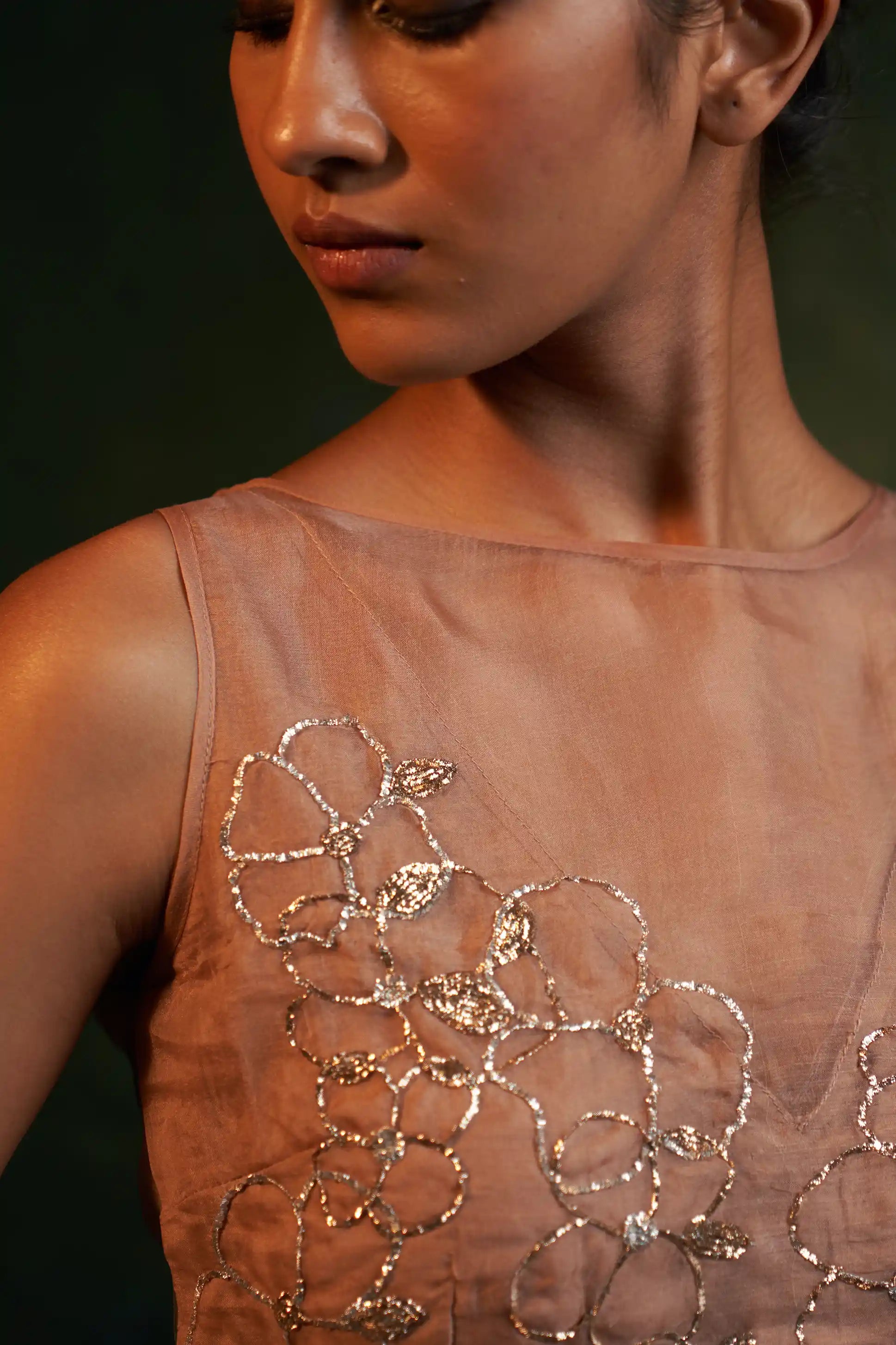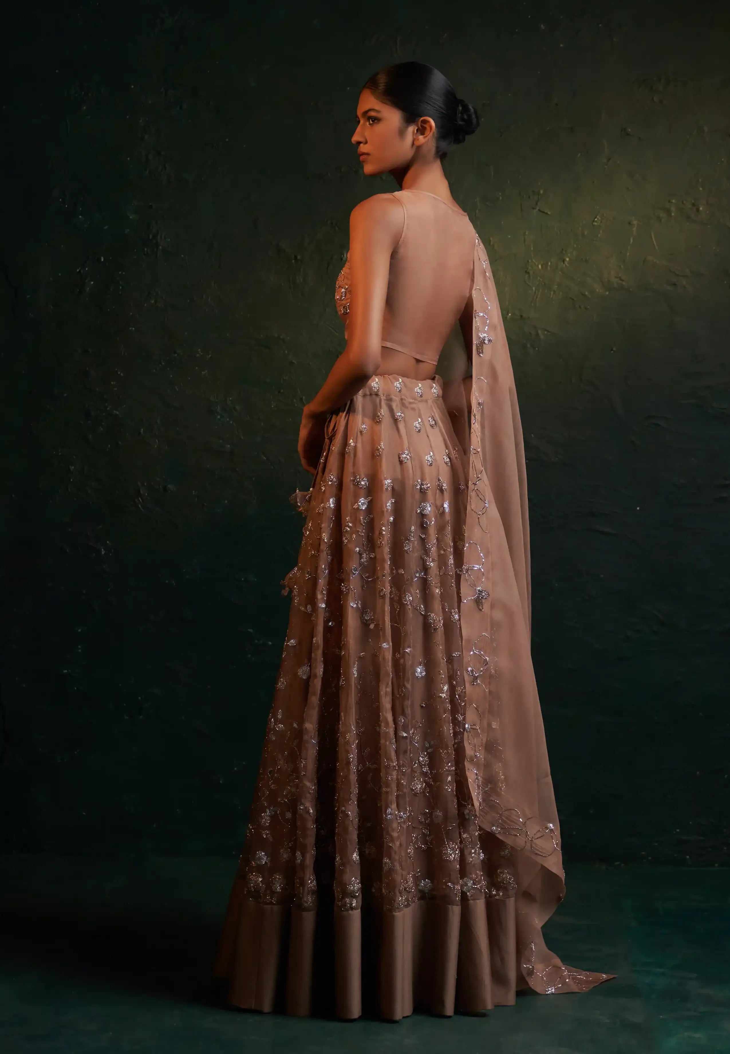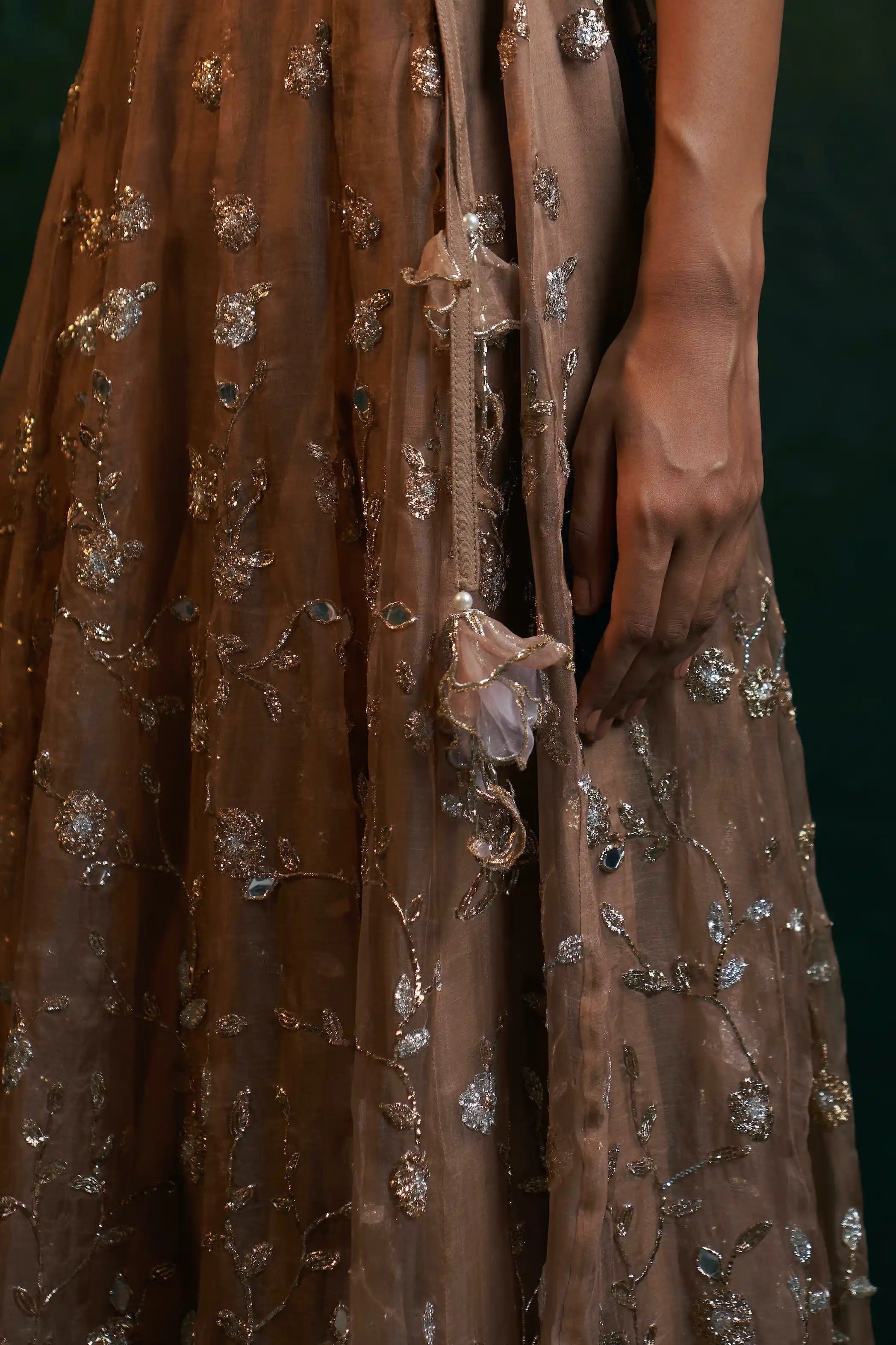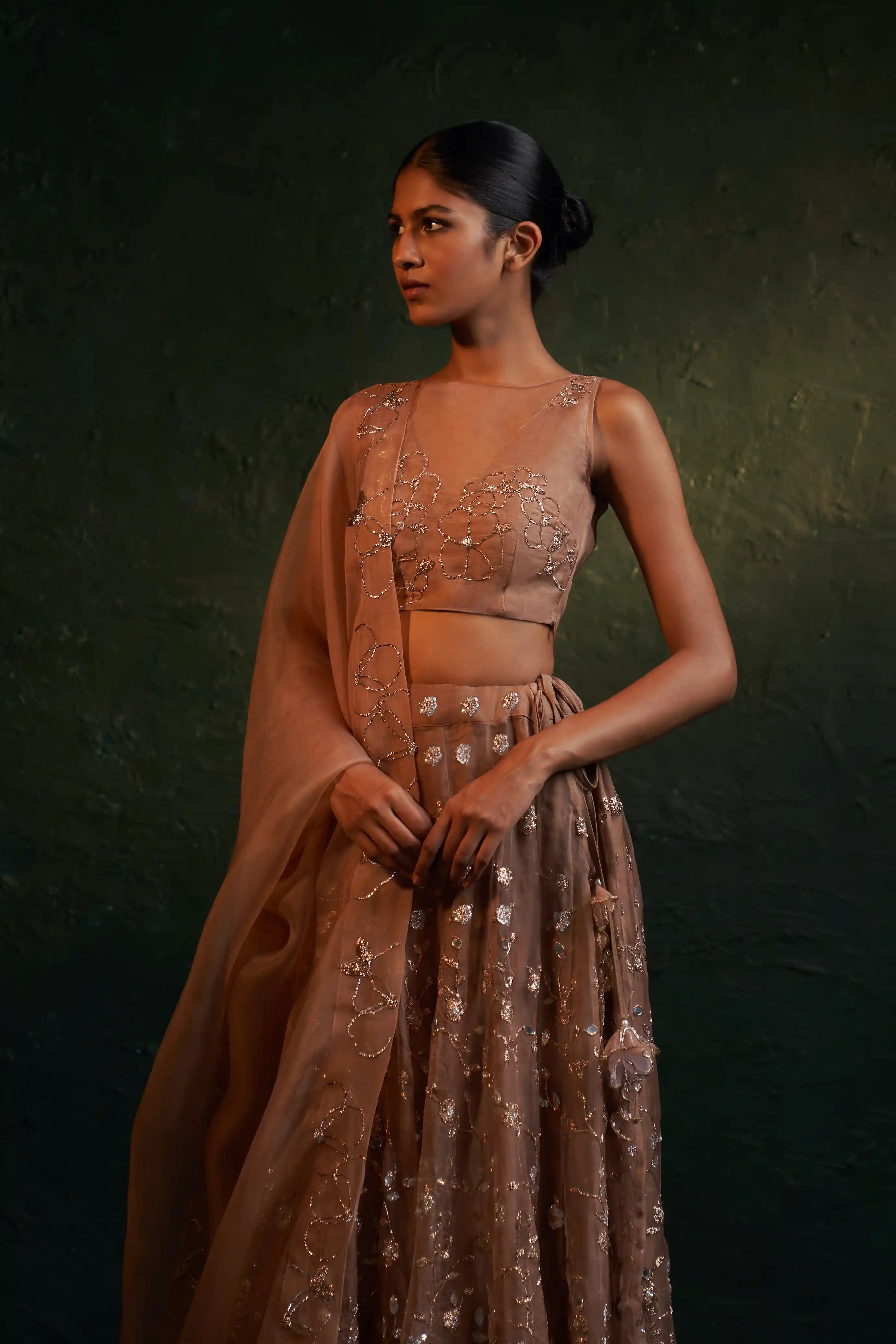 For those seeking understated glam, this fawn lehenga set is the perfect choice. Crafted from delicate organza, it features gleaming embroidery and beautifully handcrafted embroidered floral tassels. Paired with an abstract embroidered sleeveless blouse showcasing a sheer organza back, this ensemble exudes elegance. The organza dupatta, adorned with an embroidered border all around, completes the look. This muted-toned, heavily embroidered set strikes the ideal balance between minimalistic charm and striking detail, making it perfect for any elegant occasion.