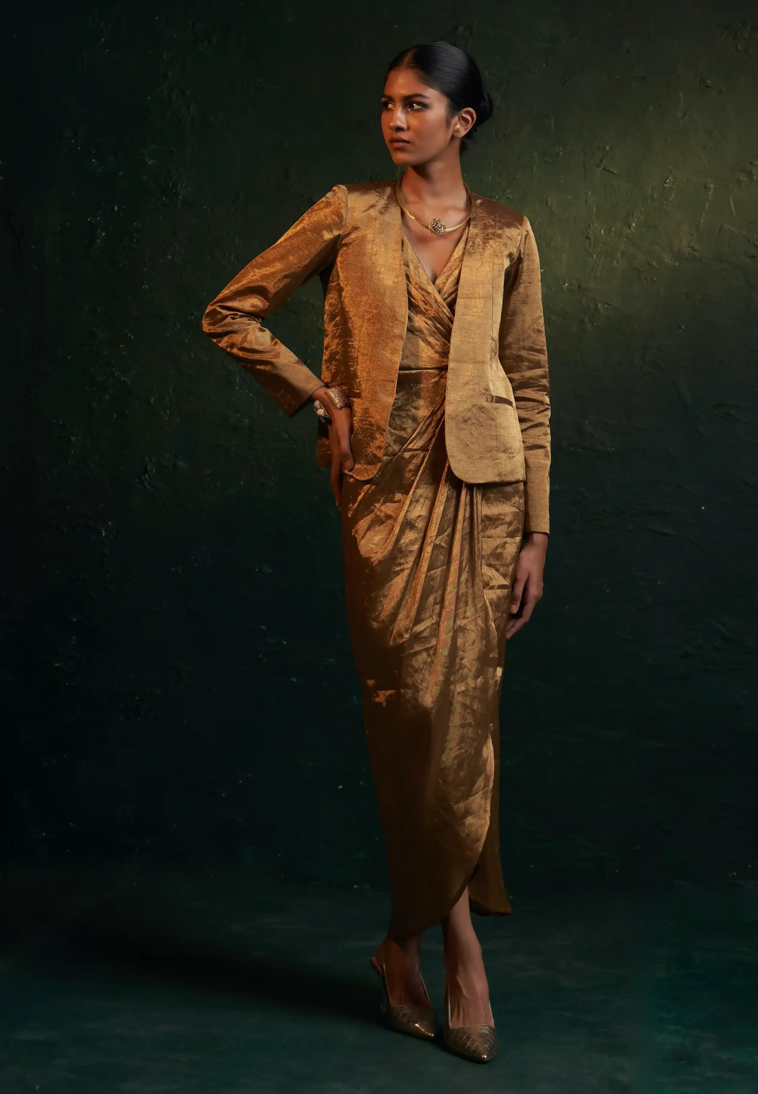 A must-have for your wardrobe, this gold tissue drape dress is both simple and chic, guaranteed to turn heads as you walk like a diva. Paired with a contemporary gold tissue blazer, it elevates your glam quotient effortlessly. The understated sophistication of this ensemble ensures enduring grace, making it a timeless addition to your collection. Perfect for cocktails or any formal event, this dress radiates elegance and style, allowing you to shine on every occasion.