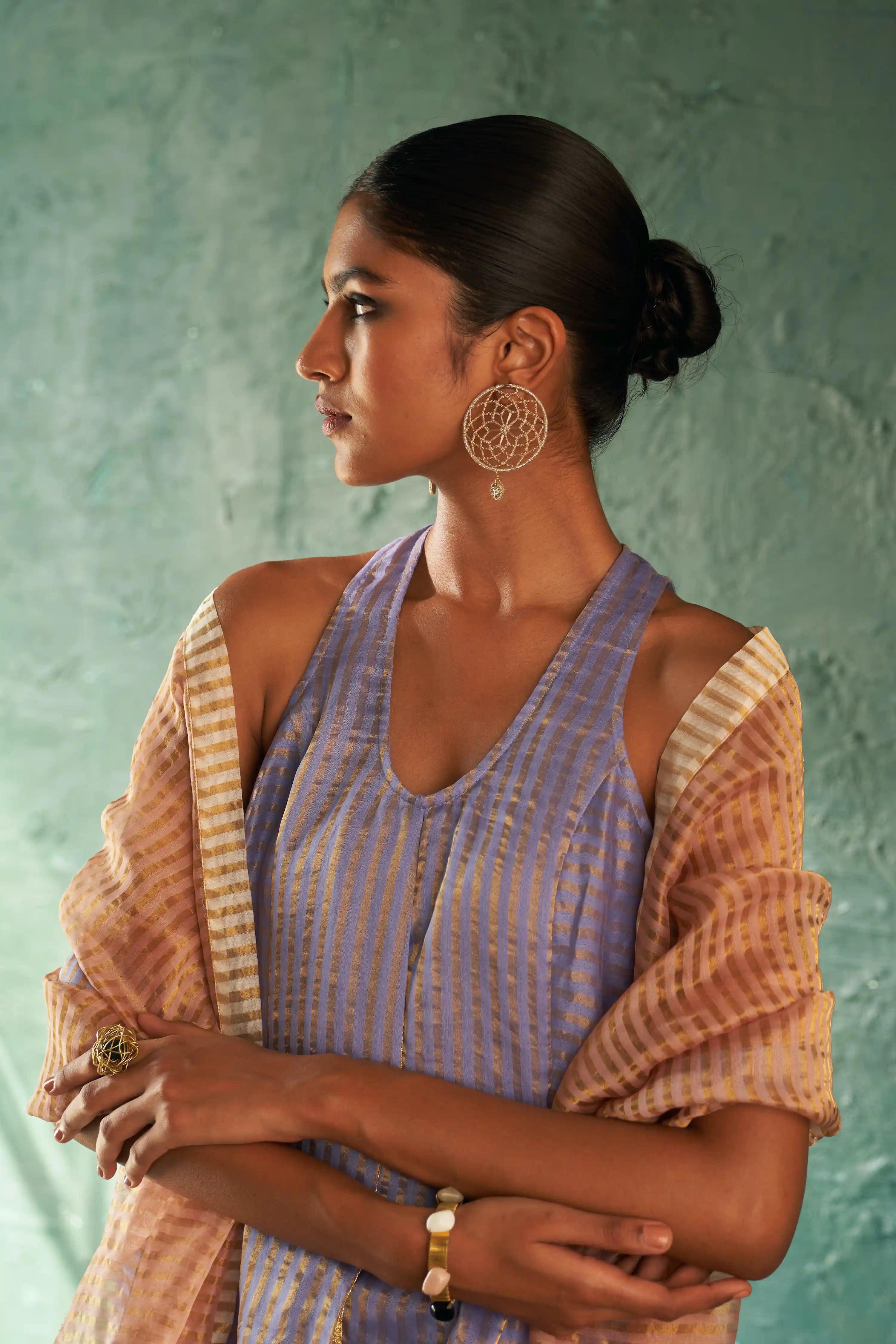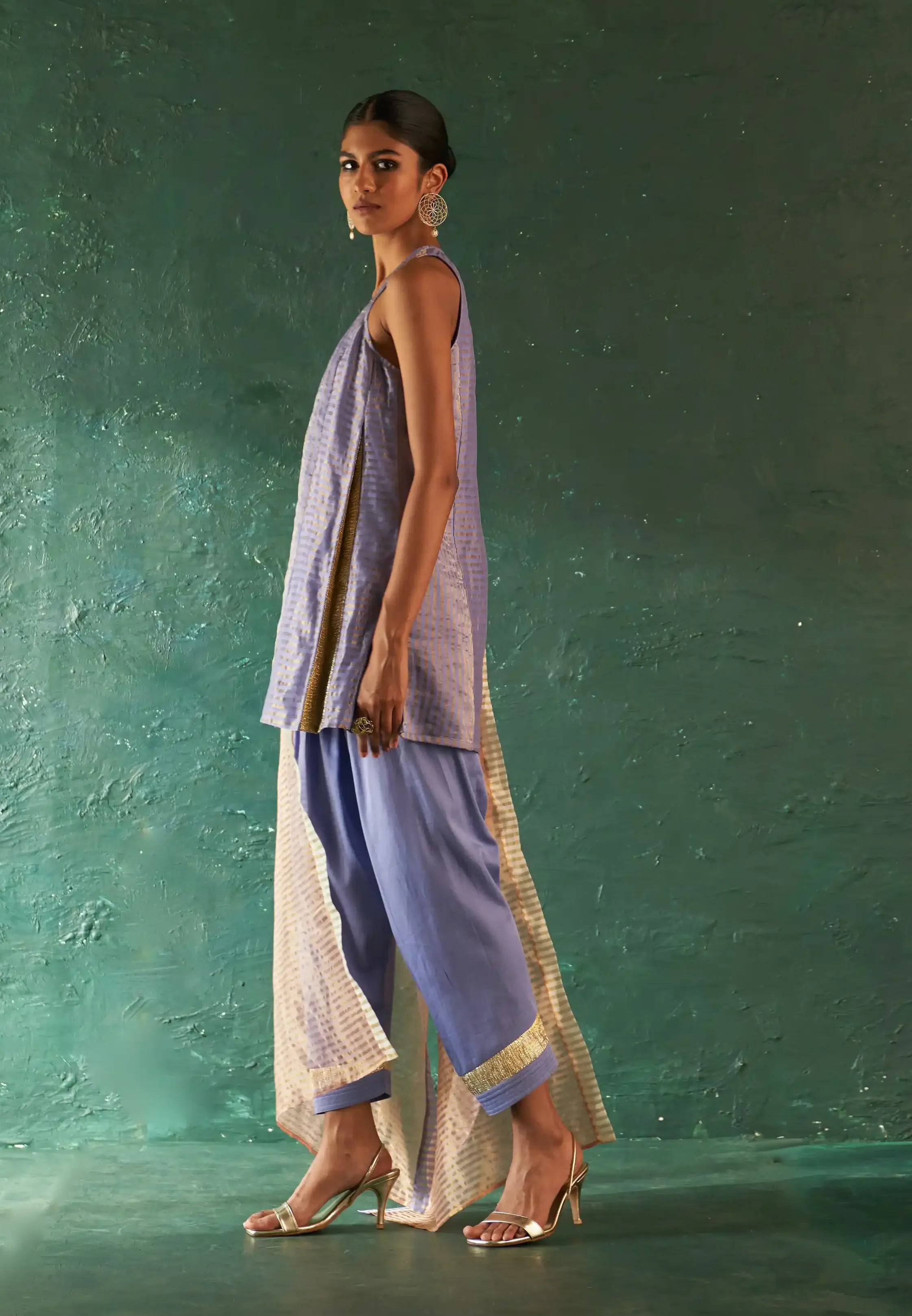 Embrace a blend of tradition and modernity with this stylish striped tissue short kurti, adorned with elegant gota panels. Paired with salwar featuring gota detailing on the hem, this ensemble is beautifully complemented by a contrasting striped tissue dupatta. The vibrant mix of patterns and textures brings together old-world charm and contemporary aesthetics, making it the perfect choice for a fun-filled festive evening. Effortlessly chic, this outfit ensures you shine with grace and style at any celebration!