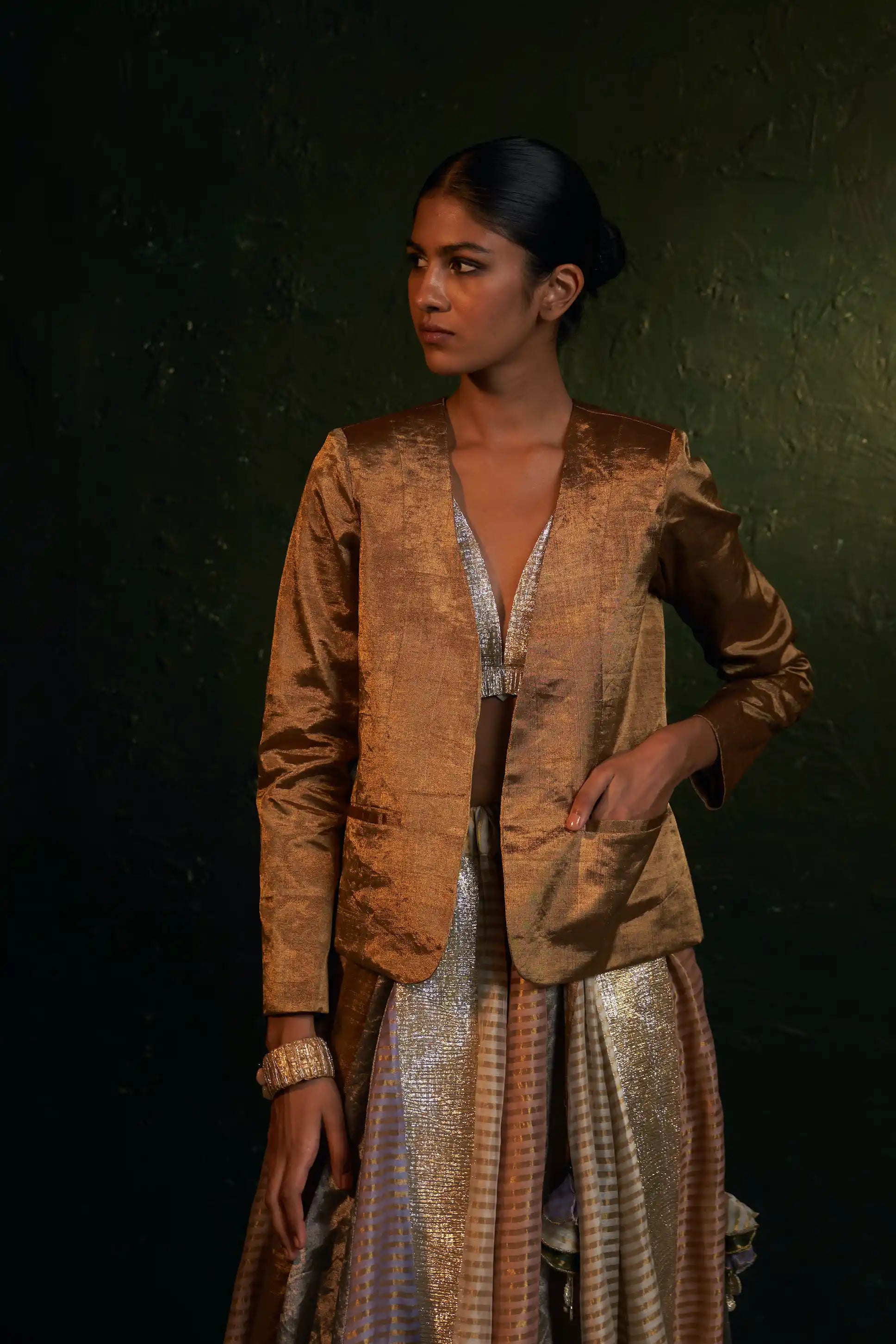 Fabric: Lehenga: silk tissue, lining: cotton, blouse: gota, blazer: silk tissue