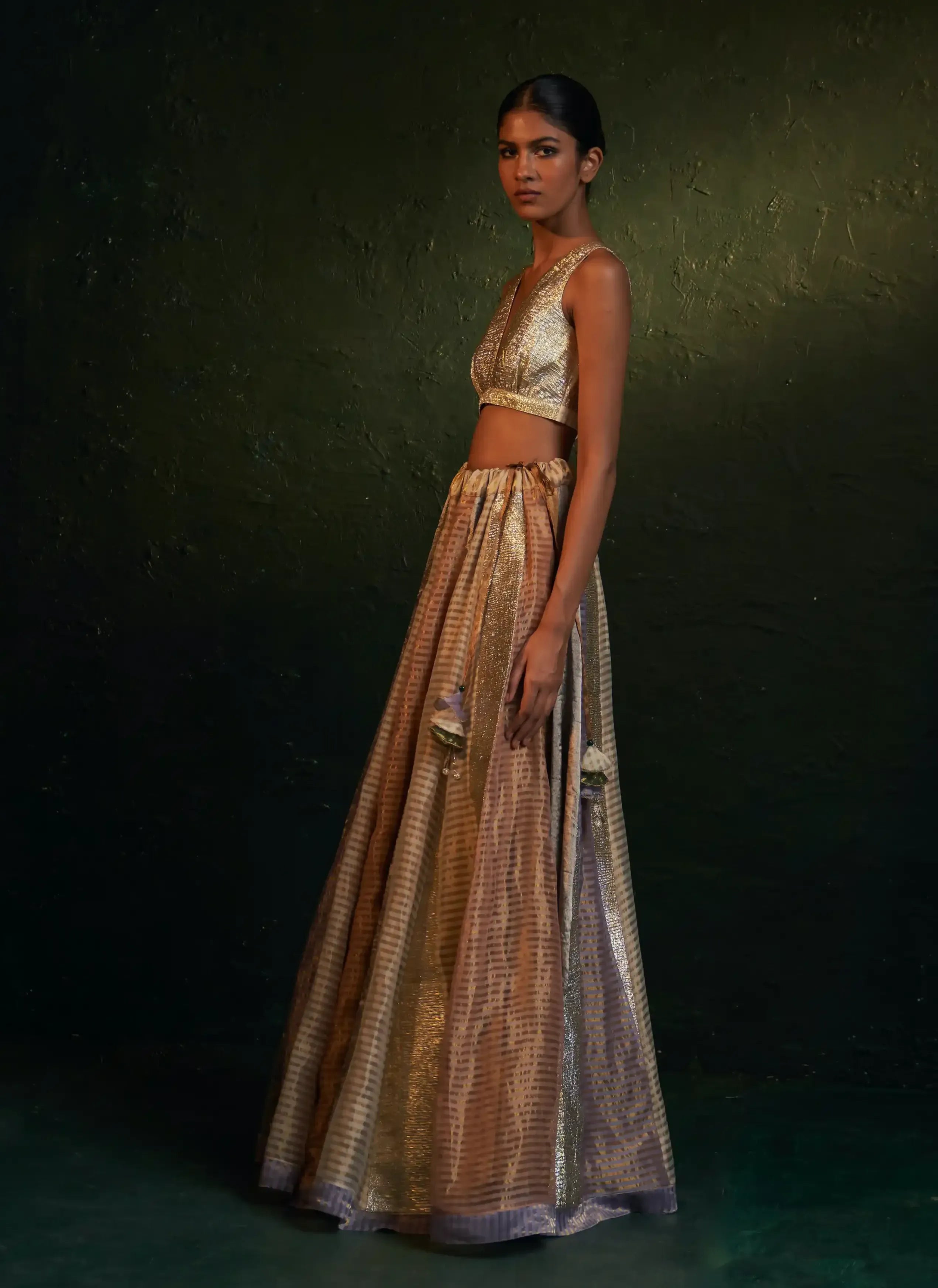 Fabric: Lehenga: silk tissue, lining: cotton, blouse: gota, dupatta: organza