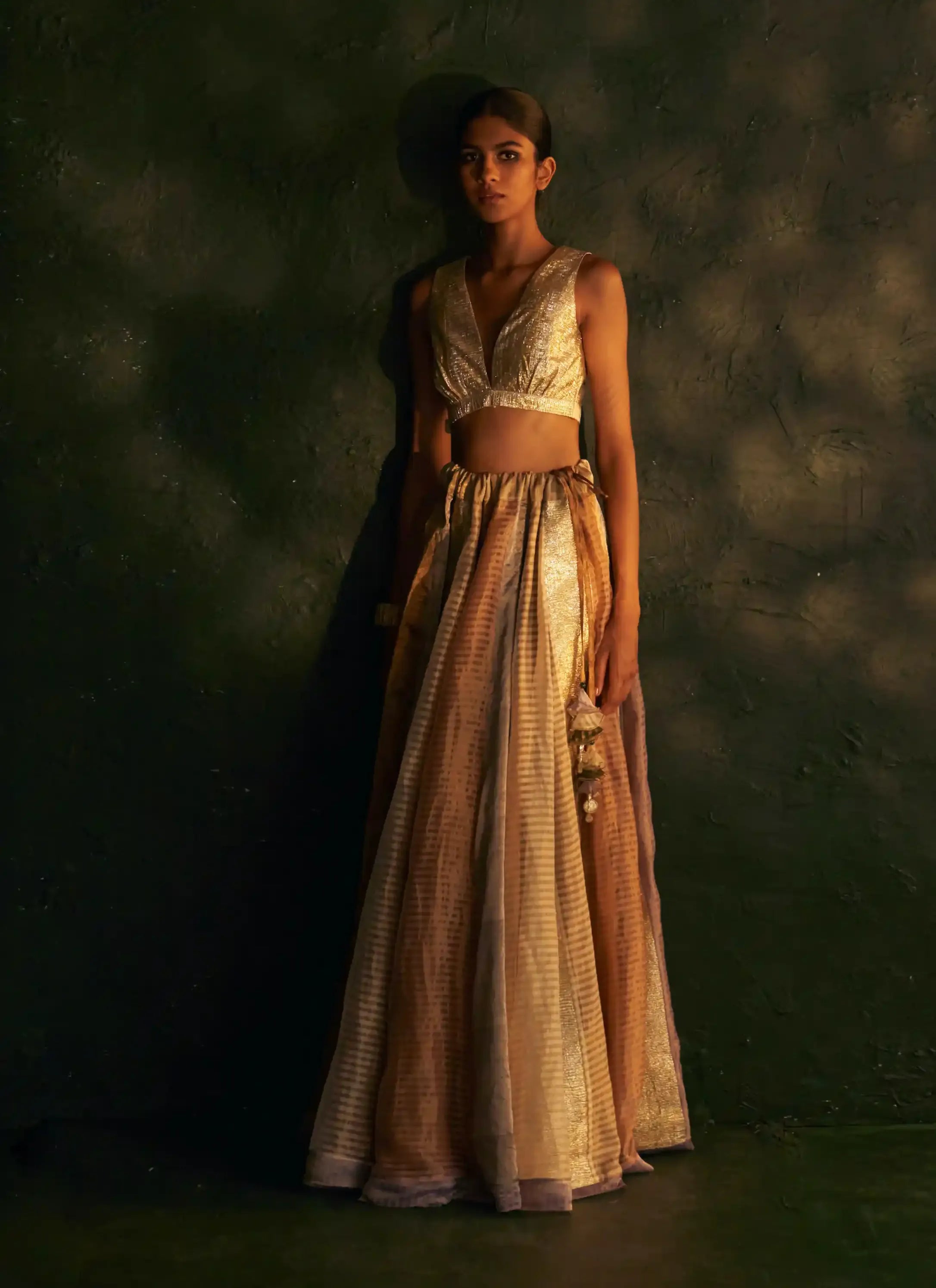 (Gota embroidery is a traditional Indian technique involving the use of metallic ribbon or zari to create intricate patterns and embellishments on fabric, often used in regal and festive attire.)