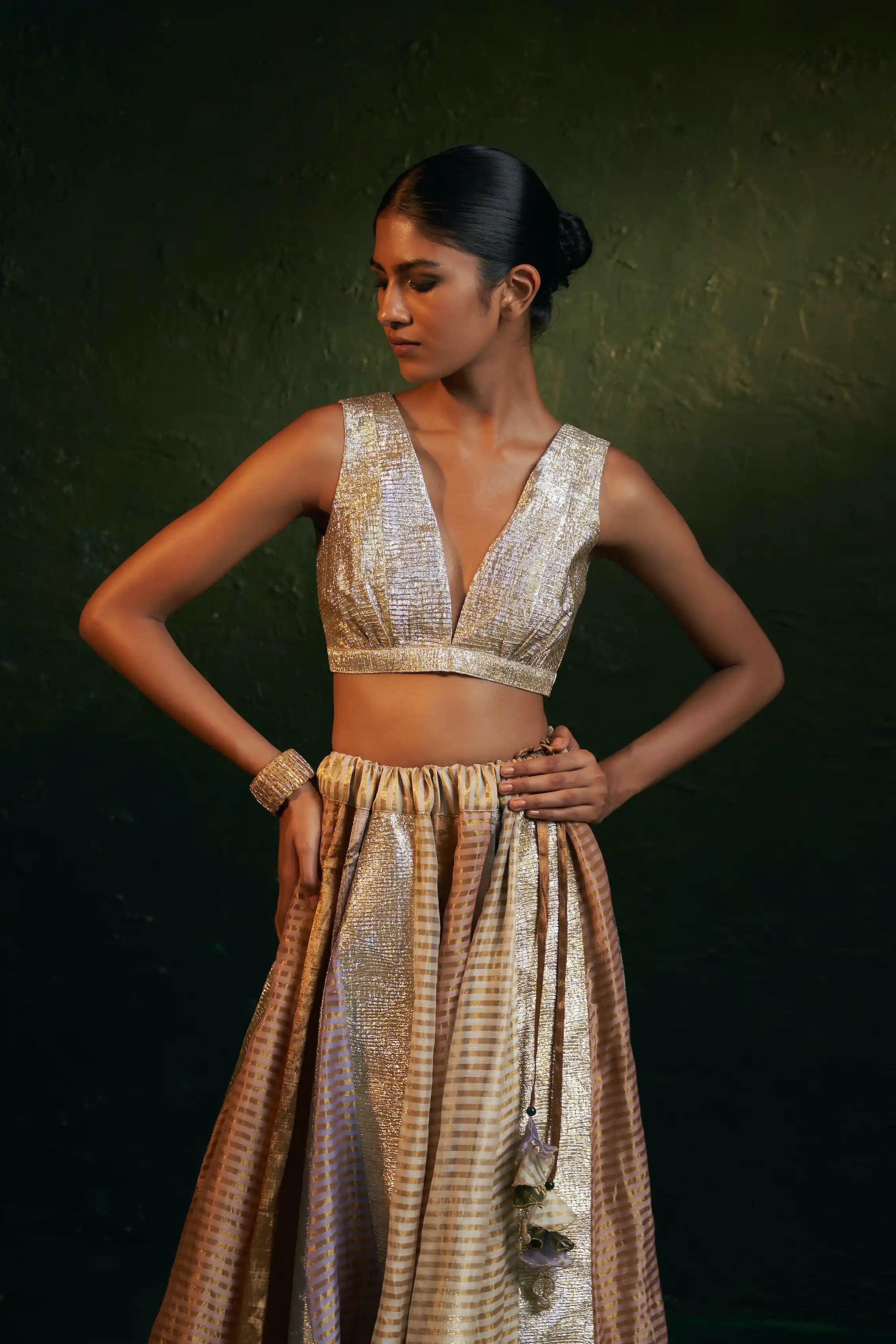 Get ready to shine in our show-stopping multi-panelled lehenga, featuring a stunning gota blouse that exudes elegance. Beautifully handcrafted tassels add a playful touch, while a dash of lavender brings a pop of color to your look. The lehenga highlights the gota blouse with a plunging neckline and an intriguing gold ring back adjuster, creating a modern yet sophisticated silhouette. Pair it with the delicate organza dupatta adorned with gota details for a truly impactful ensemble that will leave a lasting impression at any event!