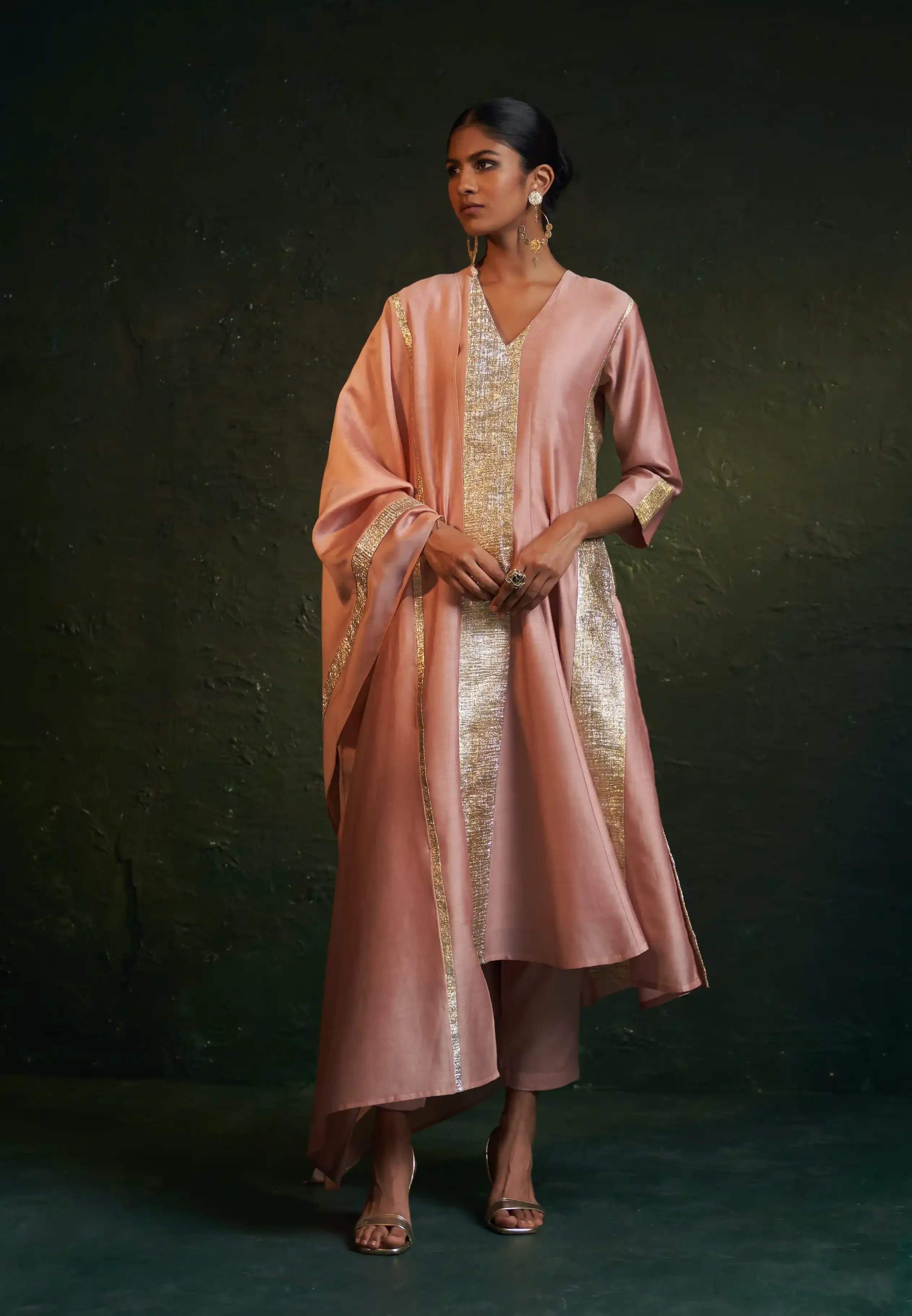 (Gota embroidery is a traditional Indian technique involving the use of metallic ribbon or zari to create intricate patterns and embellishments on fabric, often used in regal and festive attire.)