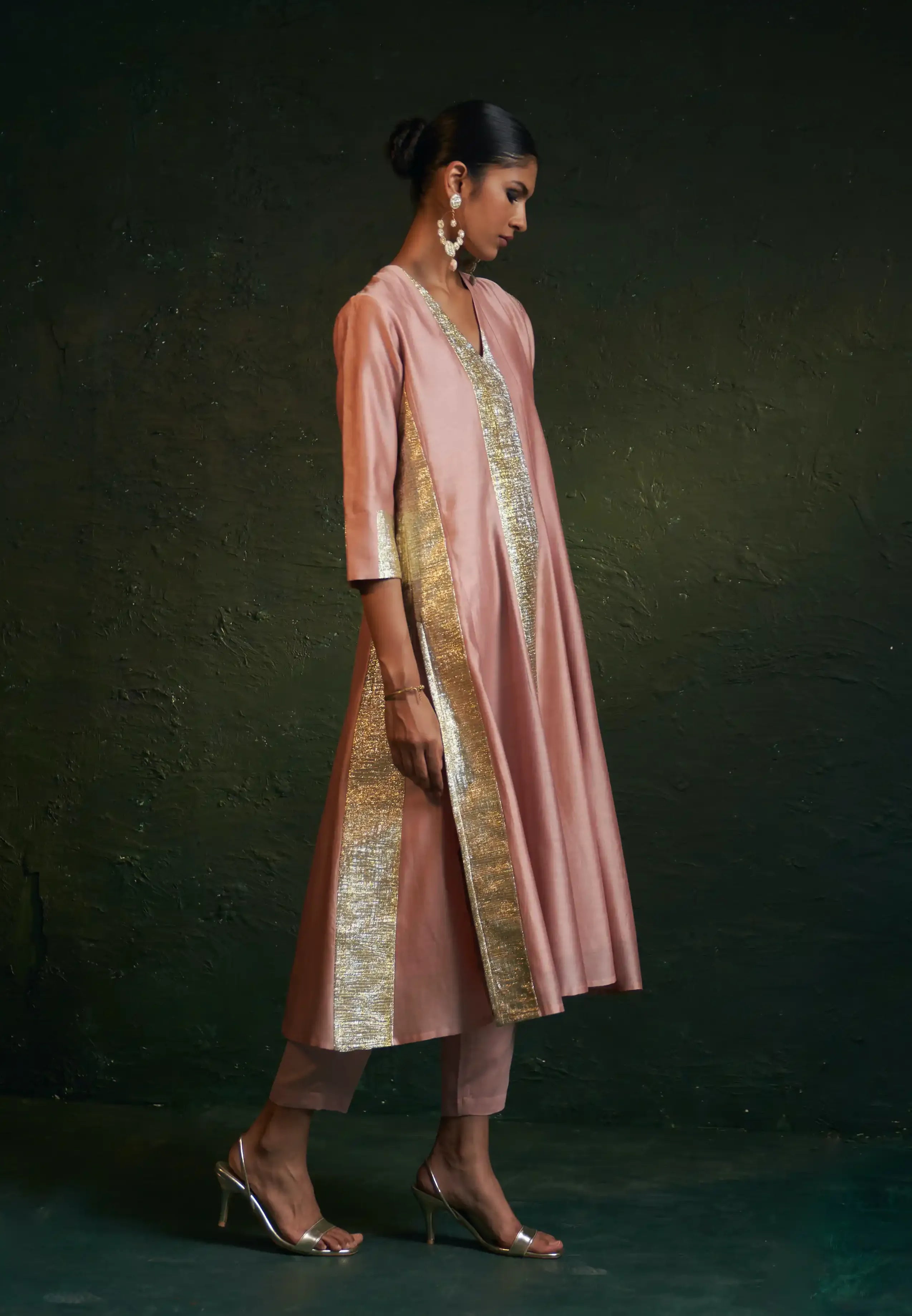 Embrace elegance with this stunning chanderi kurta set, designed in a flairy anarkali silhouette that flatters every figure. Adorned with beautiful crinkled gota panels, this ensemble exudes a dressy charm that's perfect for festive occasions. Paired with matching pants and a gota-embellished dupatta, this designer set effortlessly combines sophistication and grace. Make a statement at your celebrations with this exquisite piece that beautifully captures the spirit of festive fashion.
