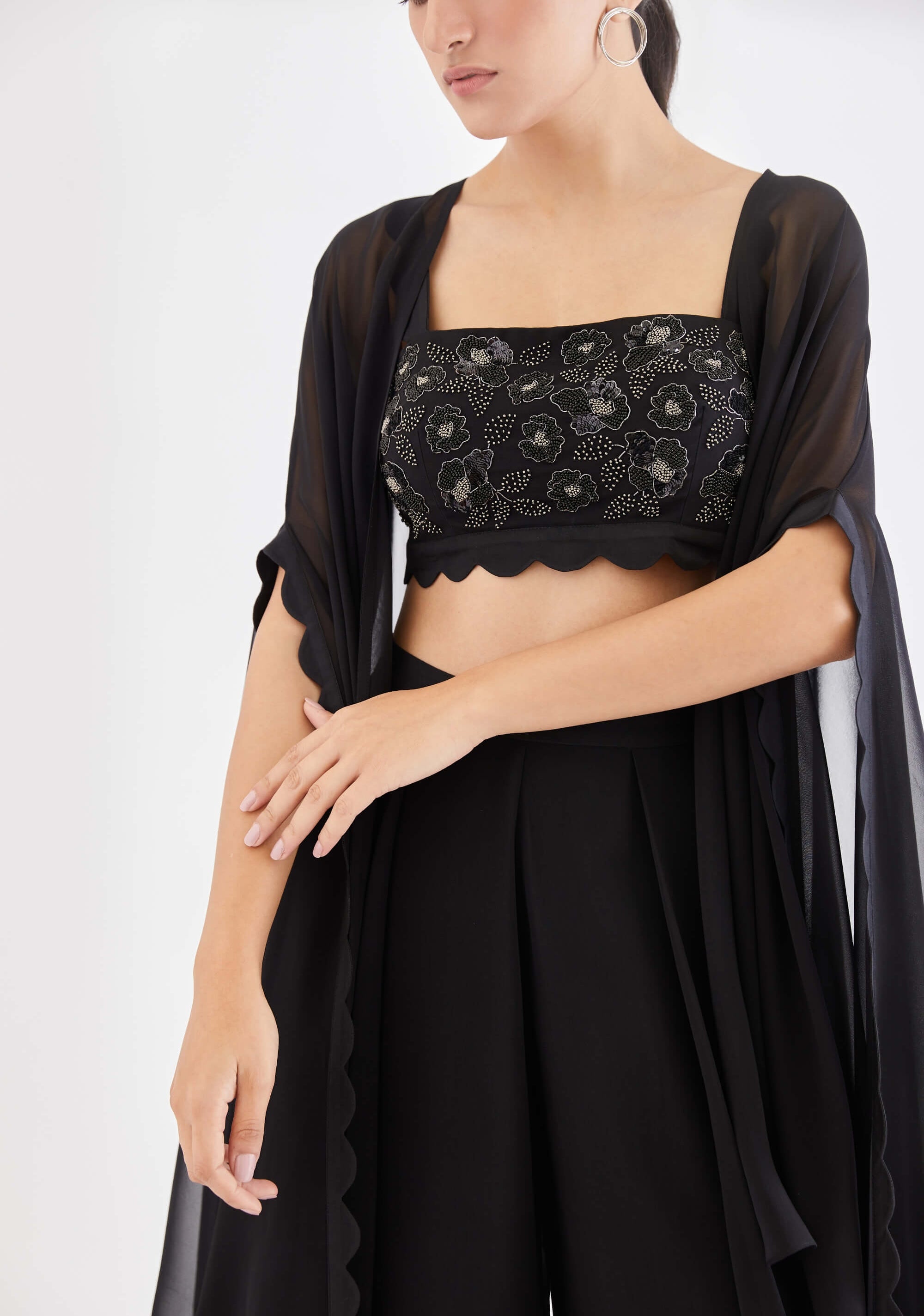 Embrace sophistication with our elegant ensemble, featuring a beautifully embroidered crop top paired with sleek black pleated wide-leg pants. The look is completed with a lightweight georgette cape, adorned with our signature handmade scallop trim. Ideal for formal occasions or evening events, this set effortlessly combines timeless style with intricate detailing, offering a refined and graceful presence.