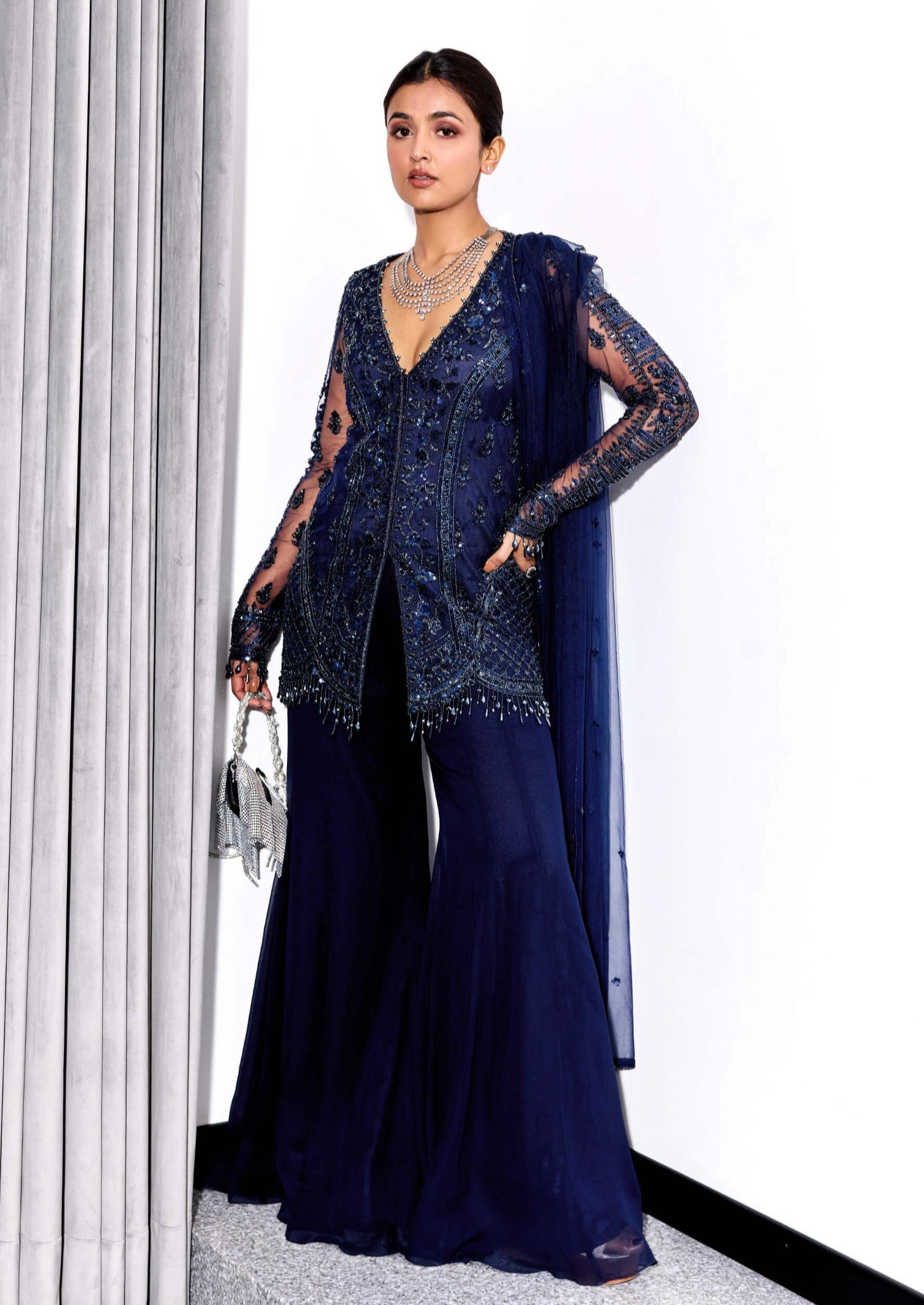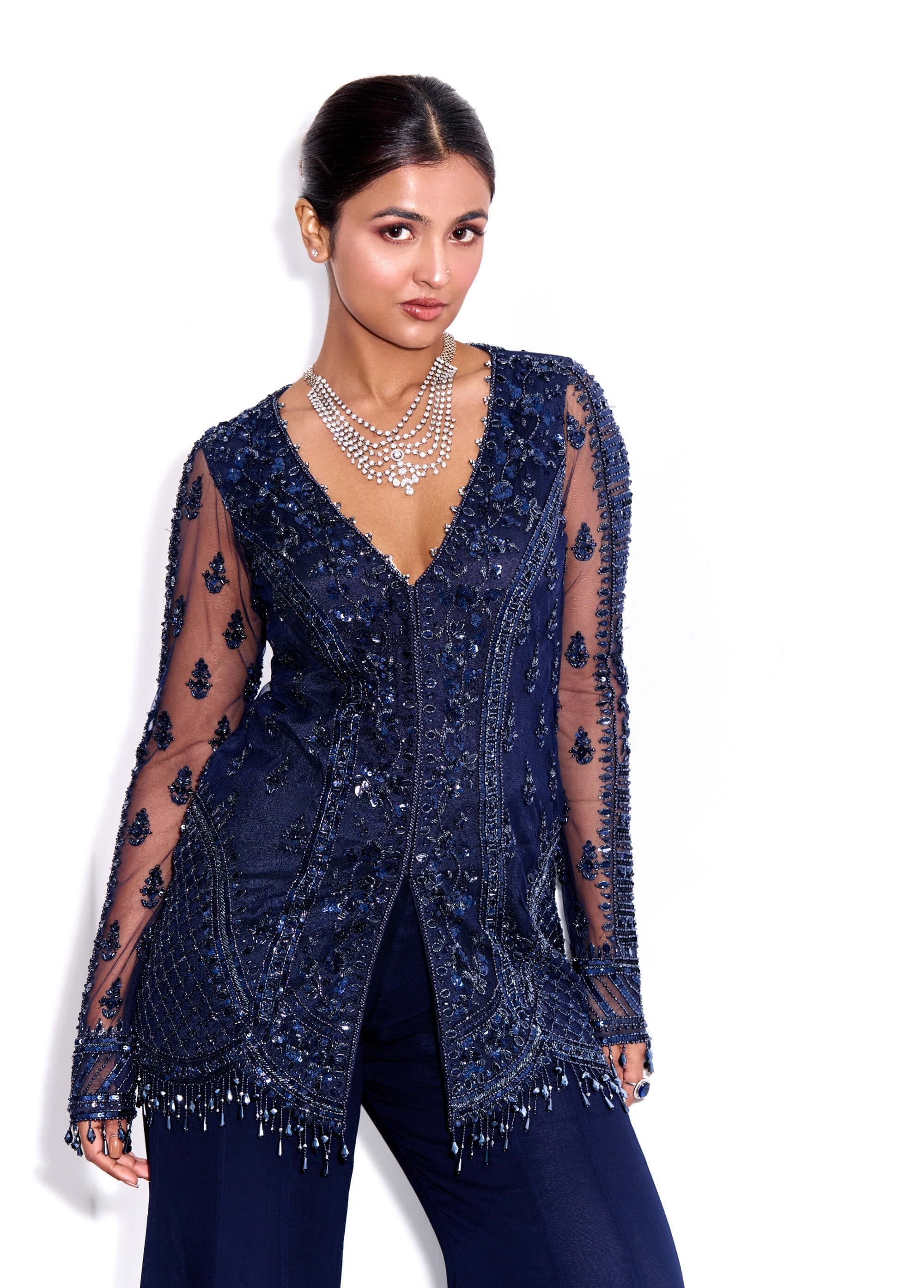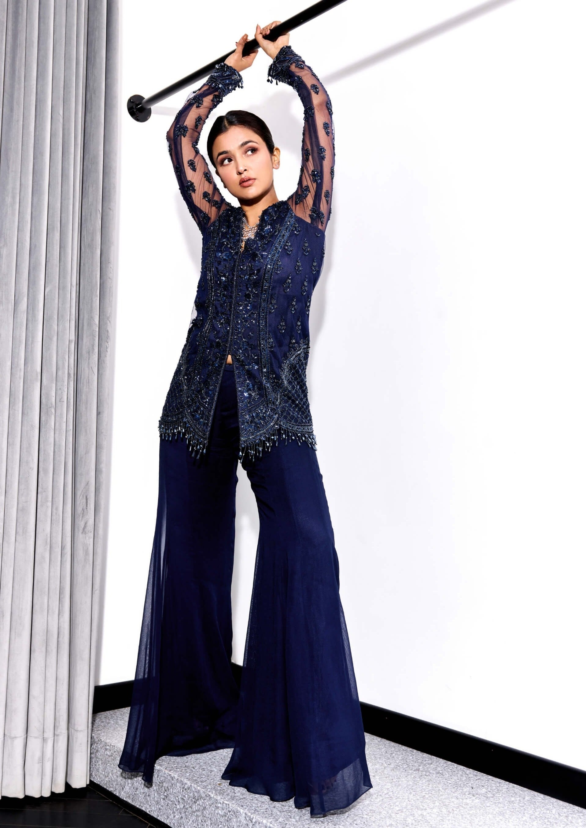 Introducing our stunning midnight blue kurta, exquisitely hand-embroidered in tonal shades to embody elegance and sophistication. The full sleeves feature intricate embroidery, enhancing its luxurious appeal. This elegant kurta is paired with flowing georgette flared pants that add graceful movement to your silhouette, and is completed with a matching net dupatta for a touch of sheer sophistication. Perfect for making a memorable impression at any special occasion, this ensemble seamlessly combines classic charm with contemporary style.