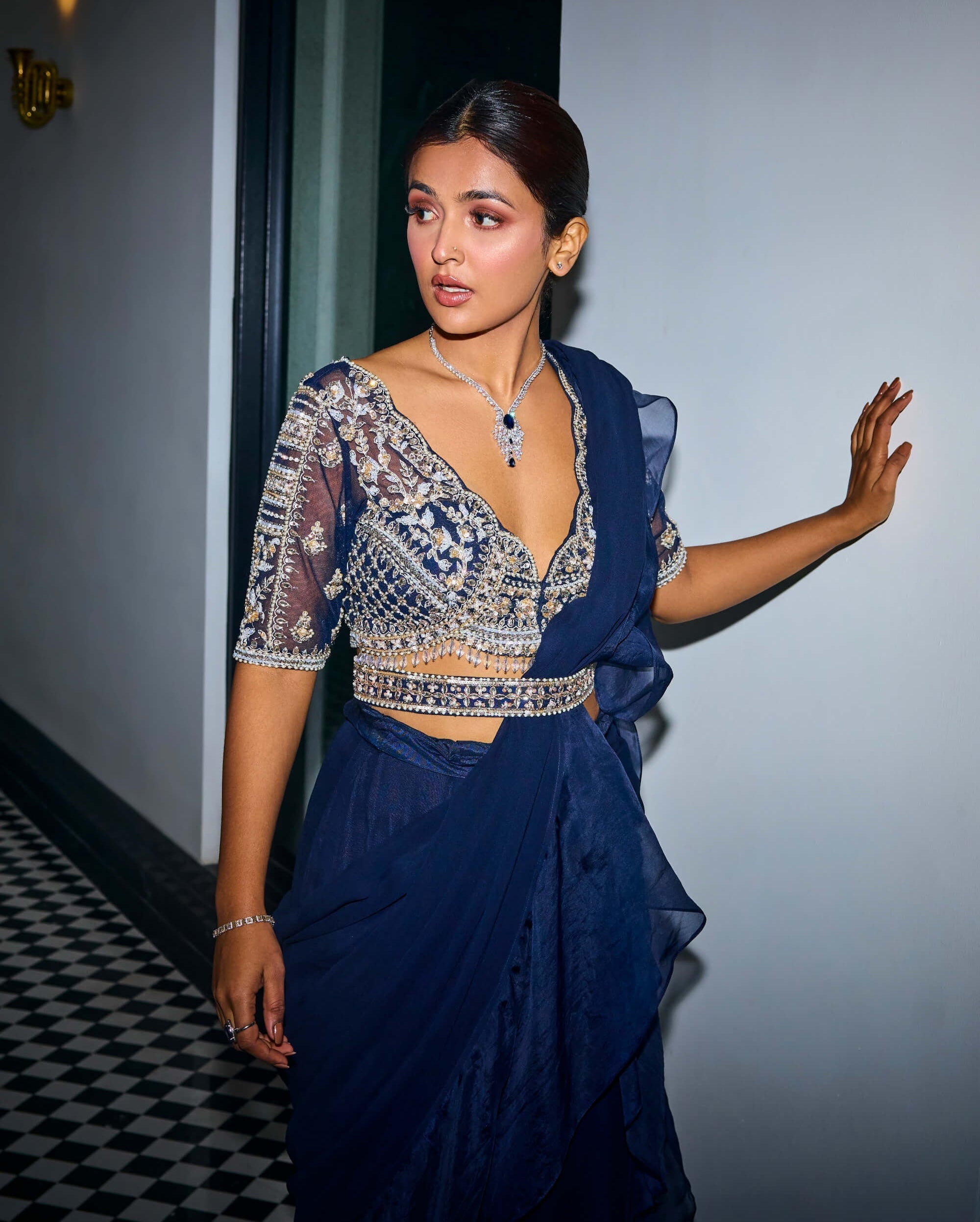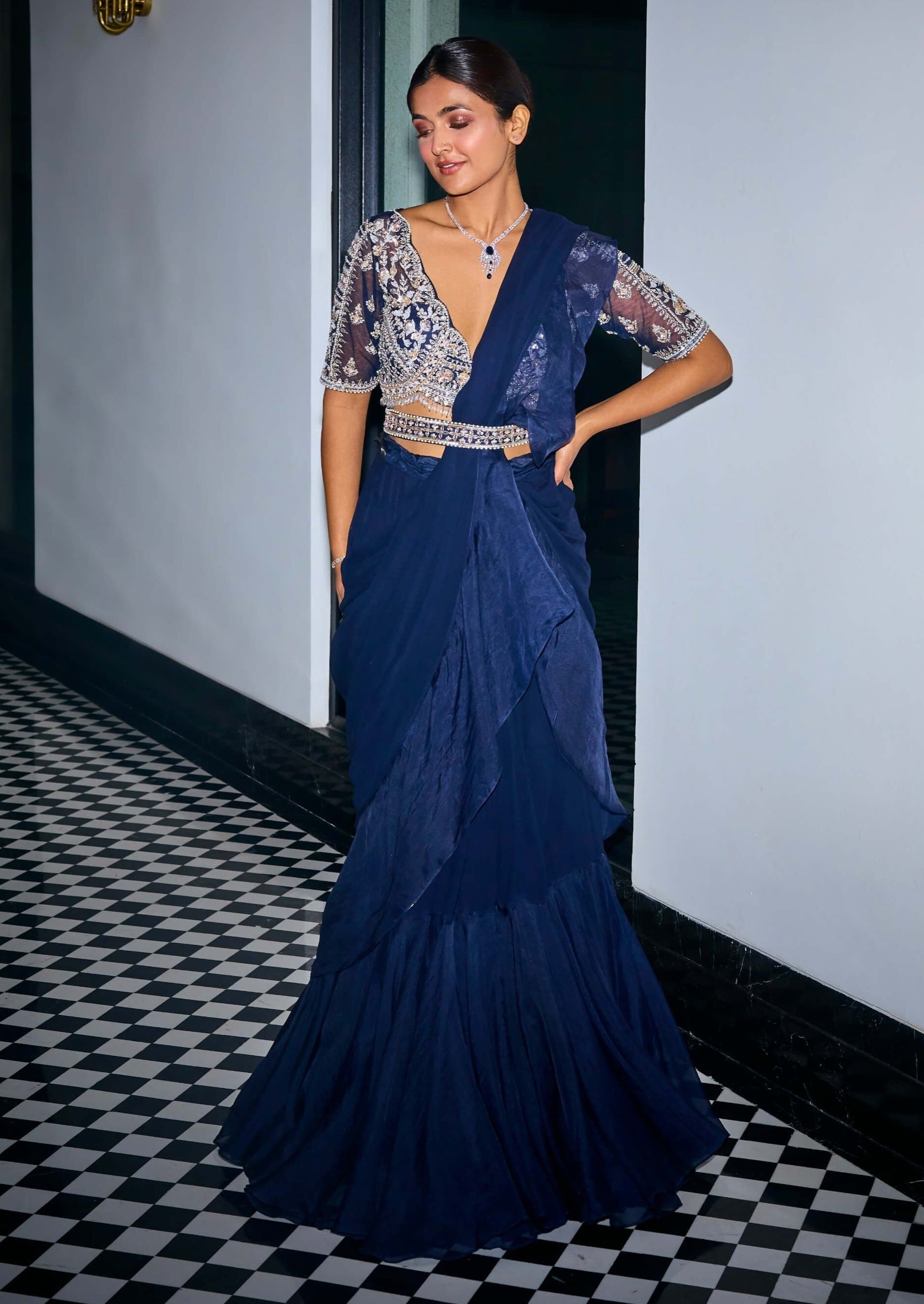 Elevate your style with our midnight blue georgette and organza ruffle saree, a masterpiece of sophistication and grace. This exquisite saree is paired with a hand-embroidered V-neck blouse, featuring scalloped edges and delicate tassel detailing at the waist. The ensemble is further enhanced by a matching hand-embroidered belt, perfectly complementing the elegant design. Ideal for any special occasion, this outfit seamlessly combines refined artistry with modern flair, ensuring you make a striking impression.