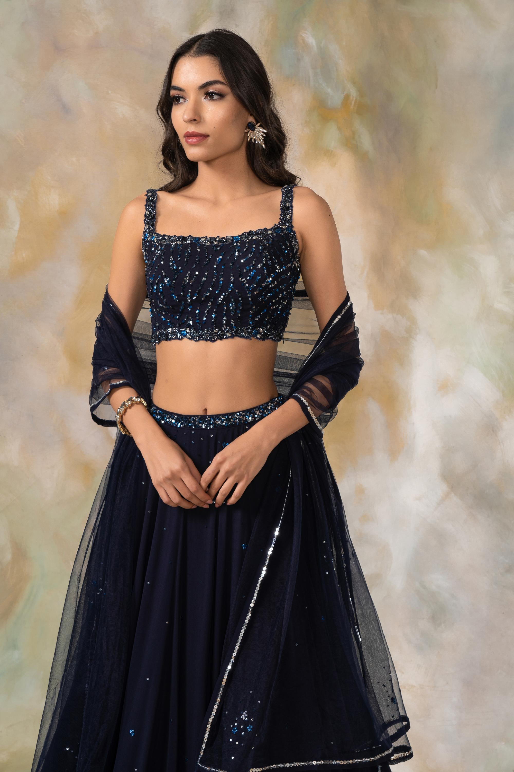 Stand out in this stunning midnight blue georgette lehenga, fully embellished with sequins, katdana, crystals, and beads. The skirt features an intricately embroidered waistband, adding a touch of elegance. The blouse showcases delicate cutwork detailing, while the look is completed with a beautifully embellished tulle dupatta. Underlayered with can-can for added volume, this ensemble is perfect for making a bold and graceful statement at any special occasion.