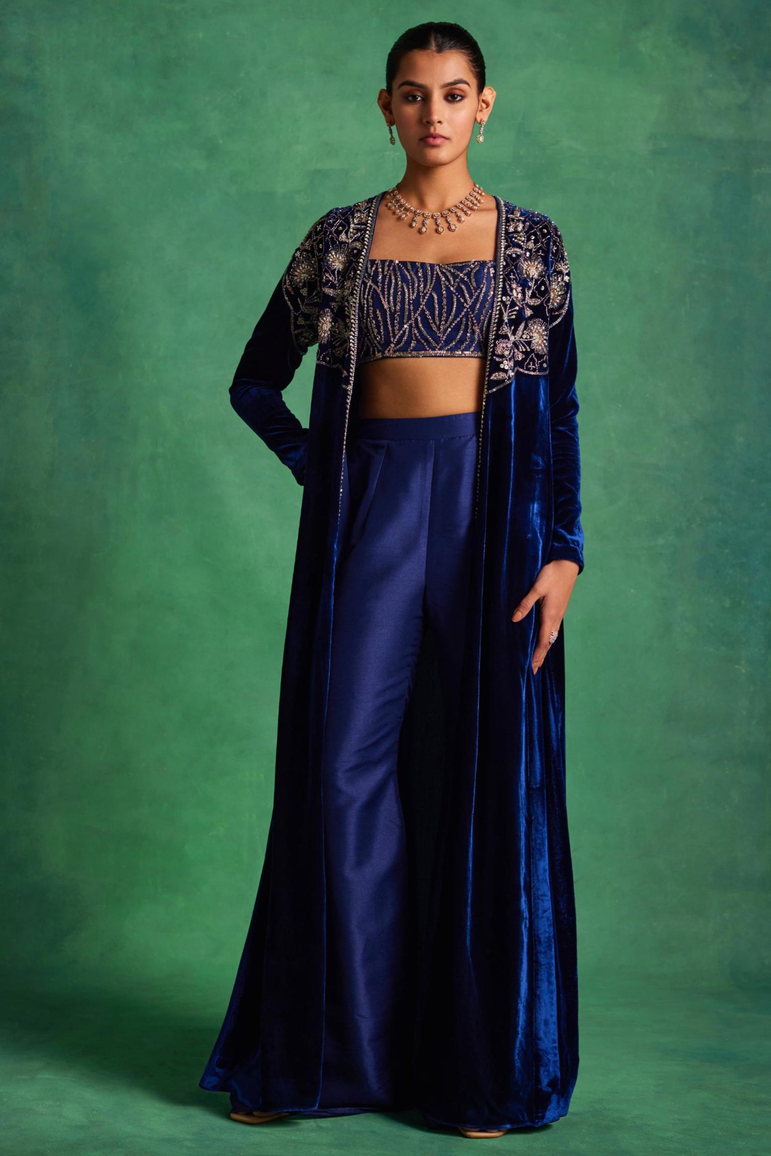 Elevate your festive wardrobe with this blue silk velvet long jacket, featuring exquisite hand embroidery on the yoke and sleeves. Paired with sleek silk pants and a matching hand-embroidered bustier, this ensemble exudes sophistication and elegance, making it an ideal choice for weddings and celebratory events.