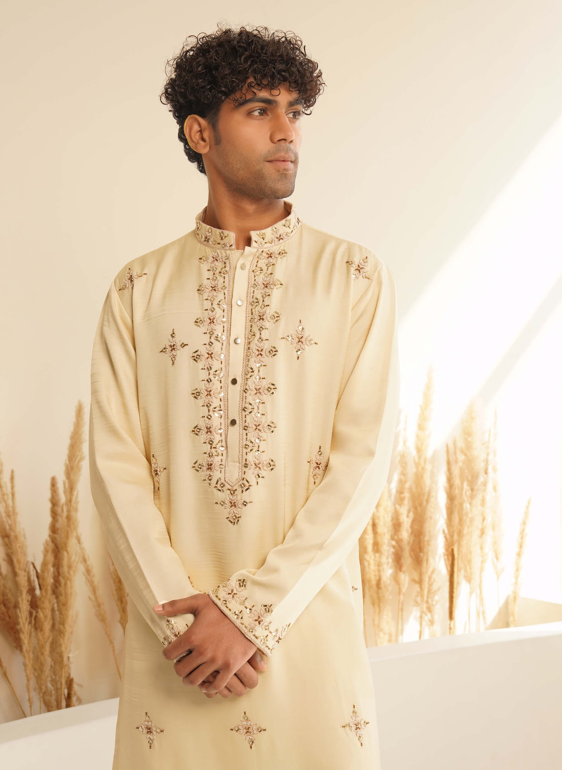 Experience timeless sophistication with our milky white kurta, featuring a graceful mandarin collar and striking metallic silver buttons. Adorned with delicate hand-embroidered details throughout, this kurta exudes refined elegance and artisanal craftsmanship. Perfect for any formal or festive occasion, it offers a seamless blend of classic charm and contemporary style. Elevate your wardrobe with this exquisite, meticulously crafted piece.