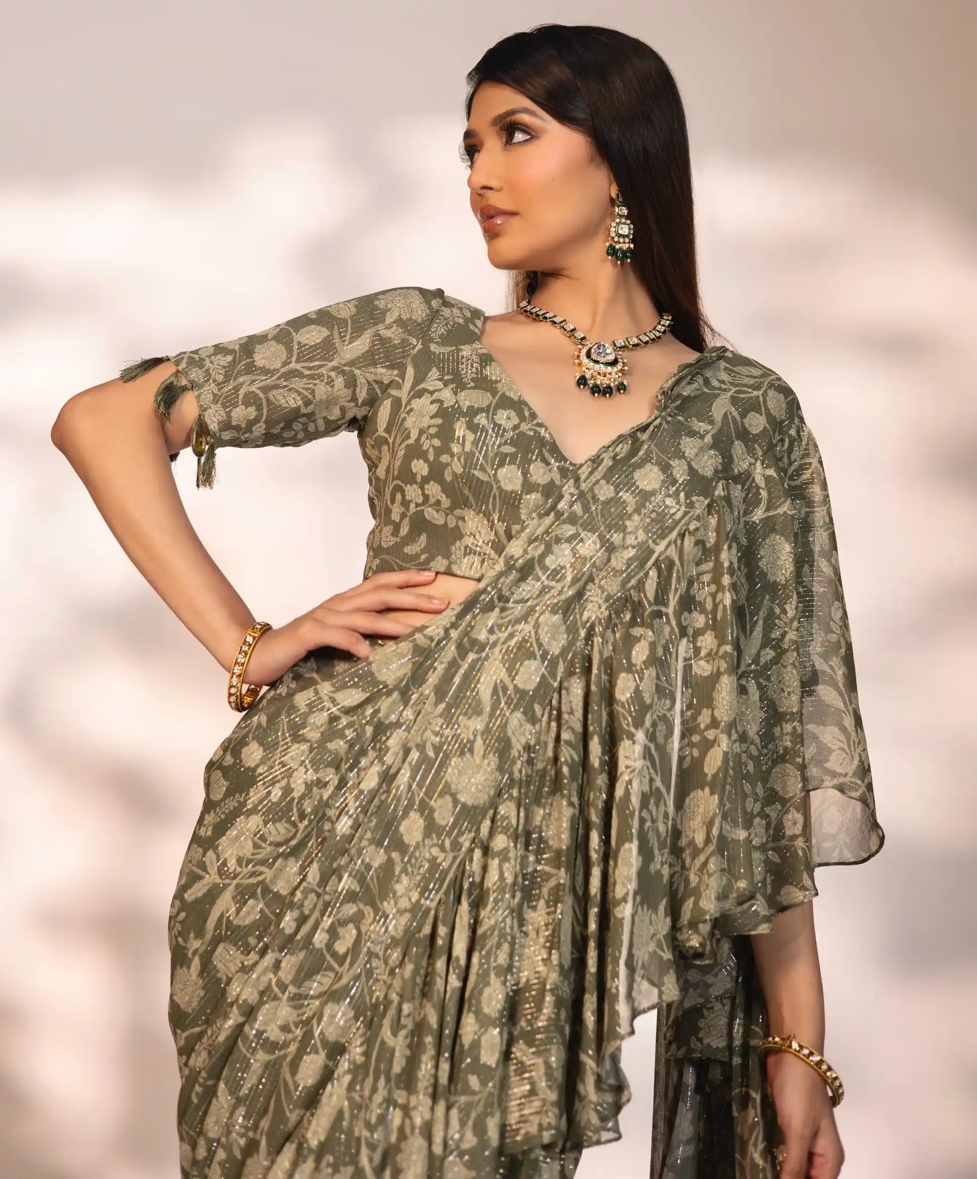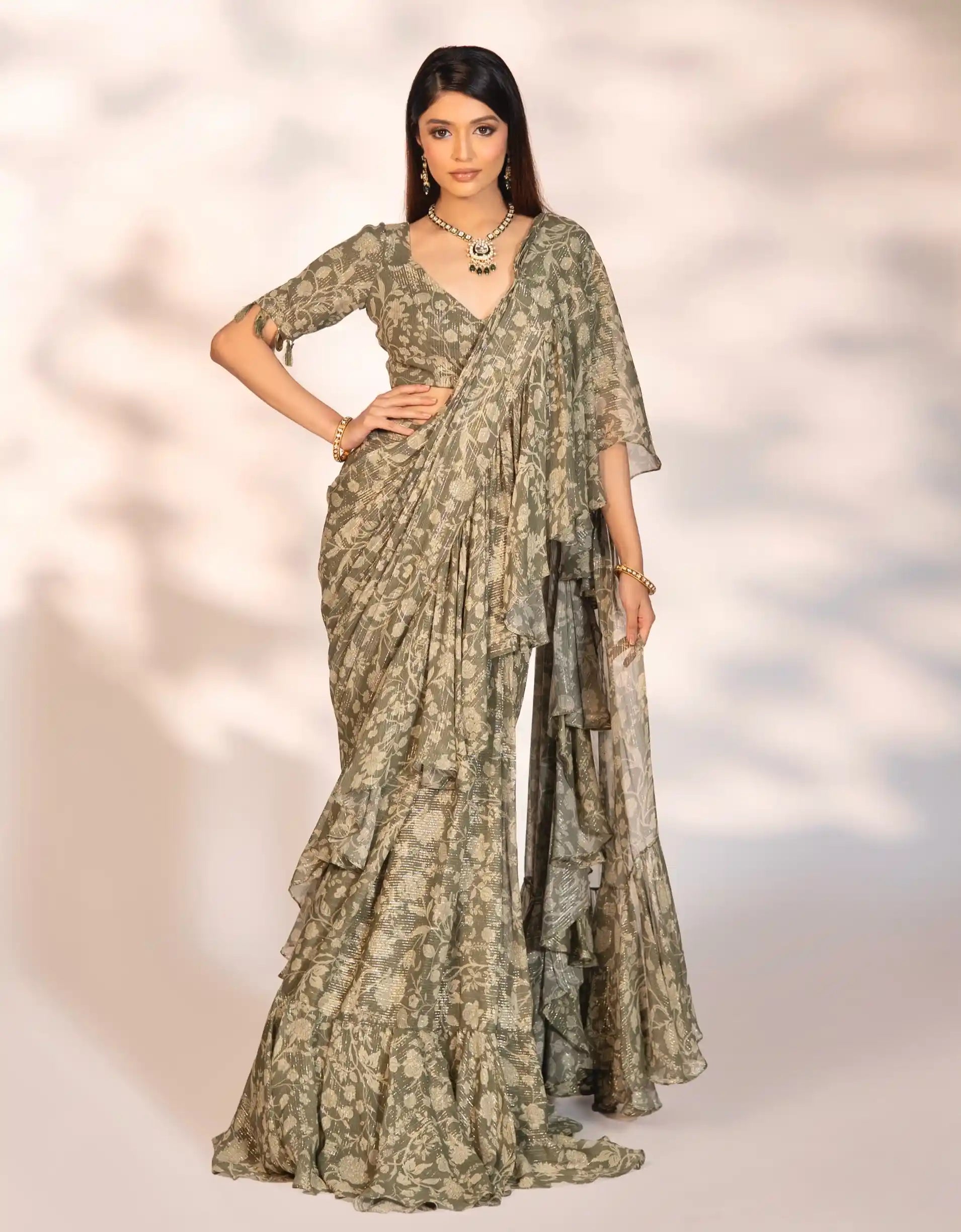Make a striking statement with our green printed ruffled saree, a perfect blend of contemporary flair and traditional elegance. The saree features playful ruffles that add movement and texture, while the vibrant print brings a fresh, lively touch to your wardrobe. The blouse is beautifully accented with mirror embroidery along the hem, adding a hint of sparkle and sophistication. Crafted from lightweight fabric for comfort and ease, this saree is ideal for festive occasions, parties, or any celebration where you want to shine. Embrace your inner diva and stand out in this stunning ensemble!