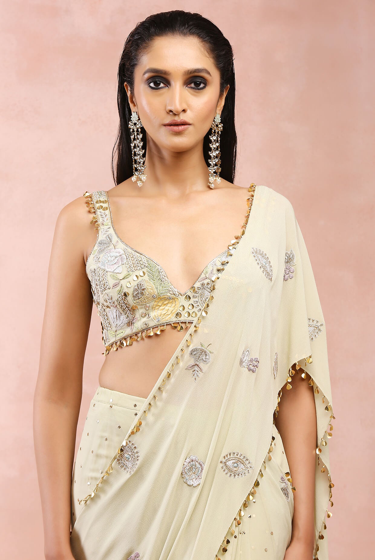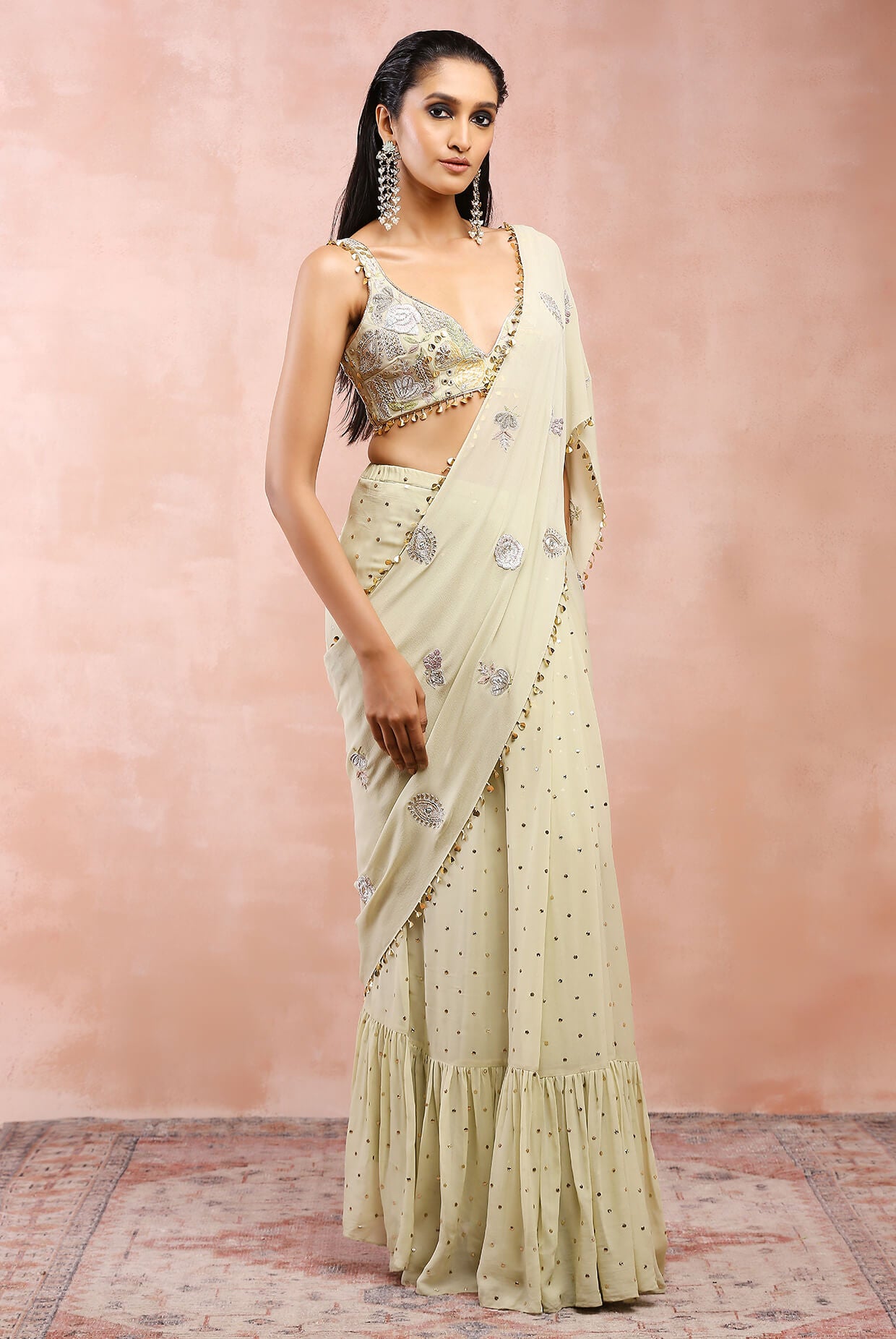 Embrace ethereal elegance with our Mint Georgette Applique Embroidered Choli paired with a Mukaish Georgette and Georgette Frill Pre-Stitched Saree. The choli, crafted from delicate mint georgette, features exquisite applique embroidery that adds a touch of refined sophistication. Complementing the choli is the pre-stitched saree, designed with a blend of mukaish georgette and georgette frills that create a graceful, flowing silhouette. This ensemble combines classic charm with contemporary ease, making it ideal for weddings, festive events, and special occasions, ensuring you exude timeless beauty and effortless style.