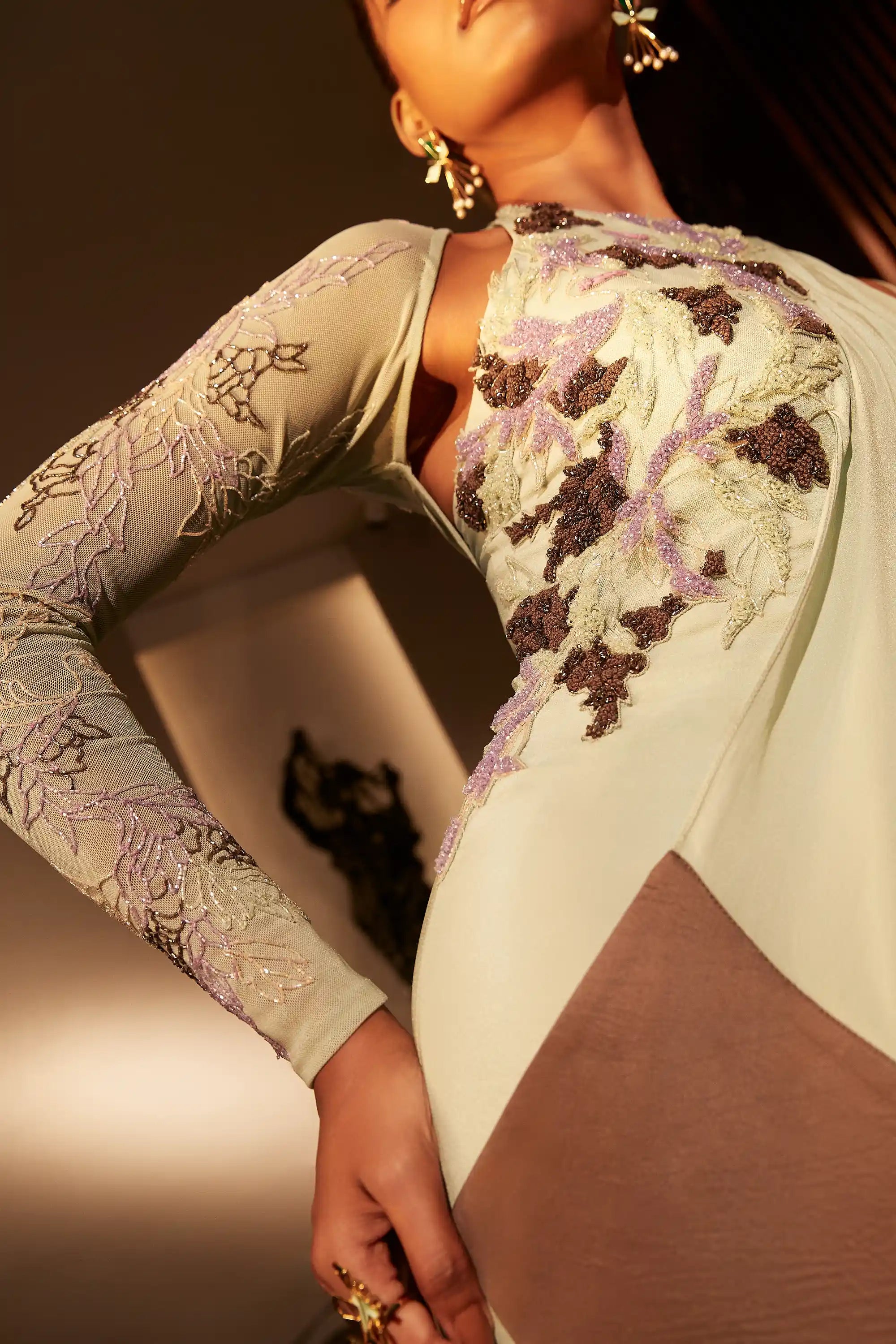 Step into elegance with this frosted mint pure crepe drape dress, featuring a striking contrasting espresso-coloured silk hem that adds a sophisticated touch. The graceful drape of the dress creates a flattering silhouette, making it perfect for any occasion.