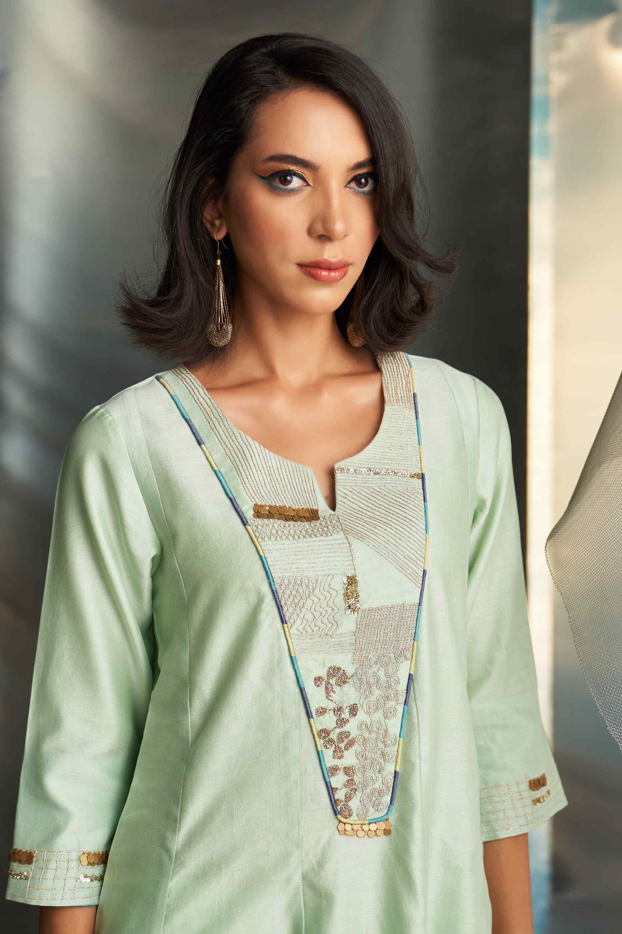 Elevate your wardrobe with this graceful flared kurta set in mint green, an ideal choice for any occasion. The kurta is elegantly adorned with intricate embroidery on the front yoke, adding a touch of sophistication and charm. Complemented by a beautifully embroidered dupatta, featuring delicate gold-polished hangings along the edges, and a loose, comfortable salwar, this ensemble seamlessly blends traditional craftsmanship with modern style. Its rich details and timeless design make it a standout piece, ensuring you make a memorable impression wherever you go.