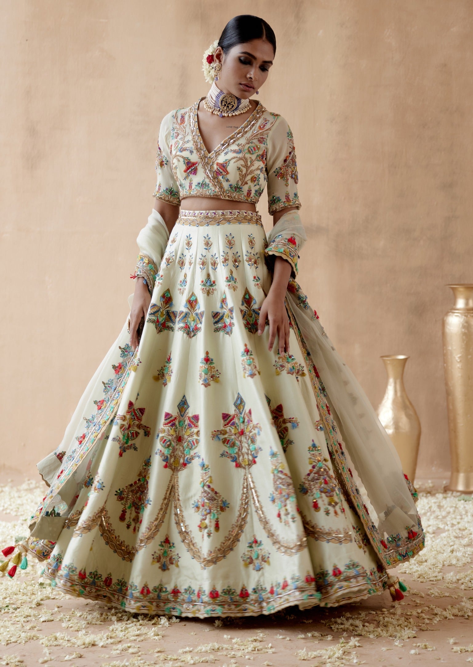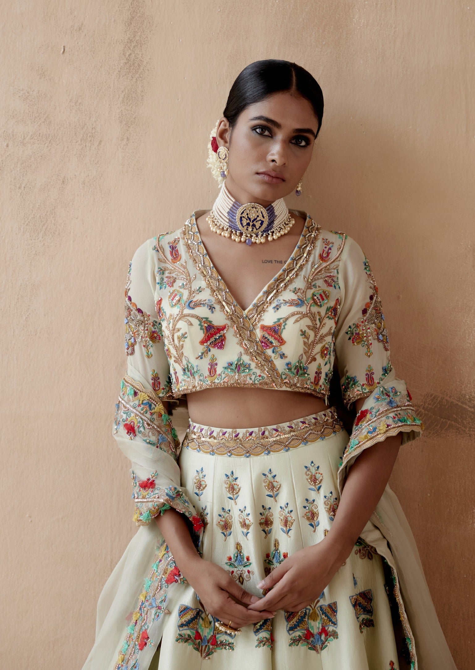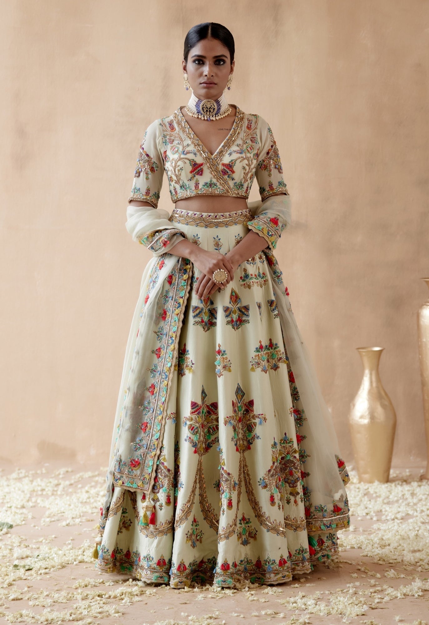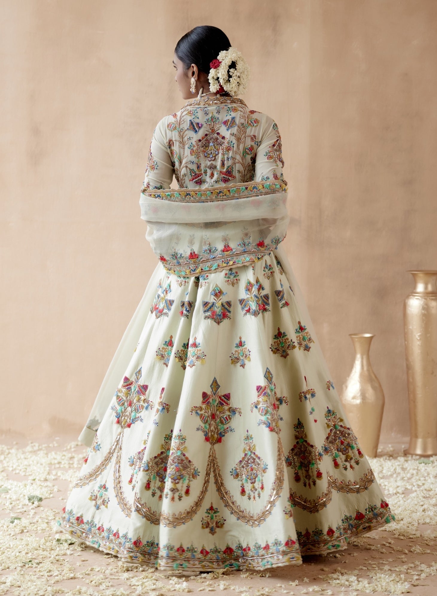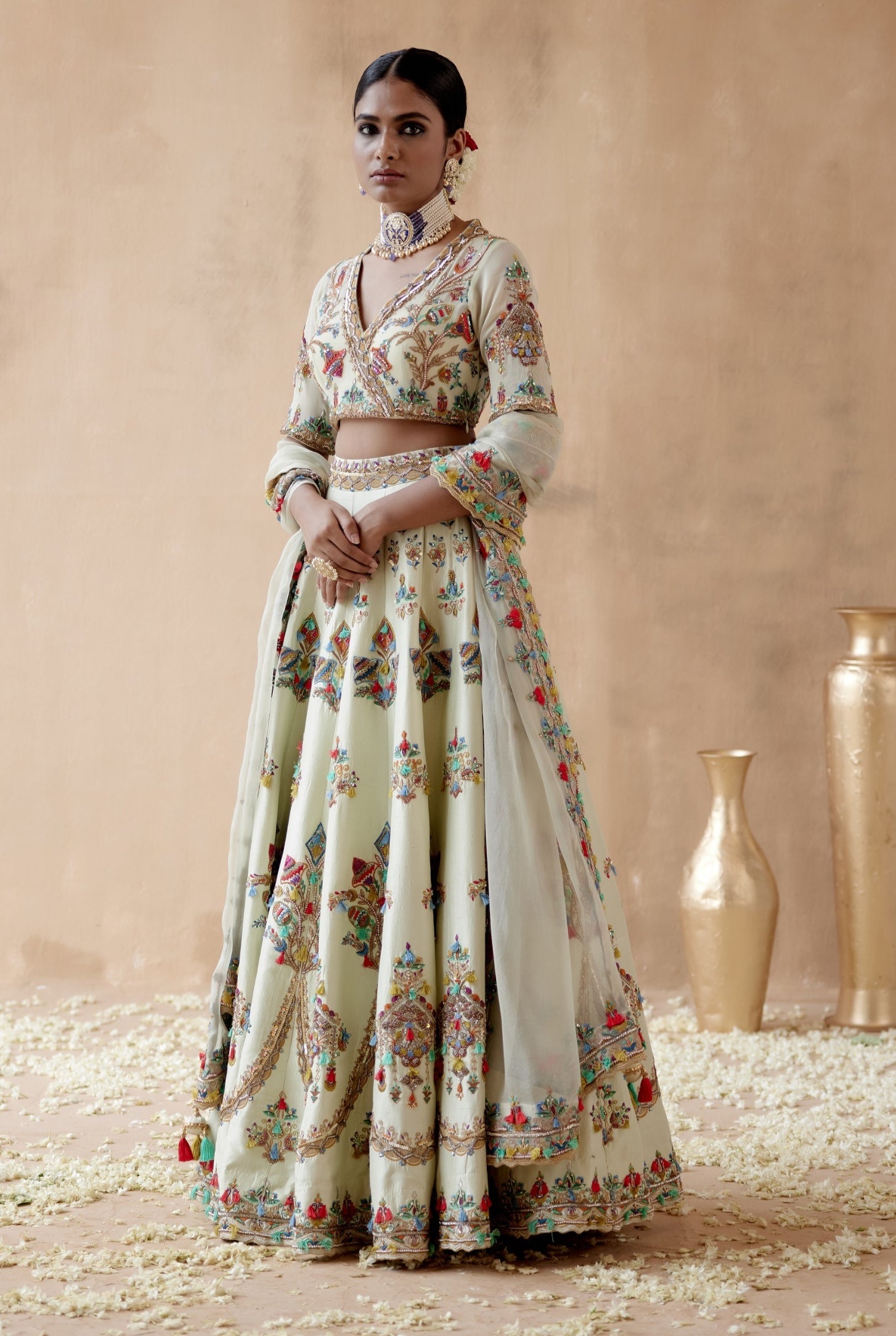 Step into sophistication with our elegant mint green dupion silk lehenga set, featuring exquisite floral thread embroidery accentuated with a range of sophisticated embellishments. This enchanting ensemble is perfectly paired with a matching embroidered blouse and a coordinating dupatta, creating a seamless and refined look. Ideal for weddings and special celebrations, this lehenga set combines delicate craftsmanship and fresh, vibrant hues to offer a timeless and stylish appearance.