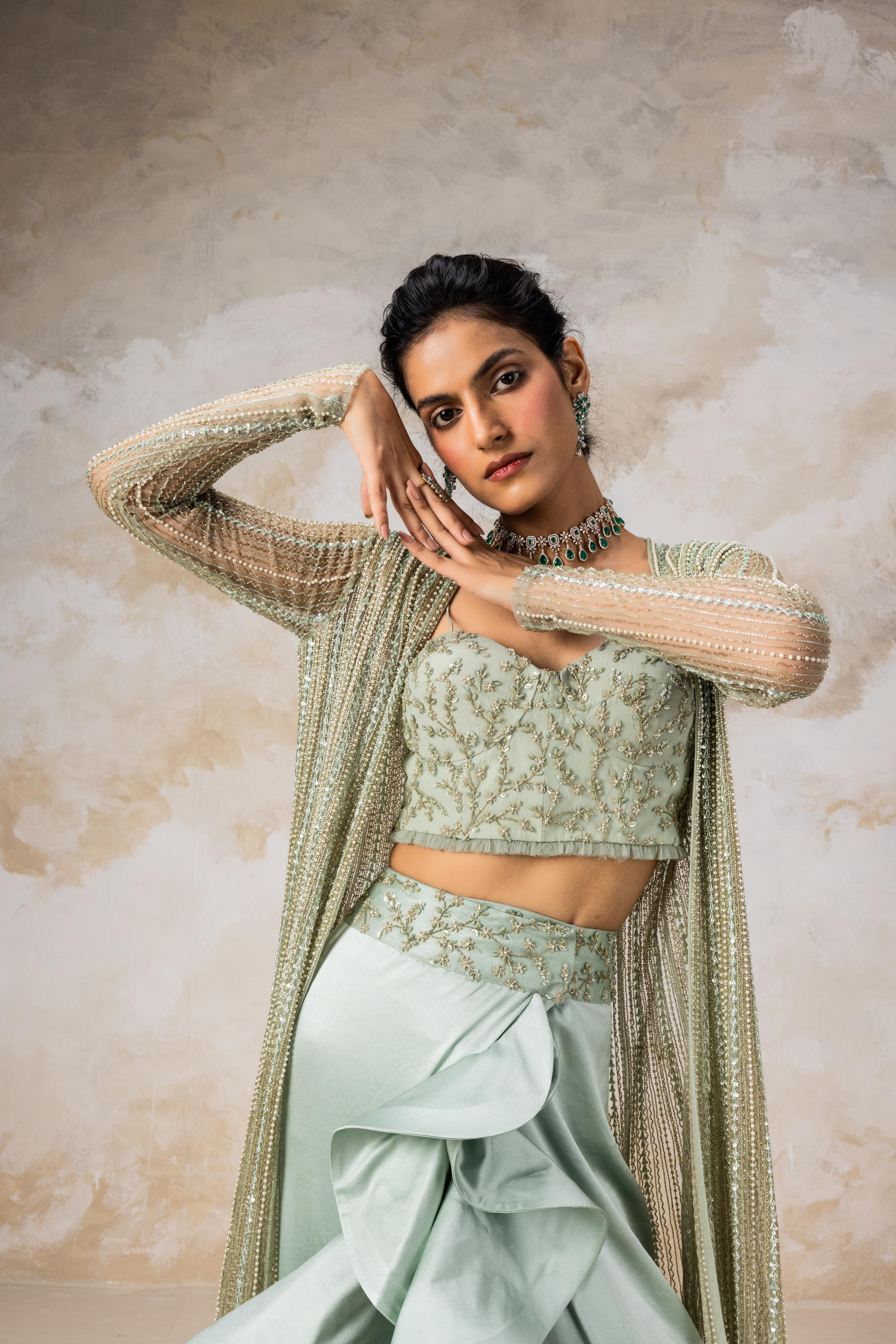 This stunning floor-length jacket is heavily embroidered, exuding opulence and intricate craftsmanship. It is paired with a gold and green combination jaal corset, offering a striking contrast and modern sophistication. The ensemble is completed with a satin flouncy ruffled skirt, adding volume and movement. Perfect for grand occasions, this outfit blends luxury with contemporary elegance for a show-stopping look.