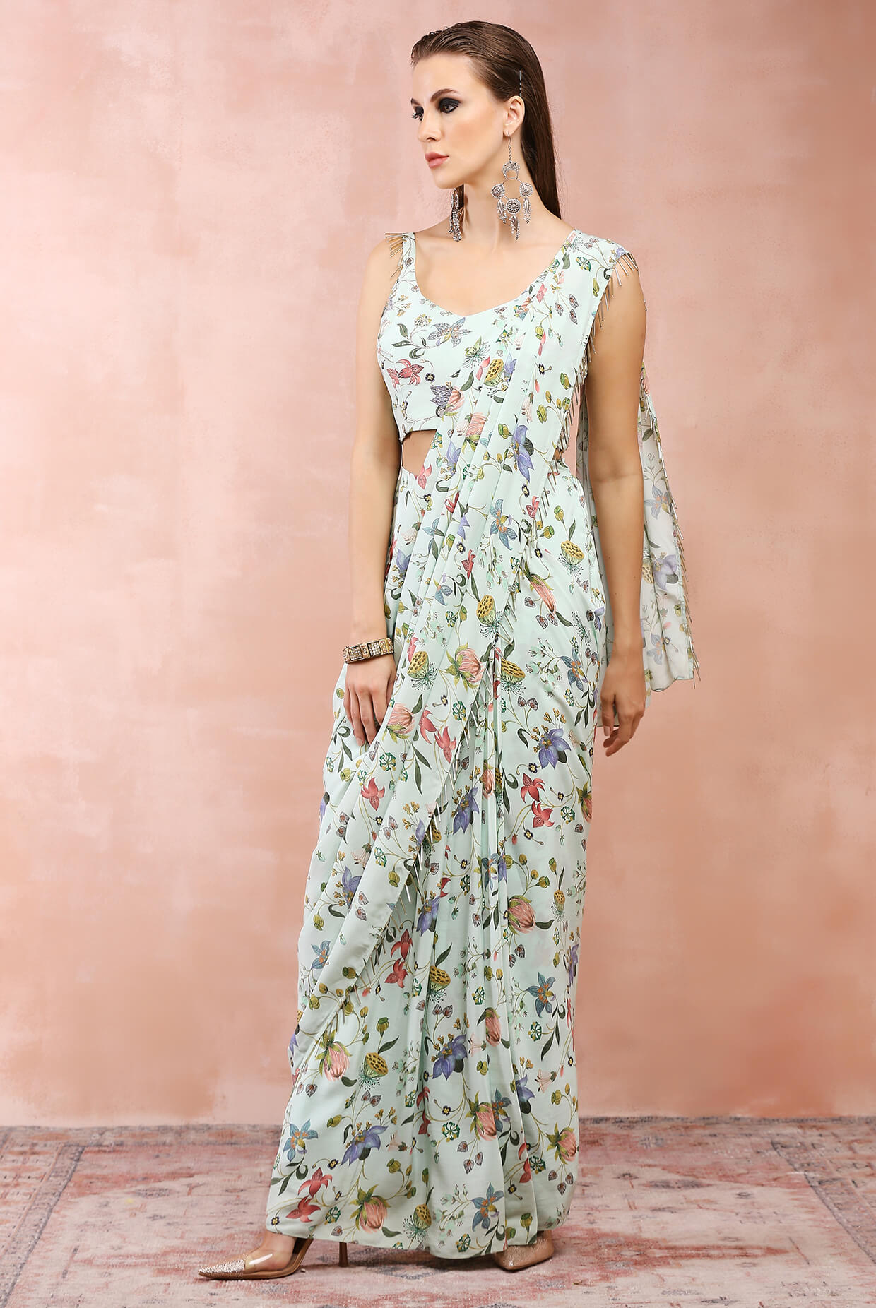 Discover effortless elegance with our Mint Nargis Print Crepe Choli and Pre-Stitched Saree Set. The choli features a beautiful nargis print with intricate embroidery, enhancing its refined charm. Paired with a pre-stitched saree, this set offers the timeless grace of traditional wear with the ease of modern styling. Perfect for weddings, festivities, and special occasions, it combines classic beauty with contemporary convenience for a standout look.