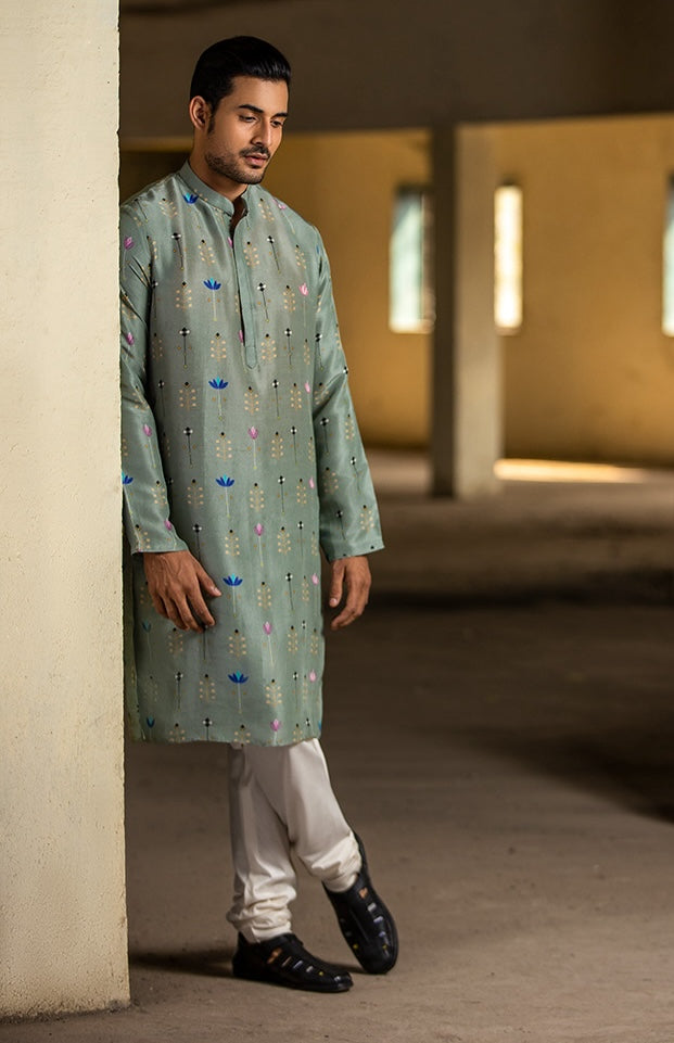 Embrace contemporary elegance with this mint geometric lotus print silk kurta, designed for the modern man who appreciates unique style. Crafted from luxurious silk, this kurta features a striking geometric lotus motif that adds a fresh and artistic touch to your ethnic wardrobe. The soft mint hue offers a refreshing pop of color, while the fabric drapes beautifully for a comfortable fit.