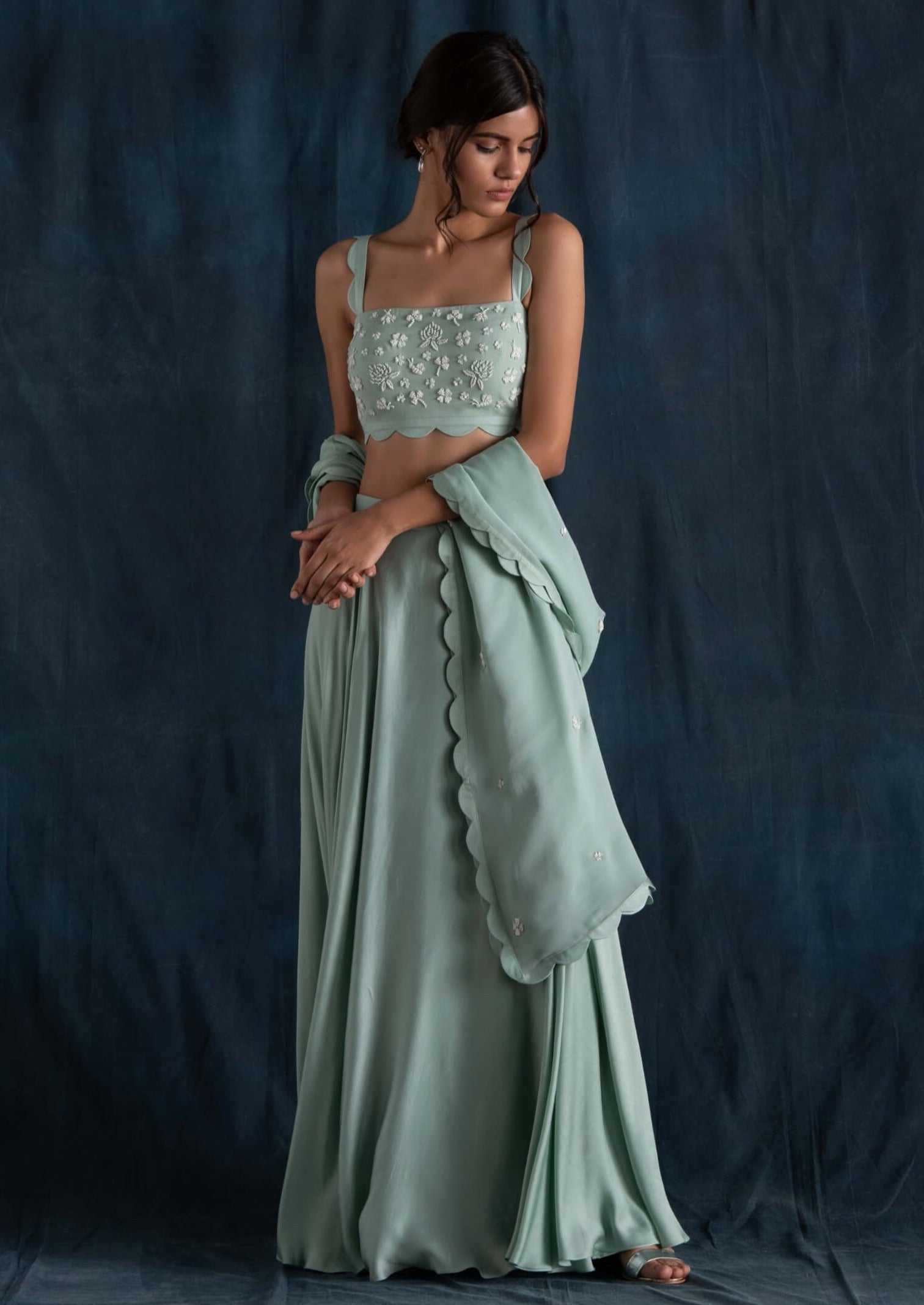 Step into refined beauty with our Mint Lehenga Set, a perfect blend of enchantment and sophistication. The ensemble features a full bias-cut skirt that flows with graceful ease, paired with a georgette blouse embellished with intricate ivory glass beads and sequin embroidery for a shimmering allure. Completing the look is a lightly embellished georgette dupatta, adorned with handmade scallop trim, showcasing artisanal craftsmanship. This lehenga set embodies timeless elegance, ideal for adding an ethereal touch to any special occasion.
