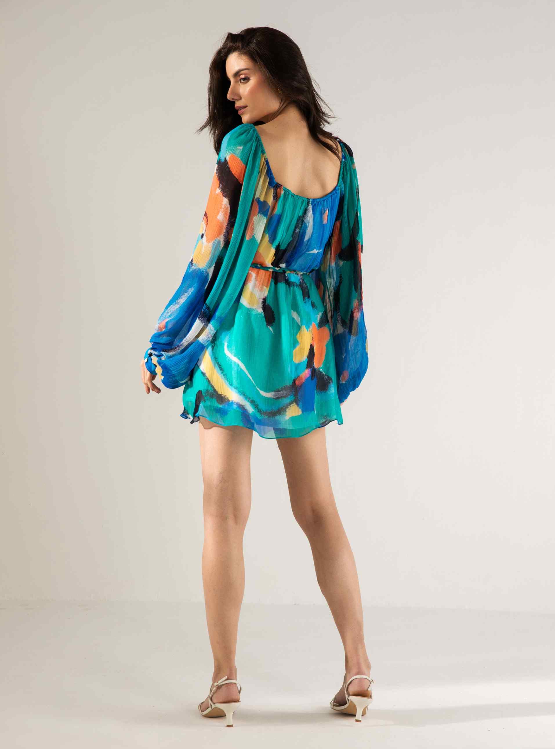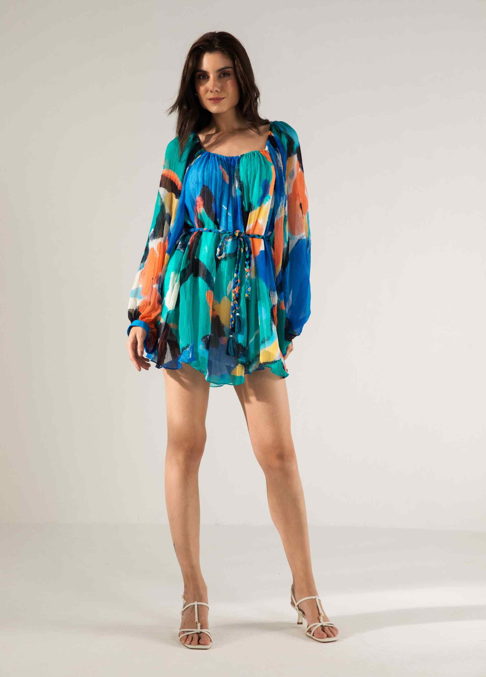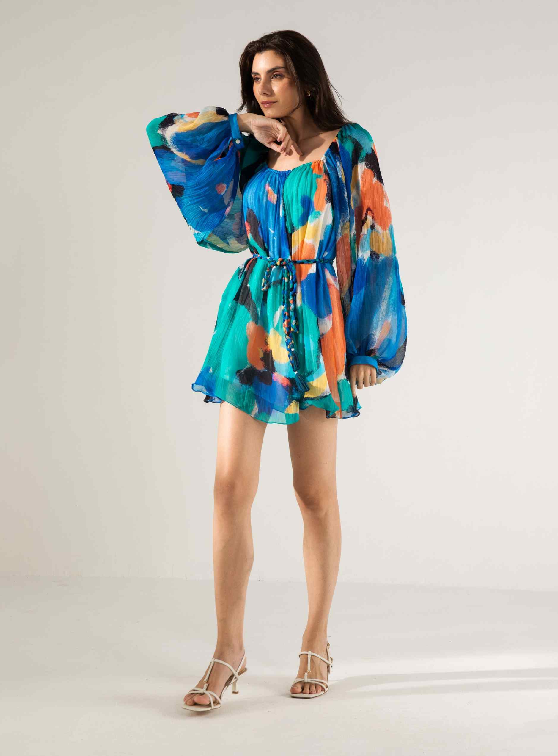Step into nature-inspired elegance with this full-sleeve short dress, featuring a striking abstract floral brushstrokes print on a blue chiffon base. The hand-knotted detachable belt adds a touch of versatility, while the design captures the raw, untamed beauty of the wilderness, blending vibrant artistry with modern sophistication.