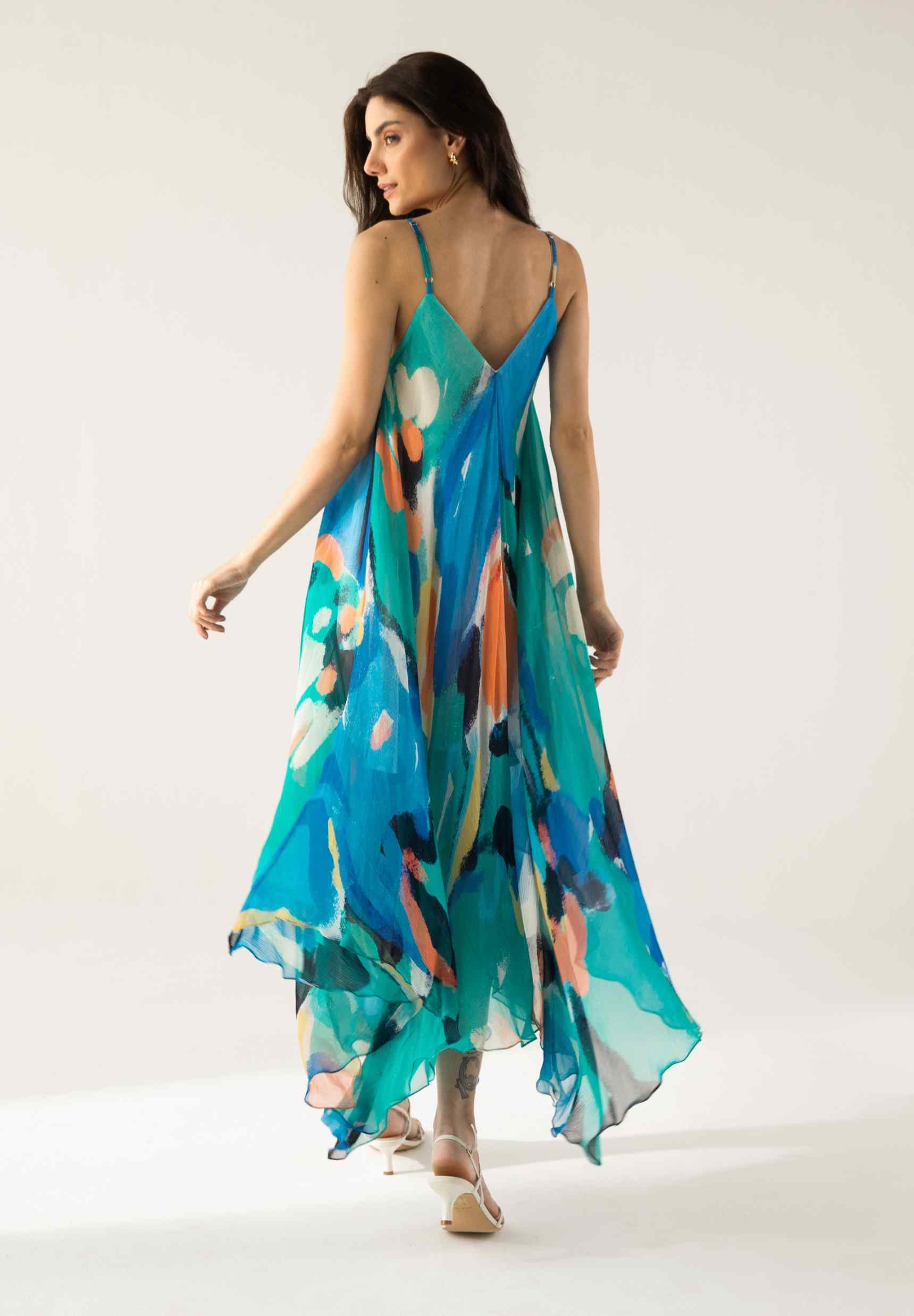 Step into nature-inspired elegance with this cami asymmetric long dress, featuring an abstract floral brushstrokes print on a blue chiffon base. Adorned with beadwork at the neckline, it captures the raw, untamed beauty of the wilderness, blending vibrant artistry with sophisticated design.