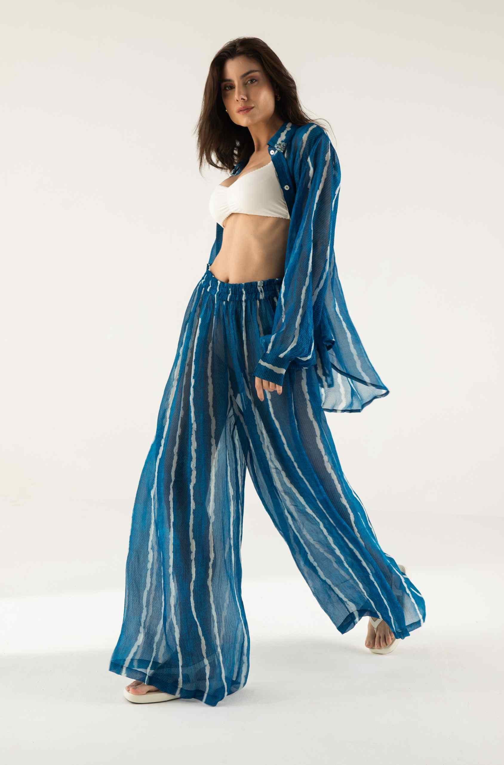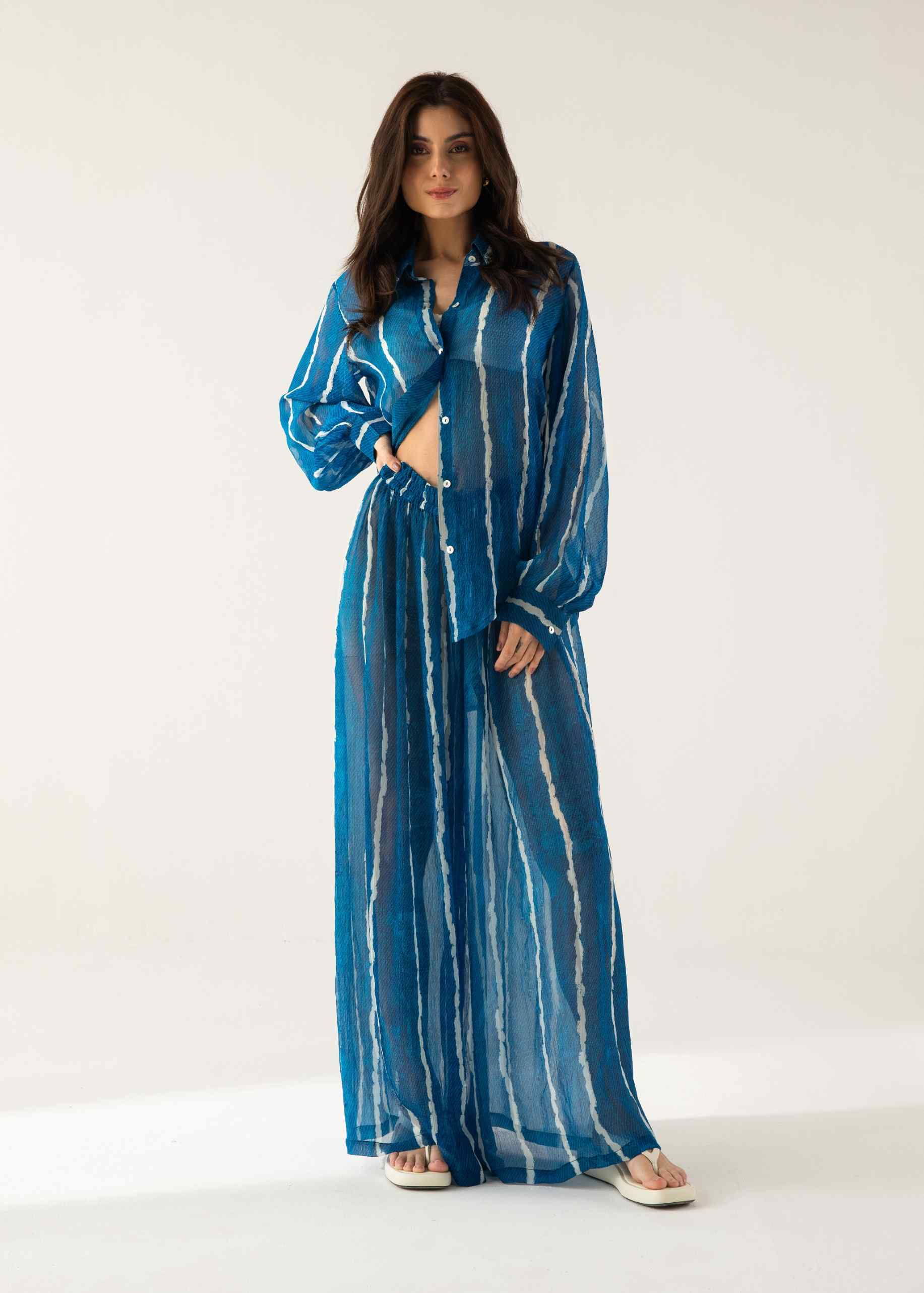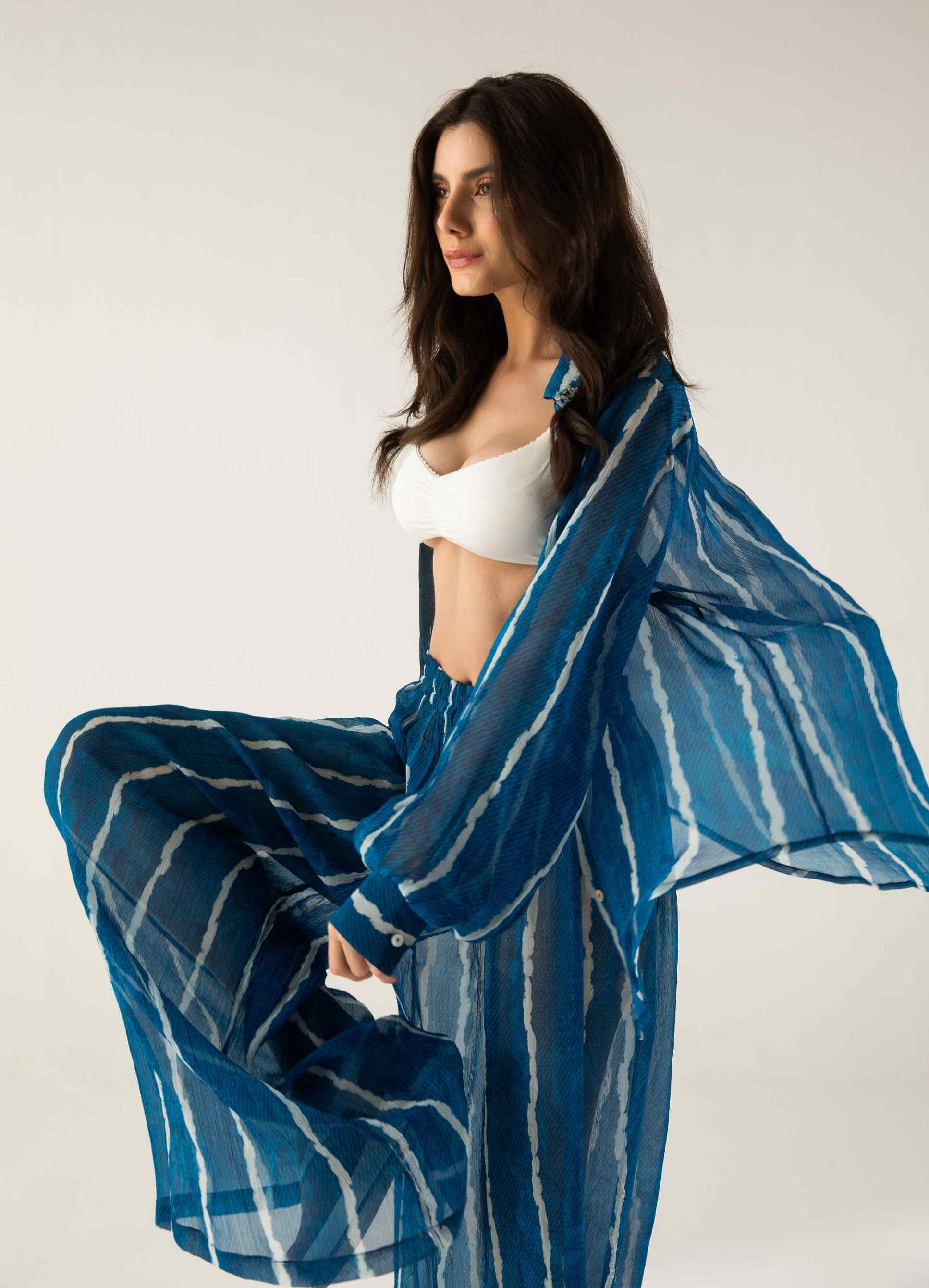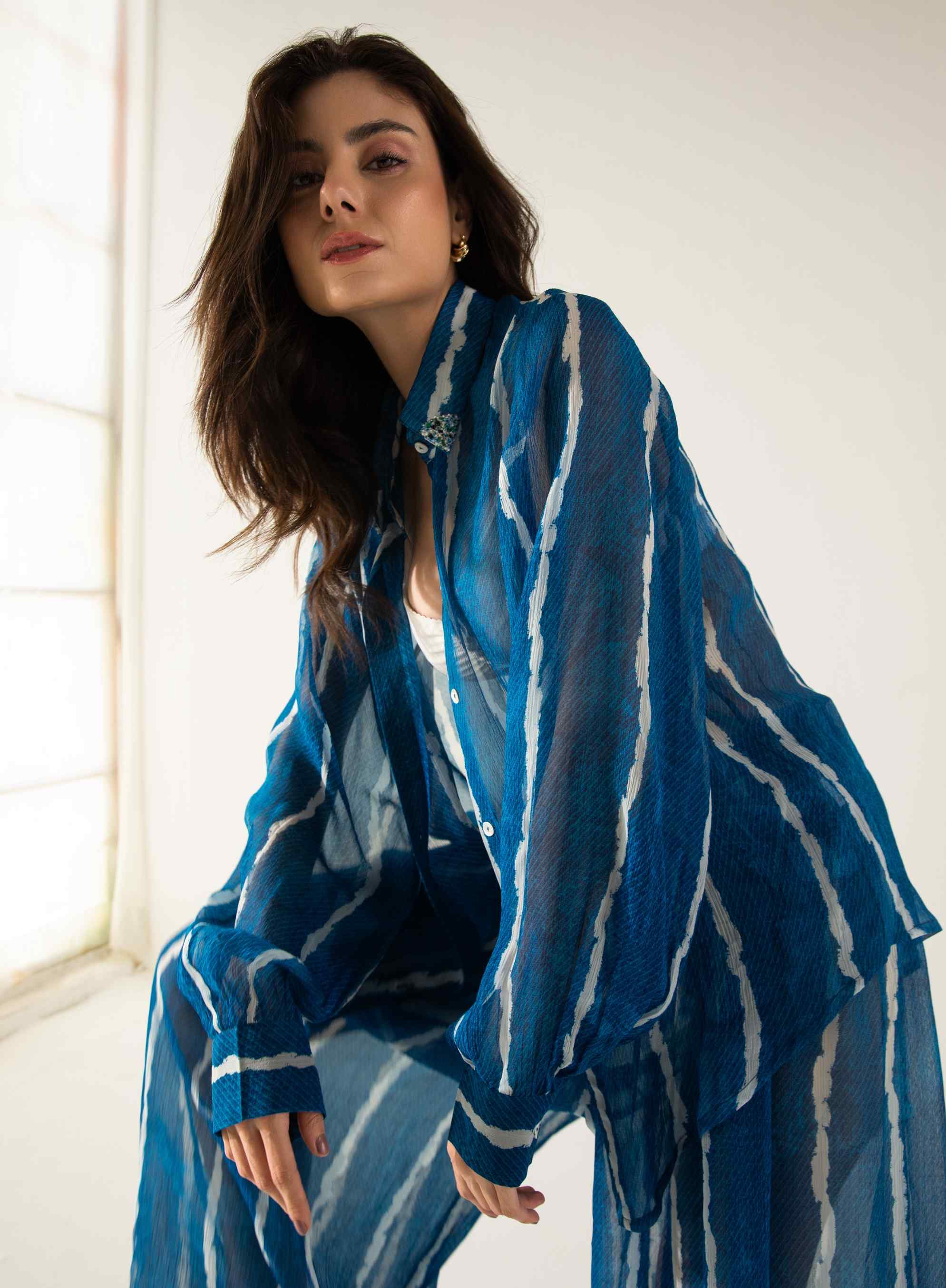 Step into effortless style with this relaxed-fit shirt and pants set, featuring textured stripes on a blue chiffon base. Adorned with beadwork at the collar corners, it captures the raw, untamed beauty of the wilderness, blending nature-inspired elegance with contemporary comfort.