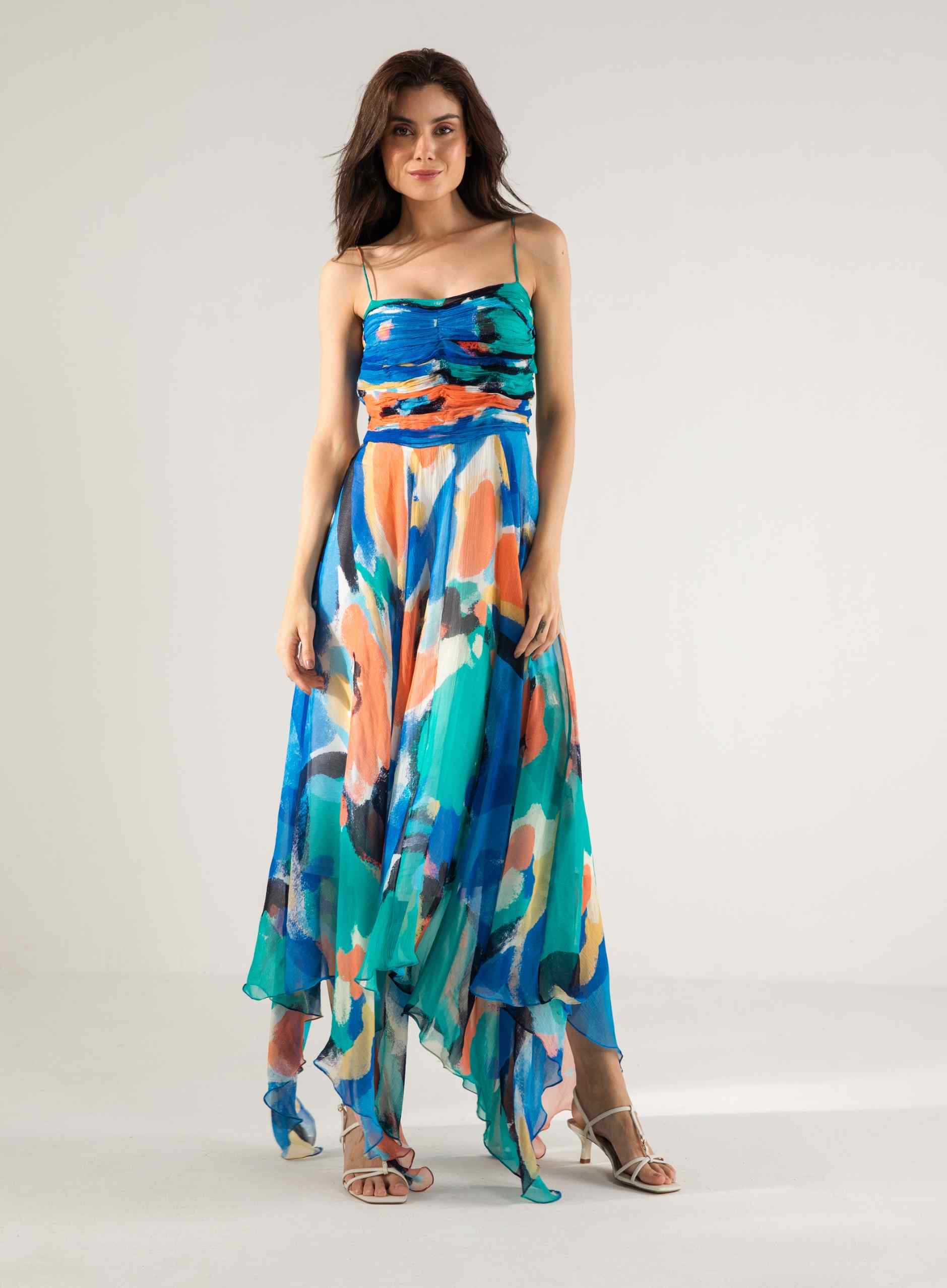 This cami asymmetric dress highlights ruching at the bust and an abstract floral brushstrokes print on a blue chiffon base. Drawing from the raw, untamed beauty of the wilderness, it merges nature’s dynamic energy with a stylish, modern design.