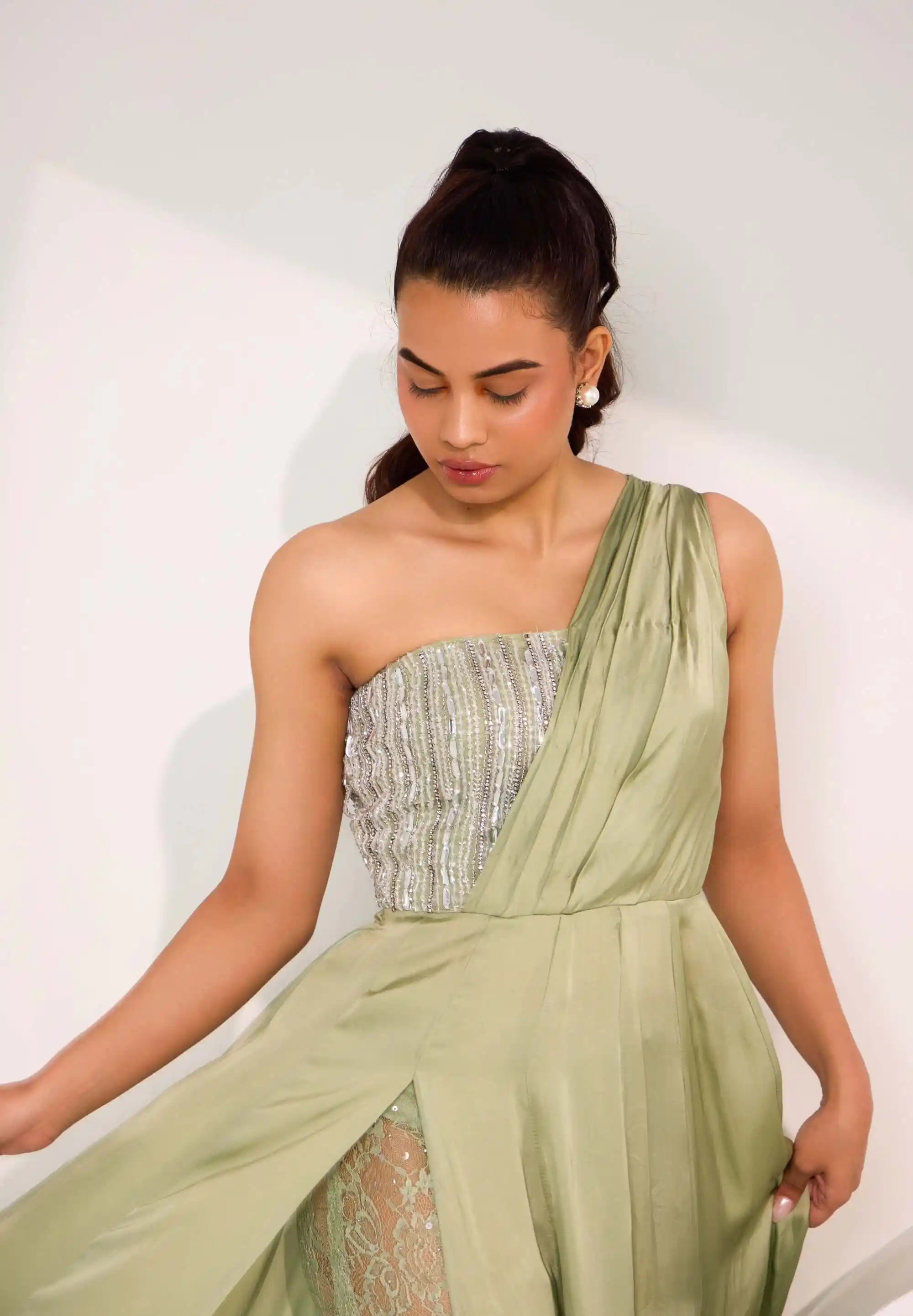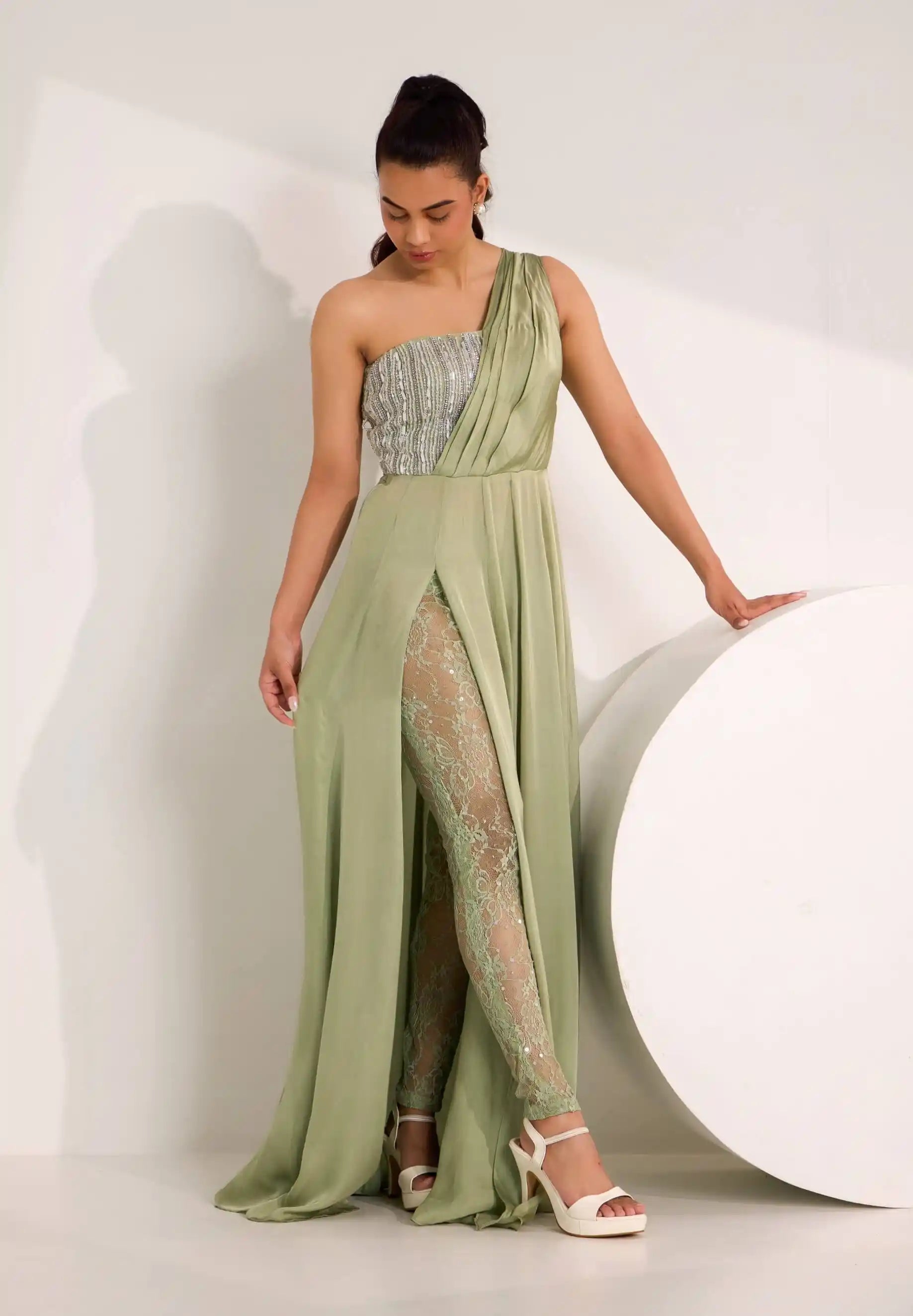 Introducing the mirela one-shoulder high slit gown with lace legging in a stunning mint green hue. This eye-catching ensemble features exquisite mix media embroidery that adds depth and sophistication to the design. The striking one-shoulder silhouette is complemented by a daring high slit, offering a perfect blend of elegance and allure.