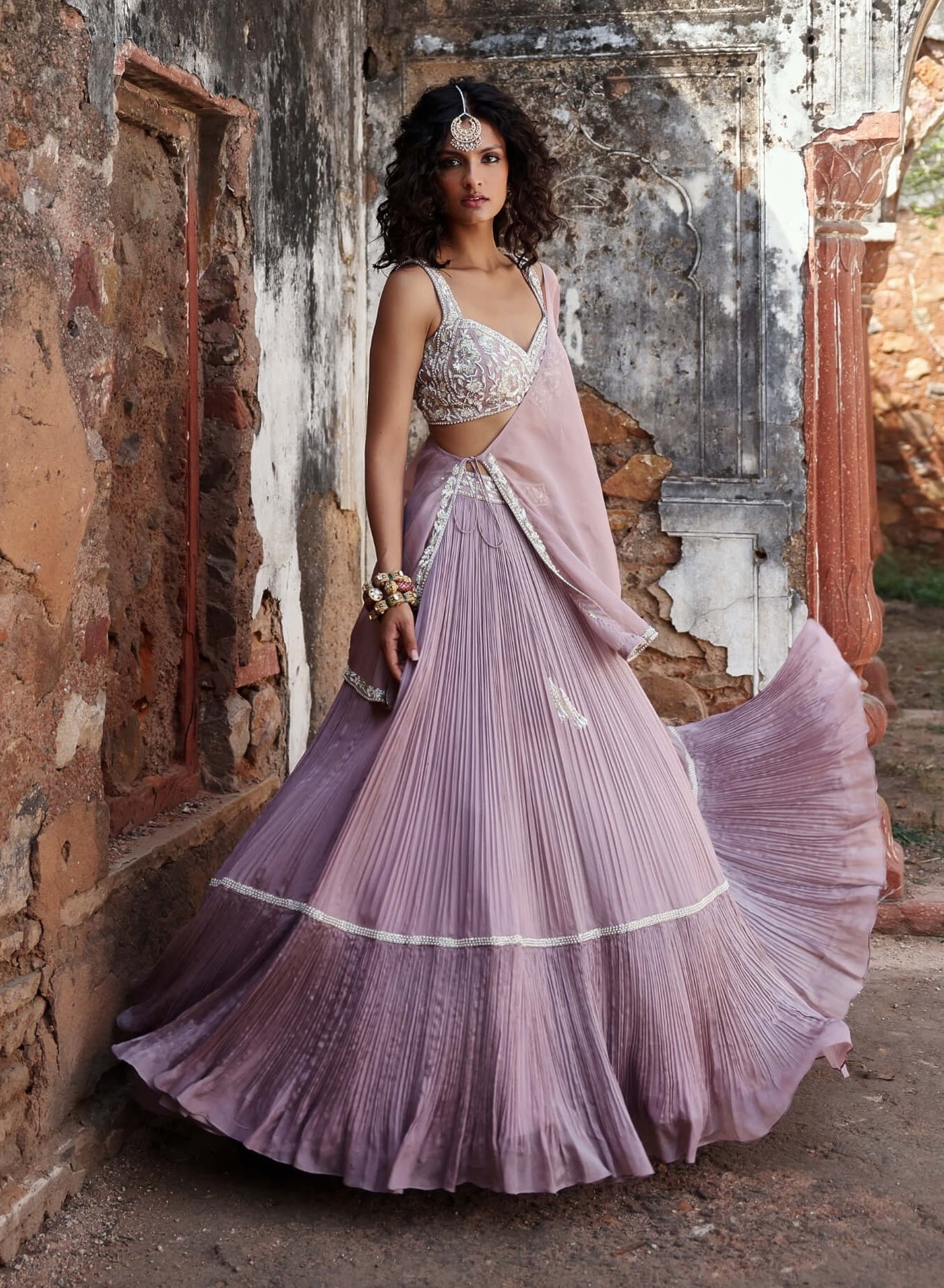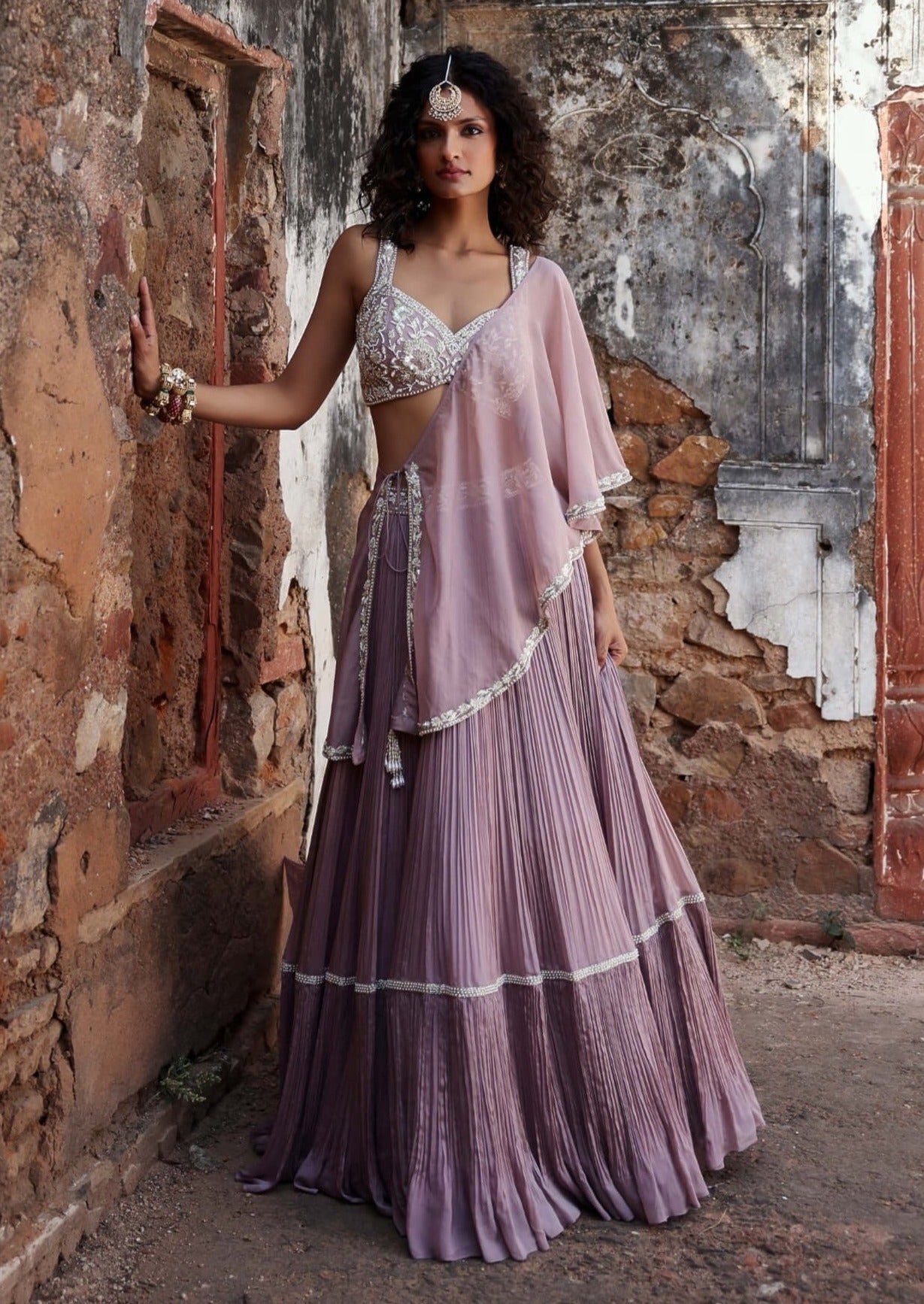 The mirella lilac embellished choli is beautifully paired with a tiered skirt featuring an embellished belt and can-can for added volume. This ensemble is complemented by an eye-catching asymmetrical cape, creating a striking silhouette. The intricate details and rich lilac hue make this outfit perfect for festive occasions, offering a blend of traditional elegance and modern flair.