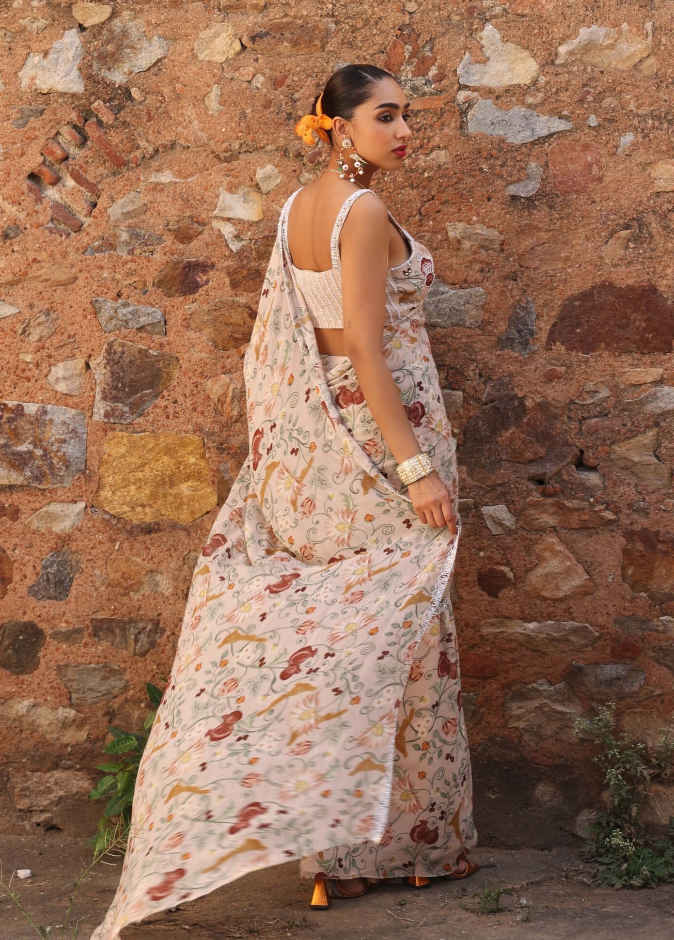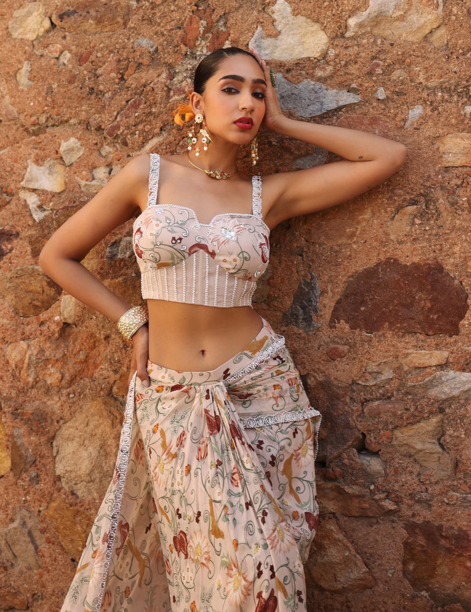 Misha blush pink printed draped skirt sari and choli