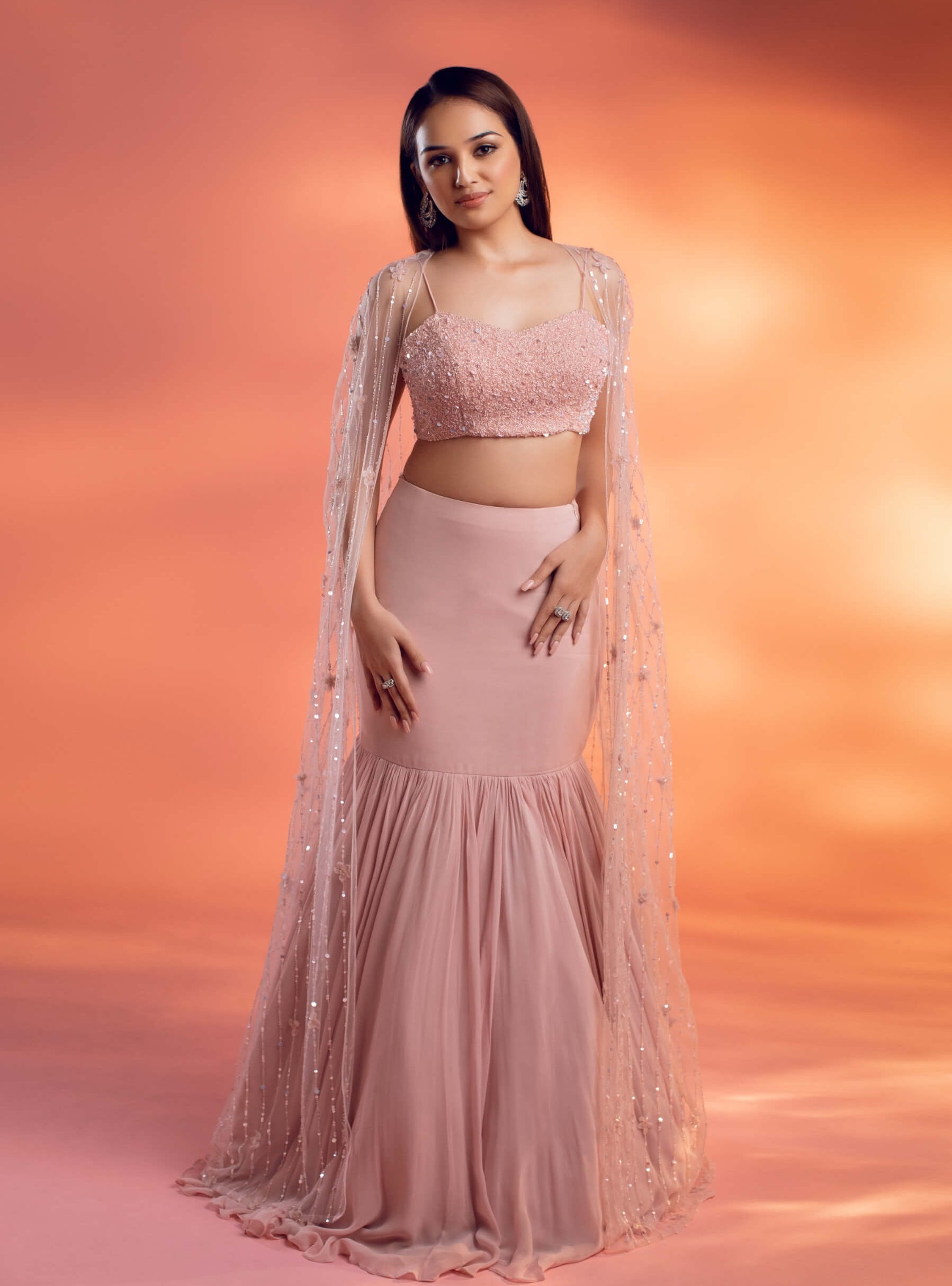 Elevate your elegance with our stunning cape lehenga set, where sophistication meets modern flair. The lehenga features intricate floral embroidery on a net base, embellished with sparkling glass beads and sequins that create a mesmerizing shimmer. Complementing the lehenga is a beautifully designed cape that drapes gracefully, enhancing the ensemble’s ethereal charm. Perfect for those seeking a blend of traditional craftsmanship and contemporary style, this set promises to make a captivating statement at any special event.