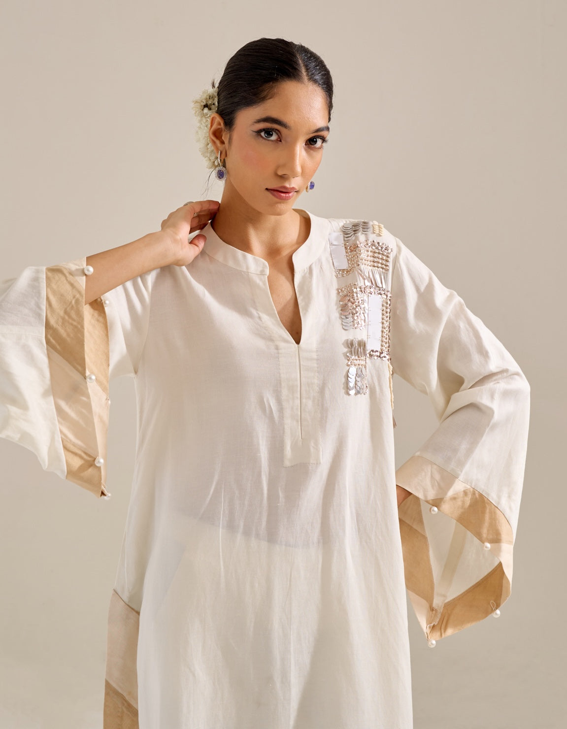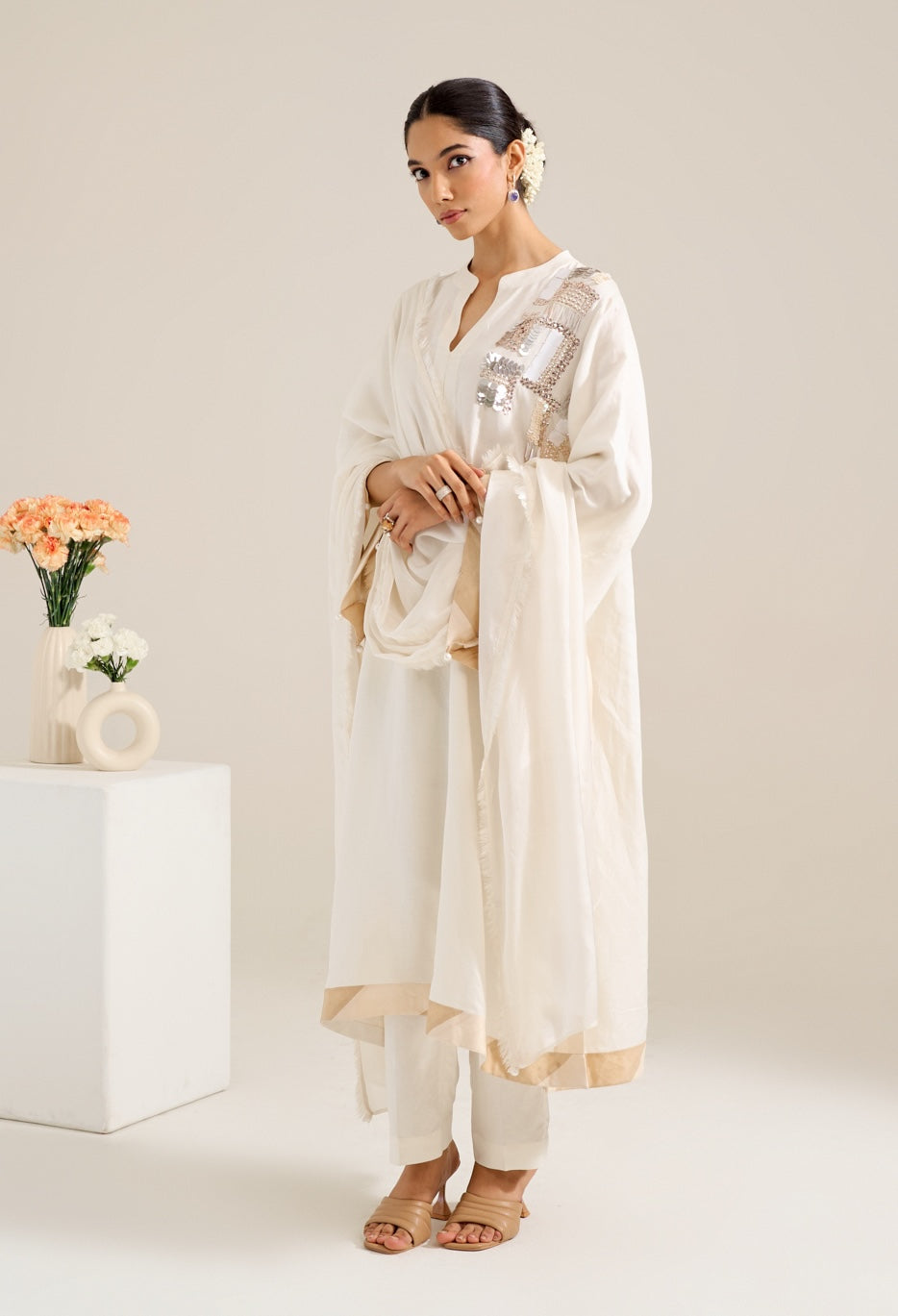 Immerse yourself in timeless elegance with our long kurta, featuring exquisite hand-embellished detailing on the shoulders. This refined design is perfectly complemented by matching pants and a flowing dupatta, creating a complete and sophisticated look. The meticulous craftsmanship and luxurious fabric ensure both comfort and style, making this ensemble ideal for special occasions or formal events. Enhance your wardrobe with this graceful outfit that blends traditional artistry with contemporary fashion.