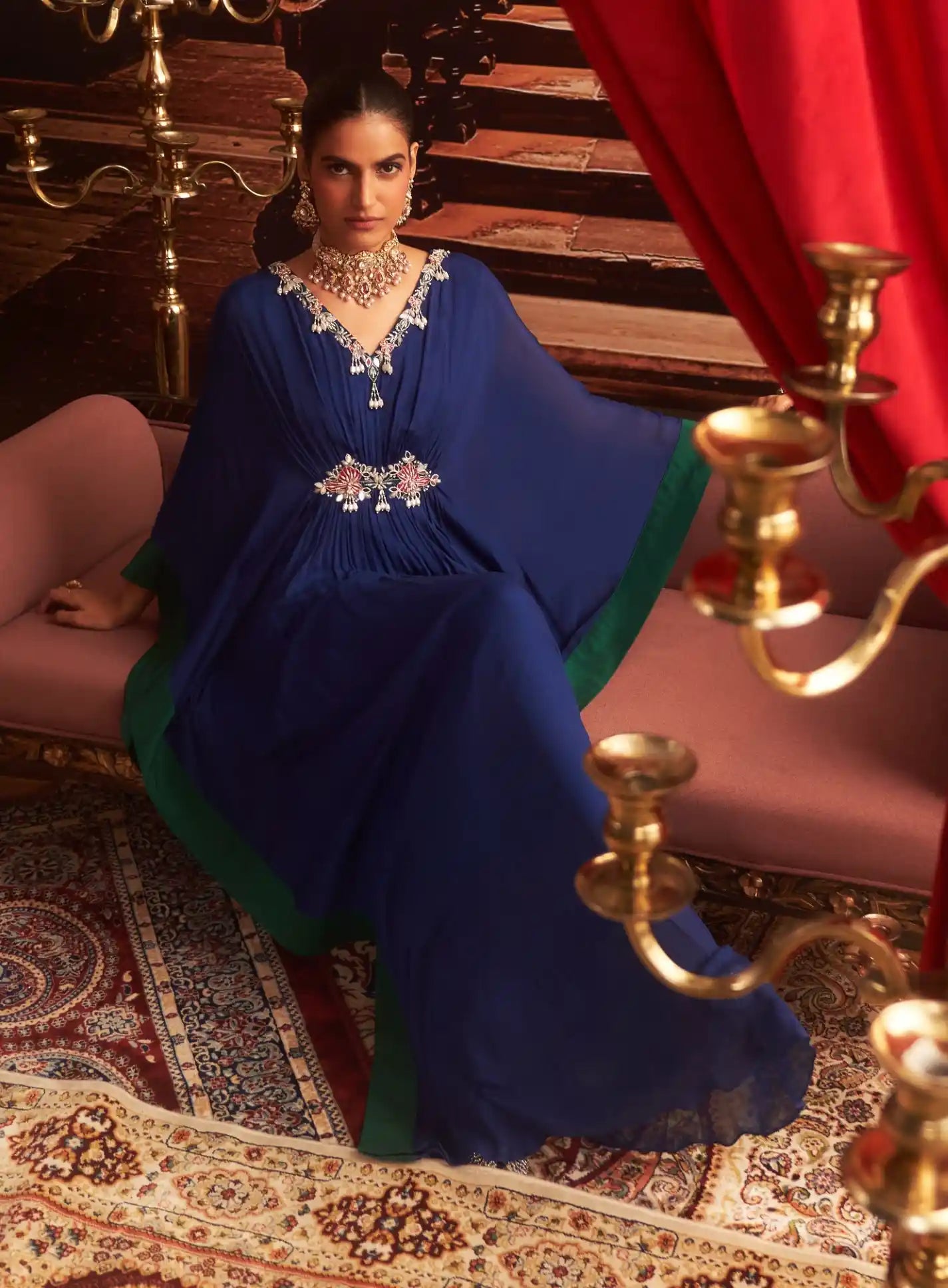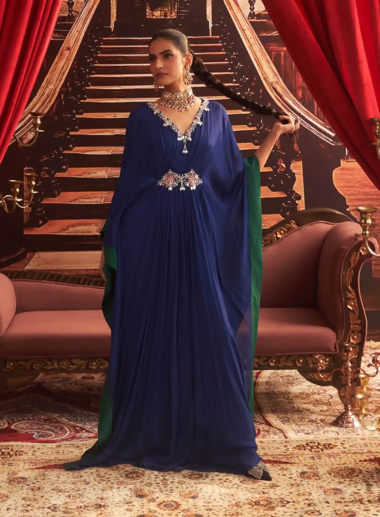 Make a striking impression with our electric blue embellished draped kaftan. This stunning piece features intricate embellishments that catch the light beautifully, adding a touch of luxury to your look. The flowing silhouette drapes elegantly, offering a flattering fit for all body types while ensuring ultimate comfort. Perfect for upscale events, cocktail parties, or evening gatherings, this kaftan combines modern sophistication with a hint of bohemian flair. Effortlessly chic, it’s the perfect choice for those who want to stand out with grace and style.