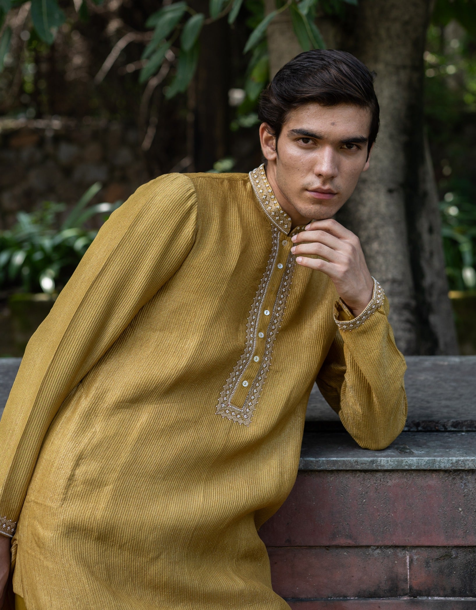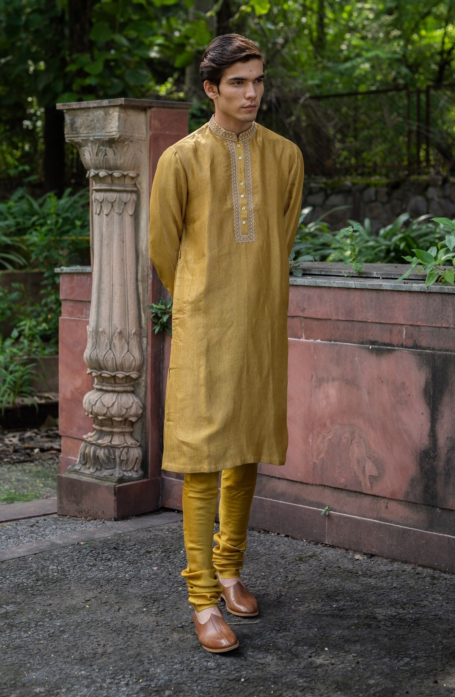 Embrace refined elegance in our molten gold yellow hand-woven kurta, featuring intricate embroidery detailing on the yoke. This luxurious kurta is paired with matching chudi pants, creating a sophisticated and cohesive ensemble. Perfect for special occasions, it combines rich craftsmanship with a vibrant hue for a distinguished and stylish appearance.