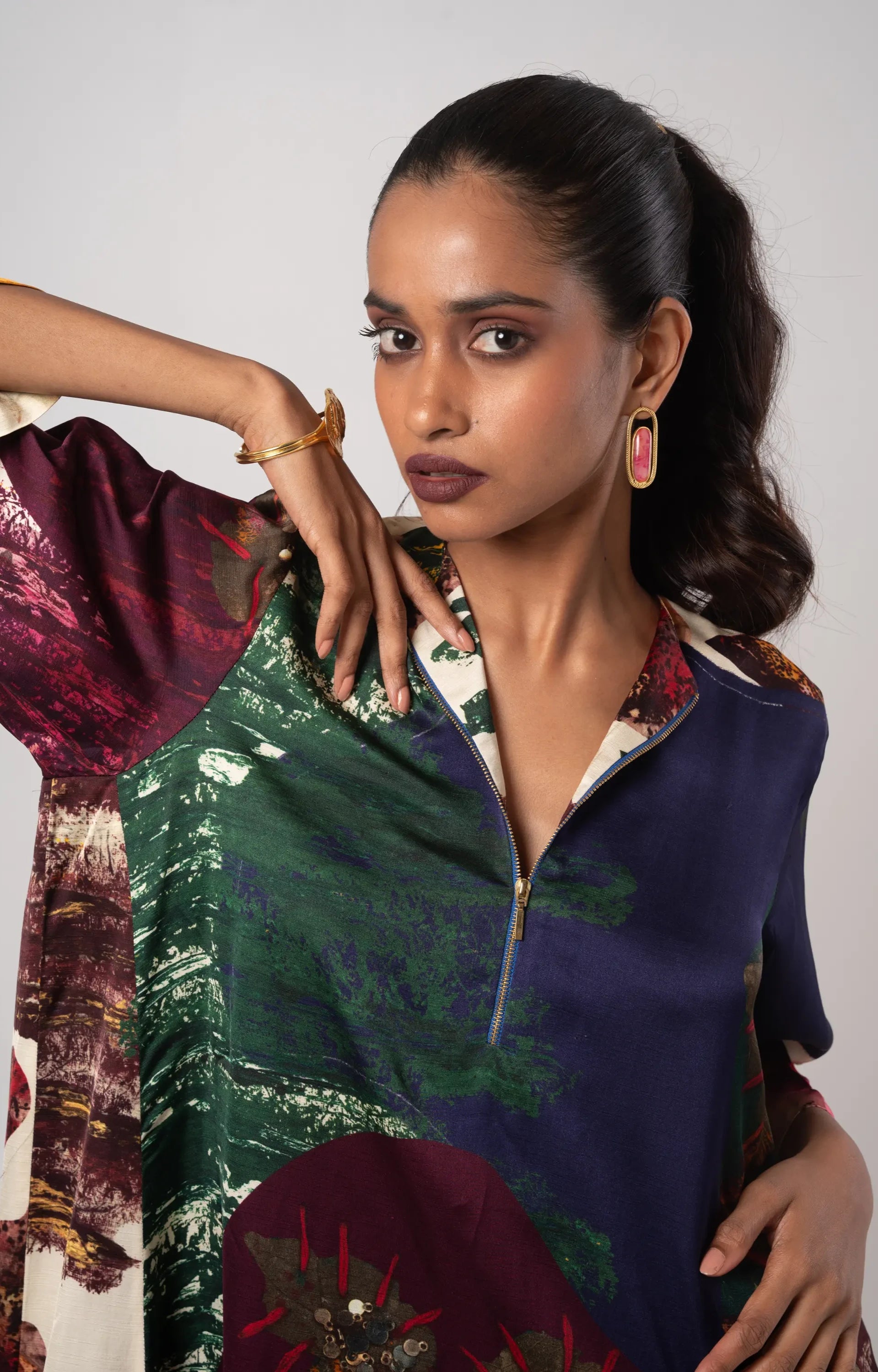 This contemporary kurta features an asymmetrical hemline with elegant kalis on the side, adding movement and structure to the design. The front zip detail provides a modern, functional touch, allowing for easy wear while enhancing the kurta's sleek silhouette. Paired with solid-coloured straight-leg trousers, this ensemble offers a balanced and sophisticated look, ideal for both formal and casual occasions. The trousers add a clean, streamlined finish, making this set a versatile choice for a variety of events, from office wear to evening outings.