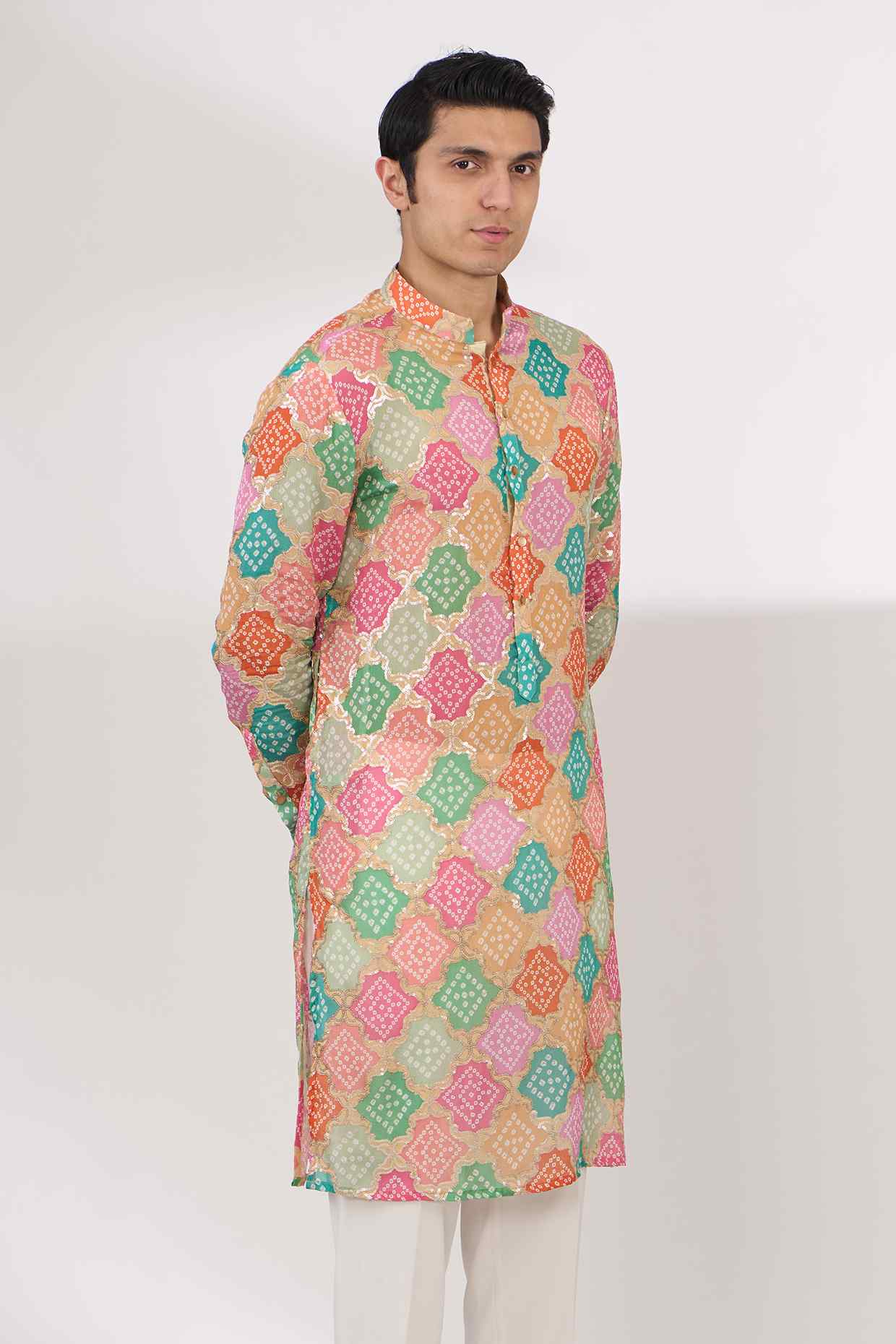 Fabric: Multicolor bandhini with gold sequin unlined kurta with cotton silk pant