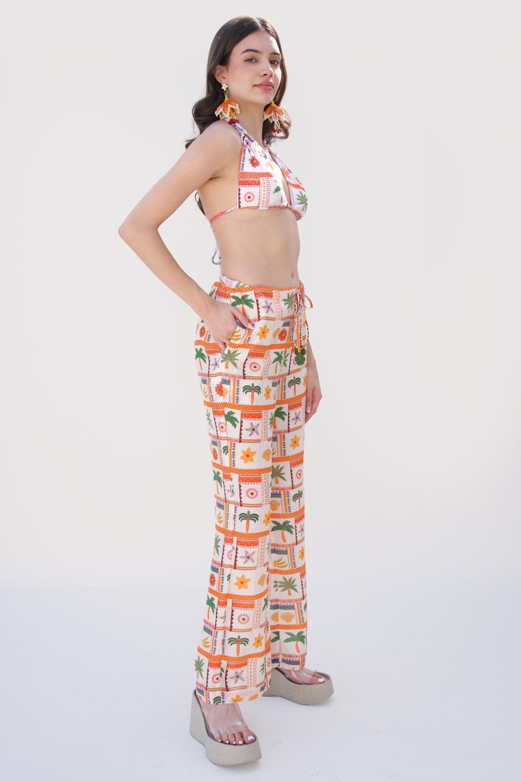The Multicolor Bonnes Vacances El Ojo Pant brings artful expression to everyday comfort. Crafted from soft, breathable fabric, it features the signature El Ojo print—a bold mix of colors and motifs that celebrate movement, culture, and individuality. With a relaxed, flowy silhouette, these pants are perfect for resort lounging, creative workdays, or vibrant city strolls. Pair them with the matching top, a crisp white shirt, or a fitted tank for an effortlessly elevated look. Eye-catching yet wearable, they’re a true statement piece for the modern traveler.