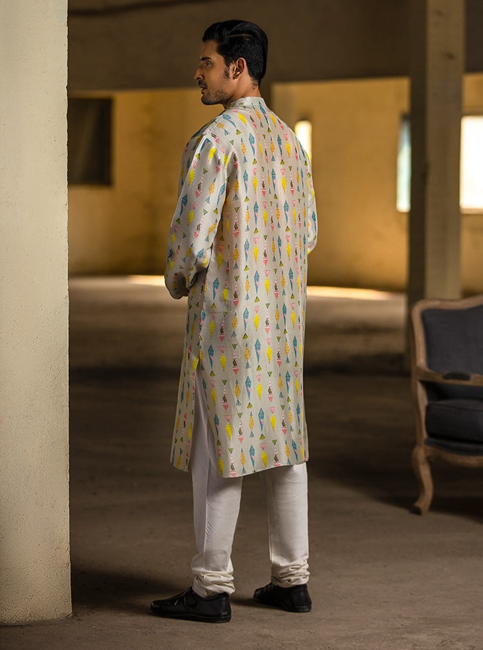Paired with an off-white cotton silk churidar, this ensemble offers a perfect blend of style and comfort. The churidar complements the kurta effortlessly, creating a polished silhouette suitable for festive celebrations or casual outings. Whether you choose to accessorize with traditional footwear or keep it relaxed, this outfit is a versatile choice that’s sure to turn heads wherever you go.