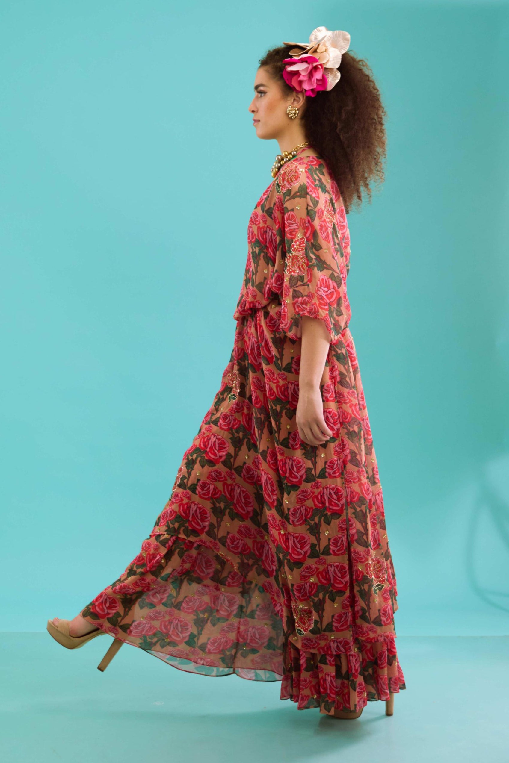 This multicolor floral printed sharara set, featuring intricate handwork detailing, is a stunning blend of vibrant patterns and exquisite craftsmanship. The lively floral print adds a cheerful, fresh appeal, while the handwork detailing enhances the overall elegance of the ensemble, creating a sophisticated, eye-catching look. Perfect for festive occasions, weddings, or special celebrations, this sharara set combines traditional charm with contemporary flair. The flowy sharara ensures comfort and movement, making it a versatile and stylish choice for any event.